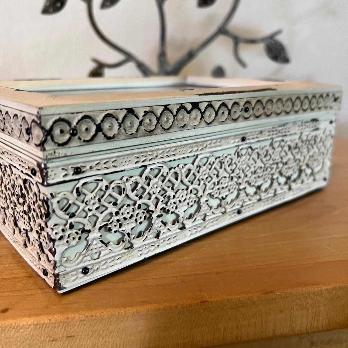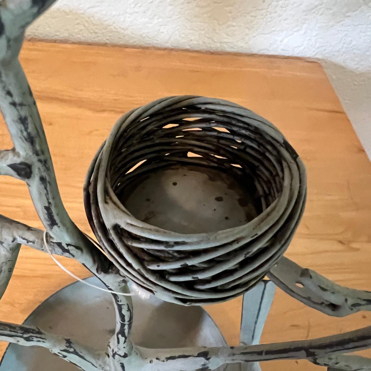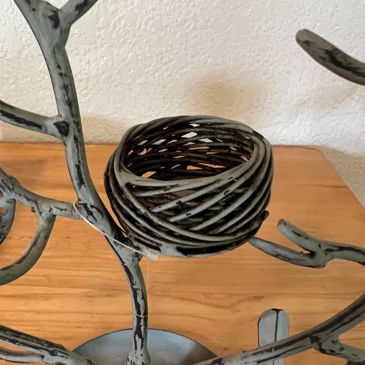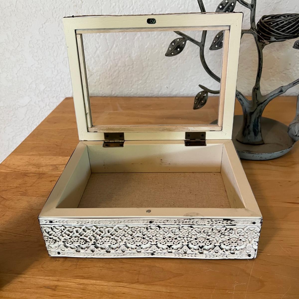 These two distressed metal items includes a cream colored metal trinket box with glass top and a bird themed jewelry stand/holder that measures 5.5” D x 15” H.