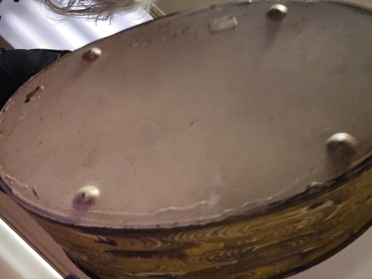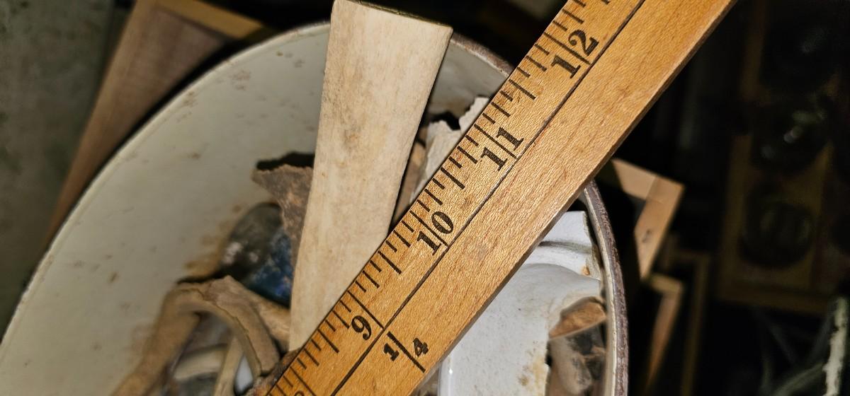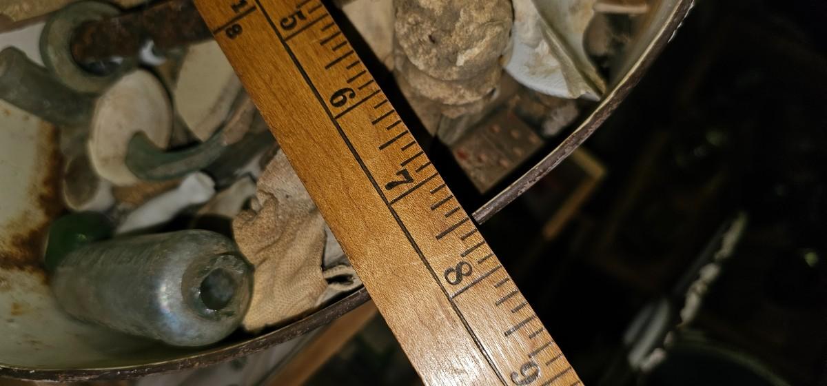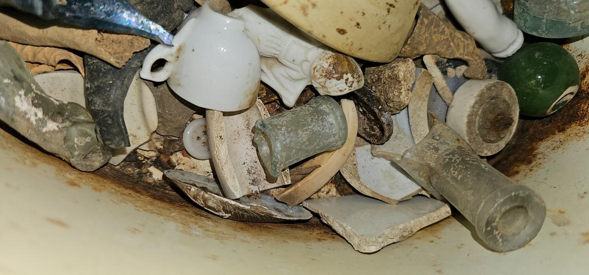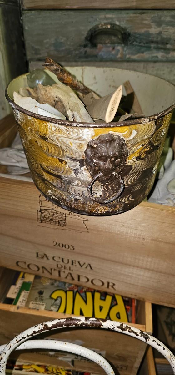 Metal bucket with lion's head handles full of stick, stones and glass and bones