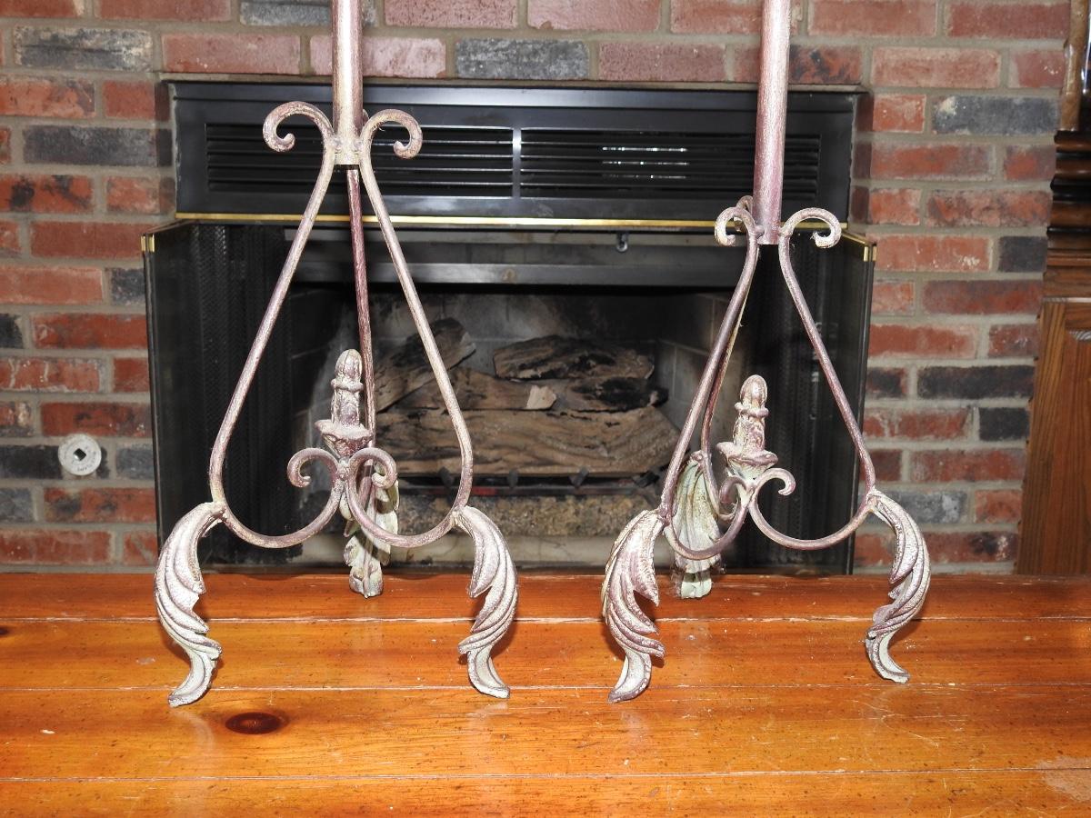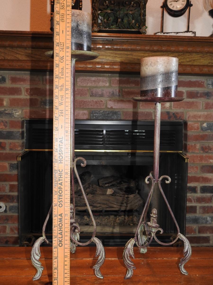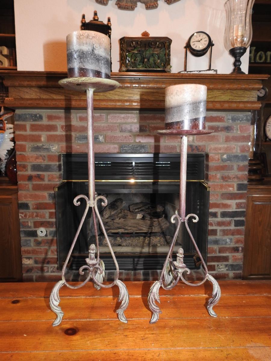 Beautiful pair of metal candle stick holders with candles in great used condition