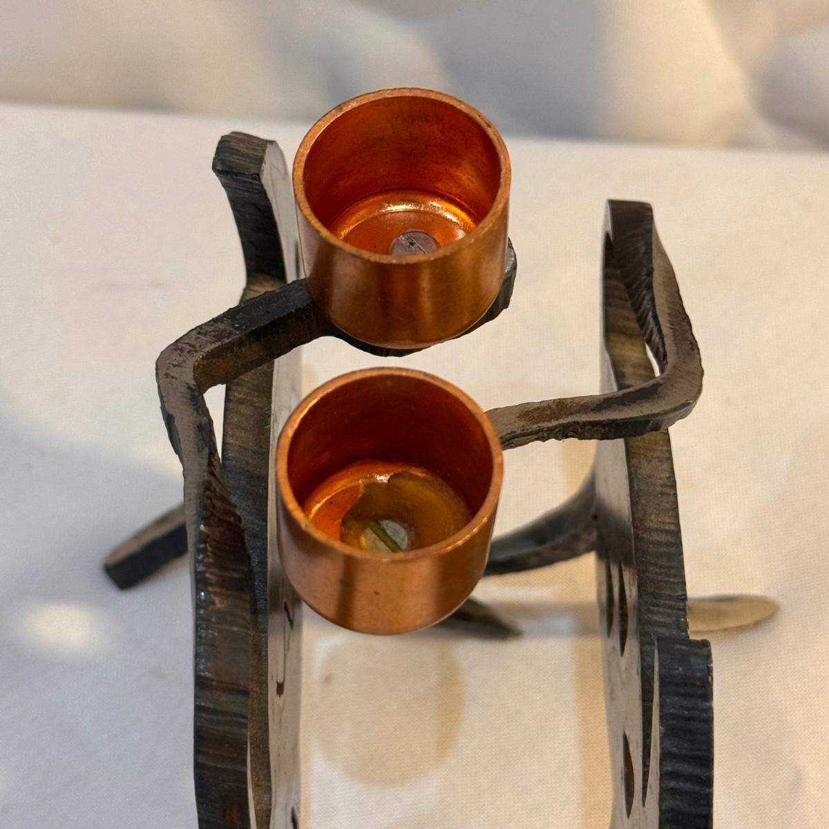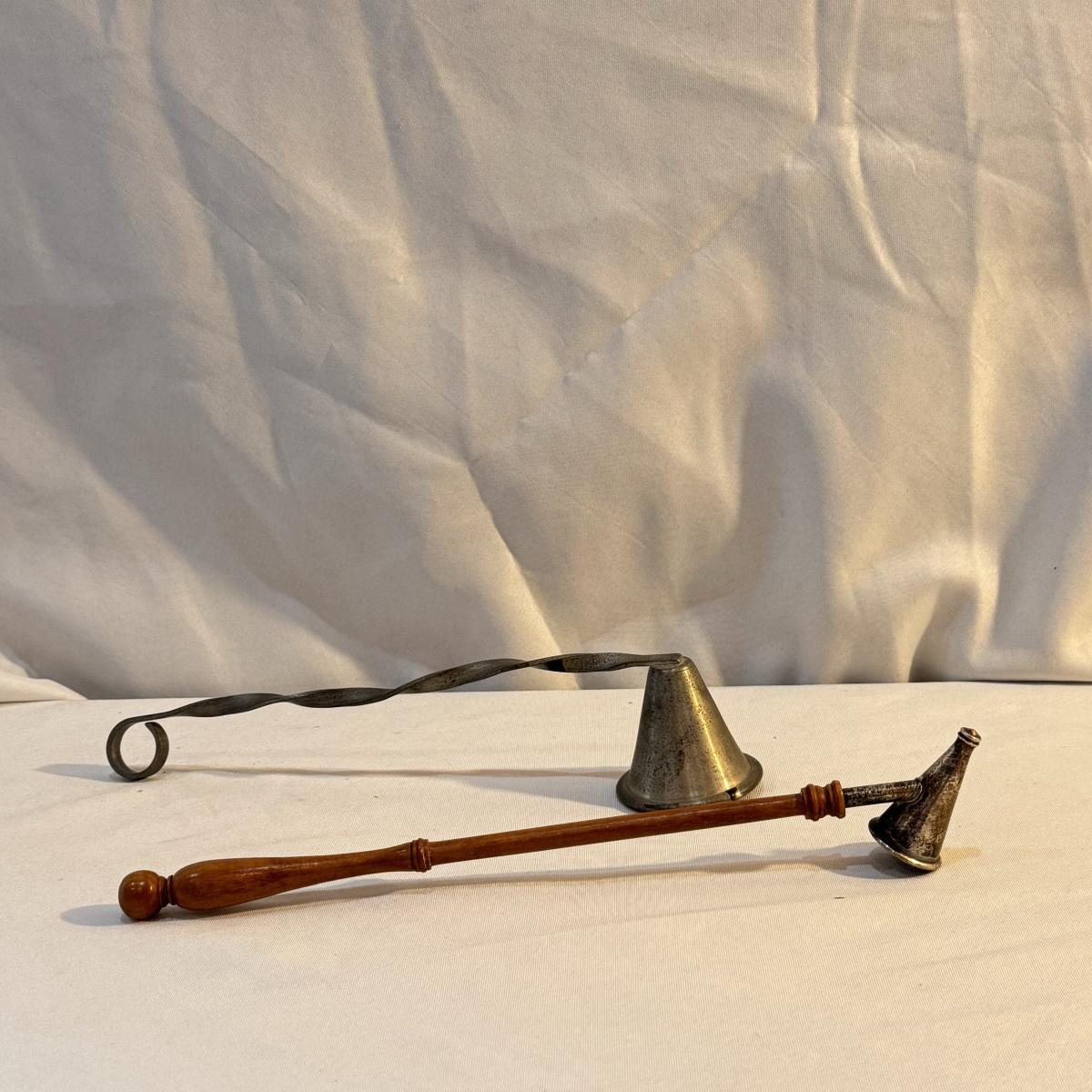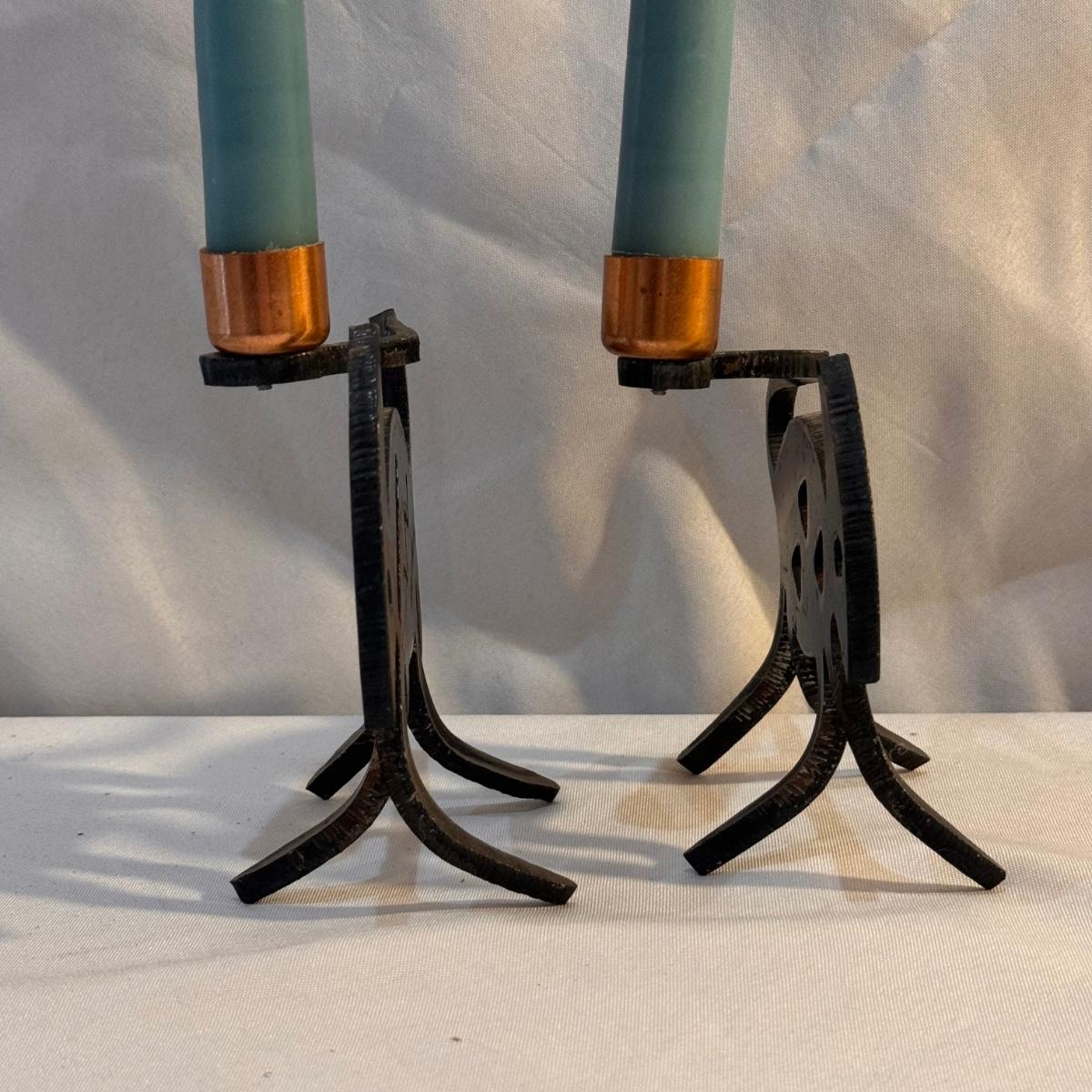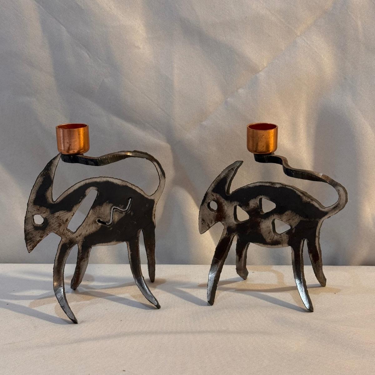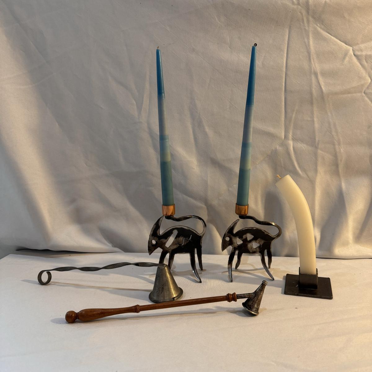 This lot includes two metal creature candleholders, two tall light blue candles, one metal square candleholder with a white curved candle, and two candle snuffers. One of the candle snuffers is all metal and the other is metal with a wooden handle. The metal creature candleholders individually measure 4.5” x 2” x 5”H. Shipping available.
