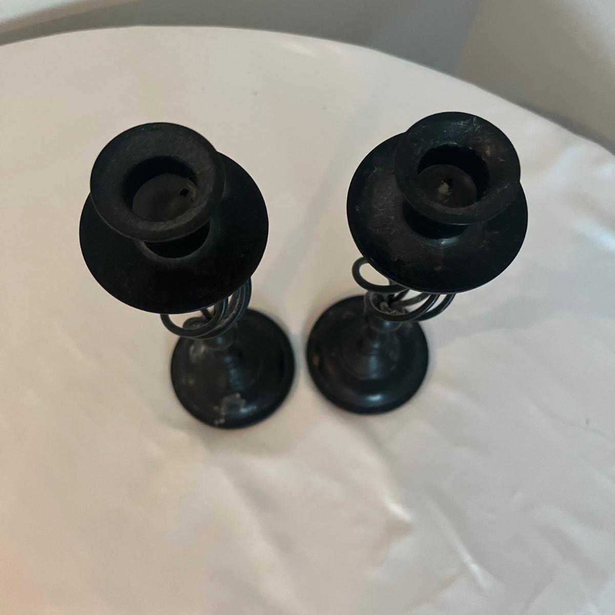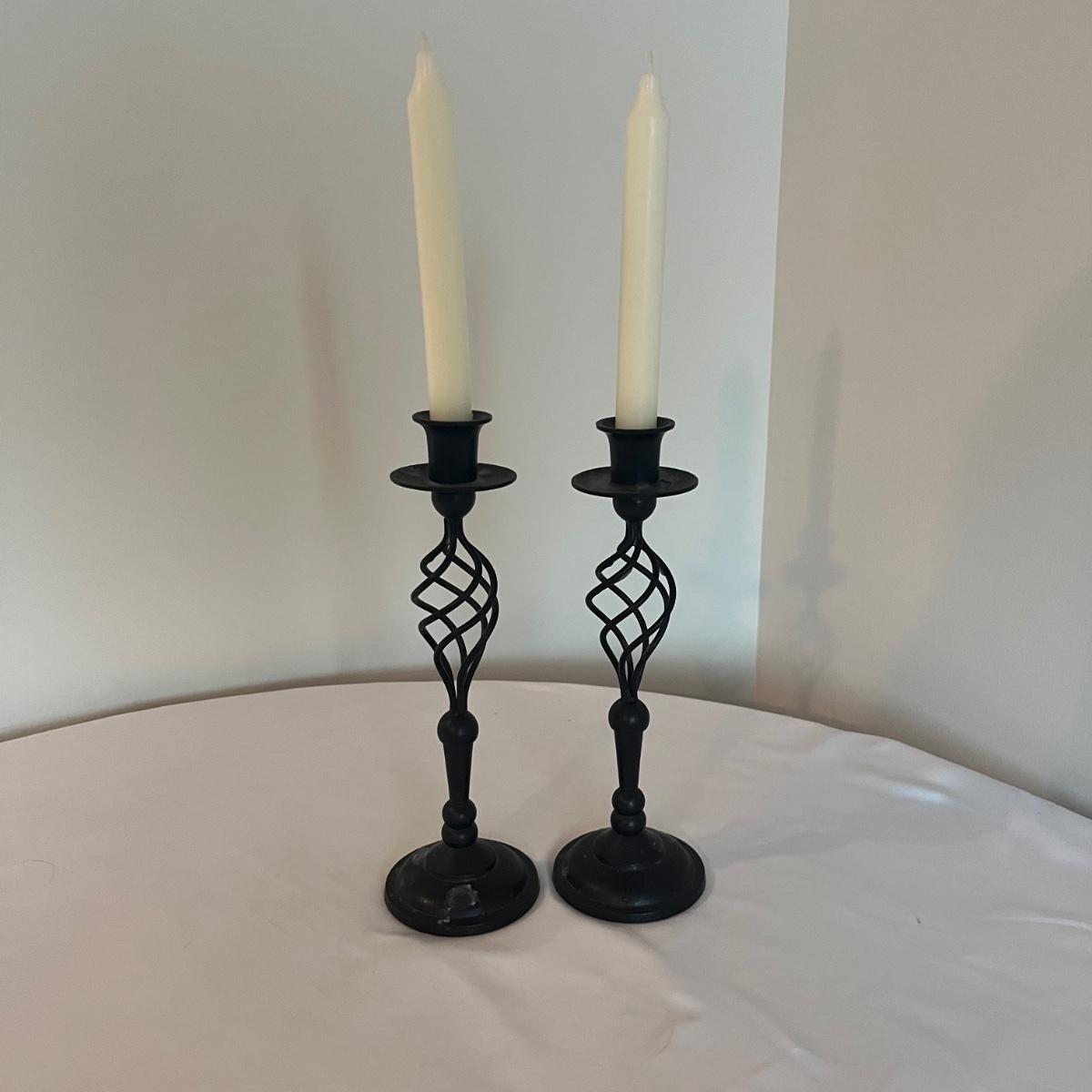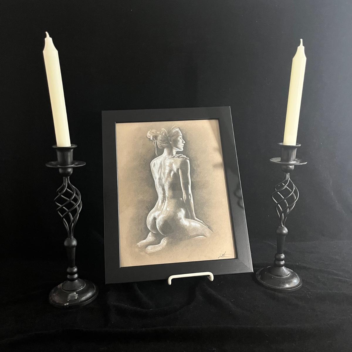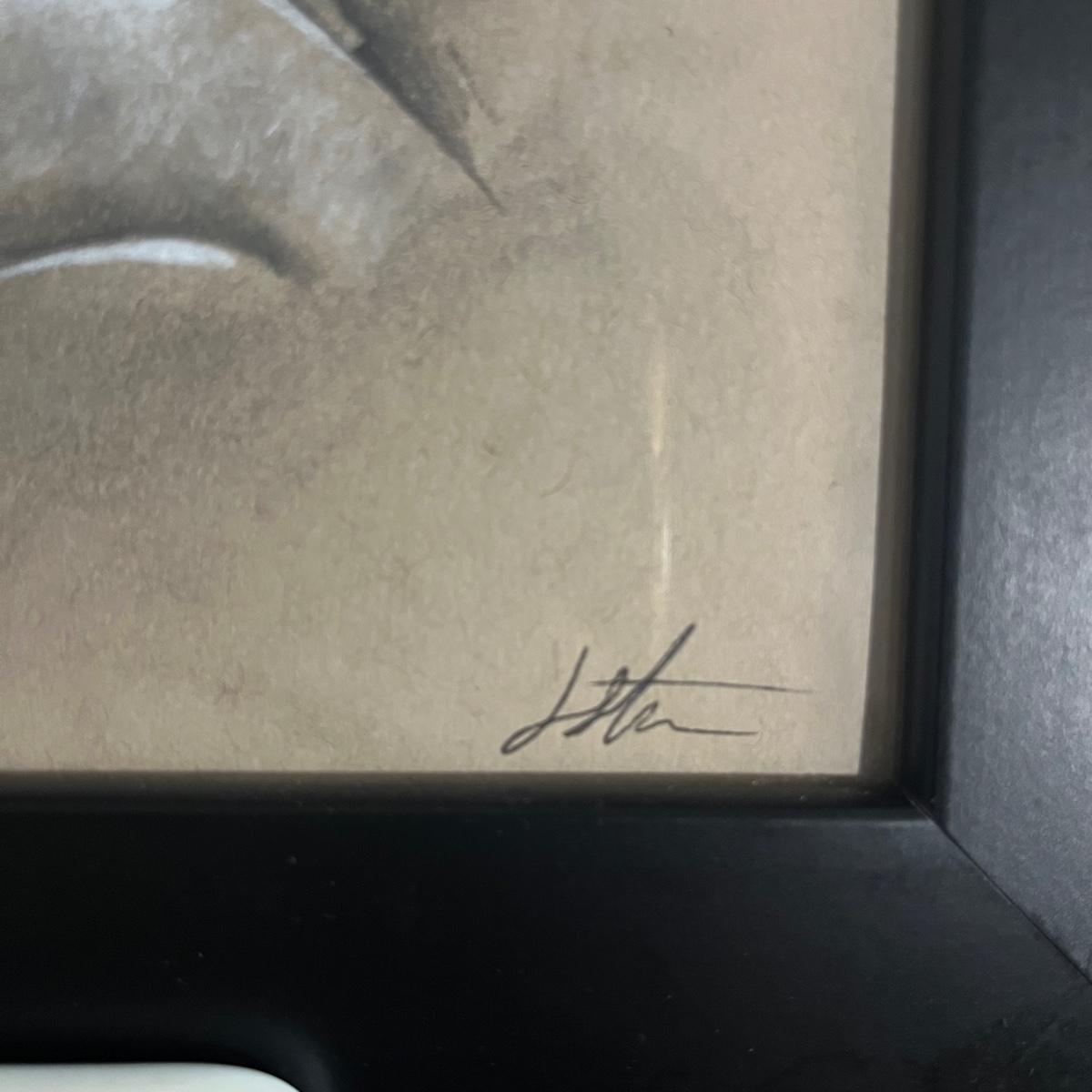 Lot includes two metal candlesticks with candles. Also includes a framed piece of art under glass that appears to be a pencil drawing, but we cannot guarantee the medium. It is signed. Frame is a black resin like material and measures 11” x 14”.
