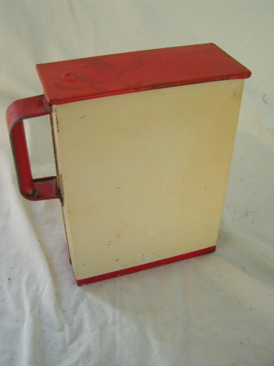 Metal canister w/sliding metal lid, folded metal handle. Likely c.1950s.