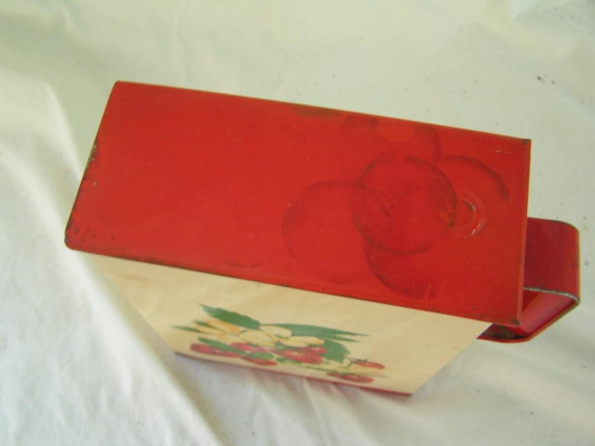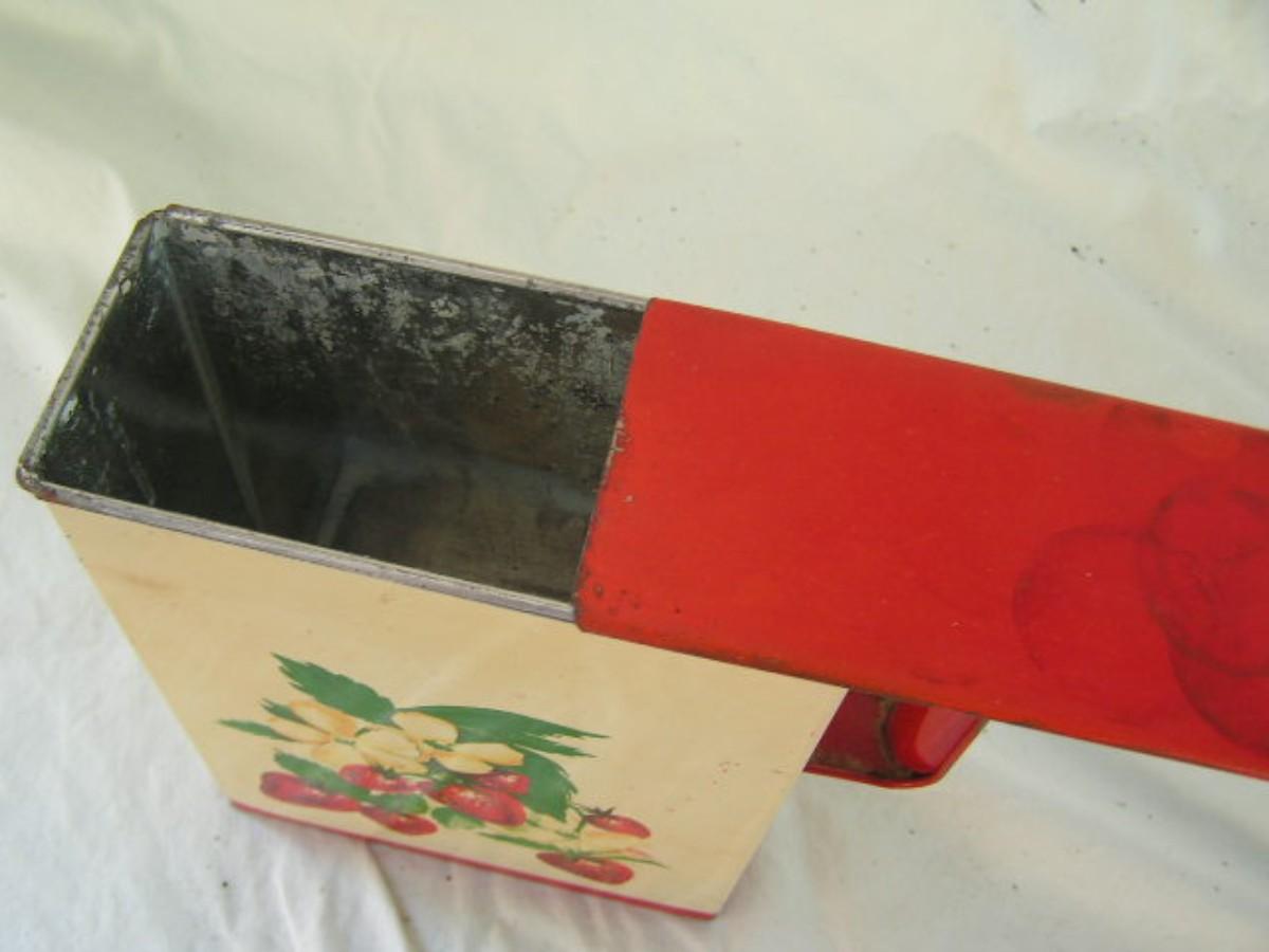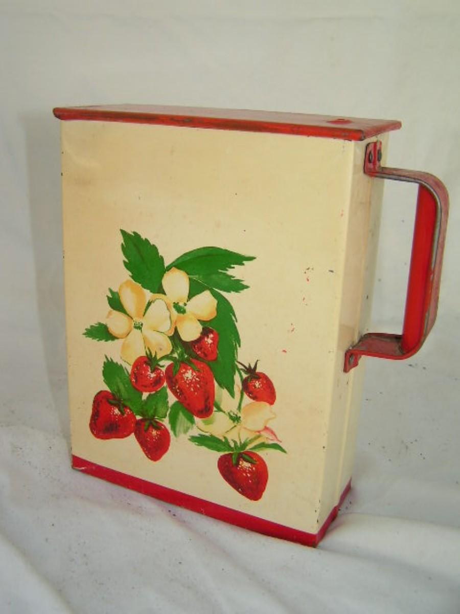 More great vintage items like this elsewhere in this sale. Metal canister w/sliding metal lid and folded metal handle. Likely c.1950s. Strawberries. Tinned steel construction. About 8-1/2" tall x 6-1/4" wide x 2-3/4" thick w/o handle. Very nice condition for age. All original.