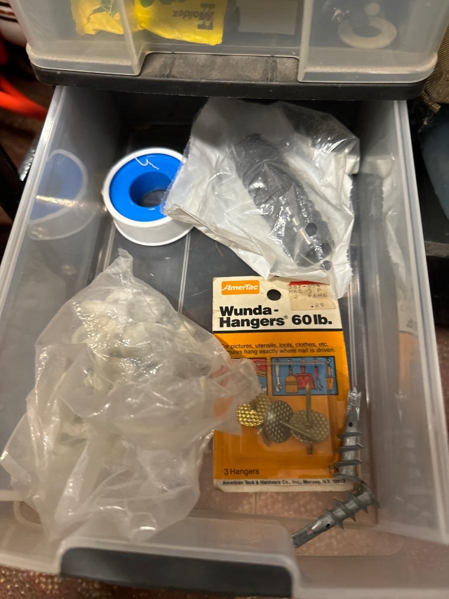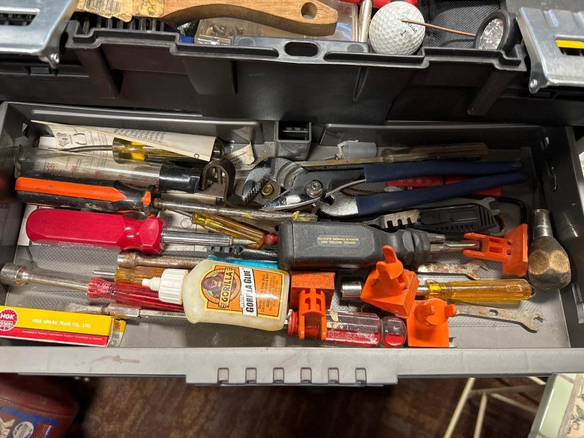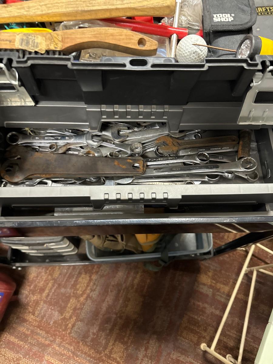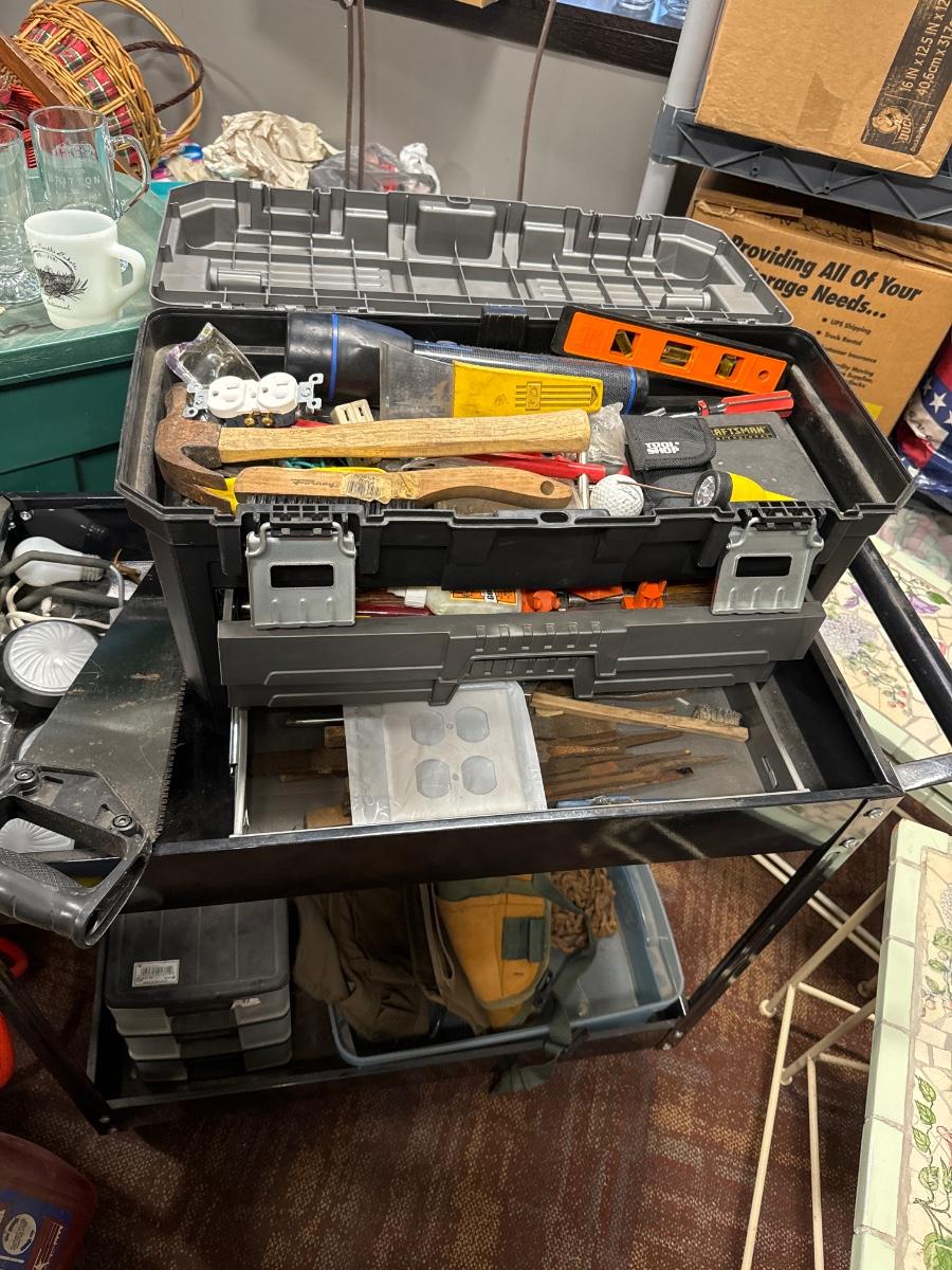 Includes many tools, hardware tool bags, metal cart and 3 drawer plastic storage unit.