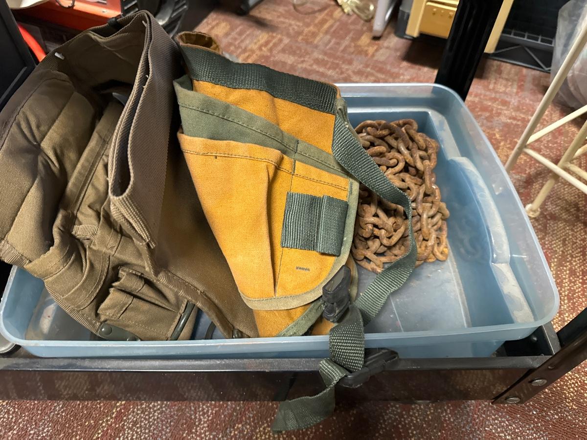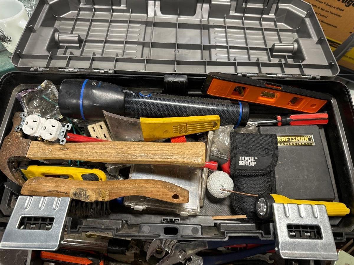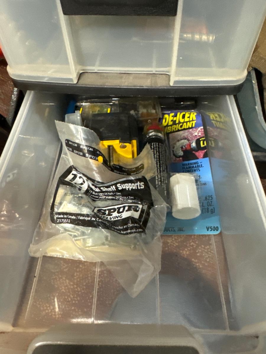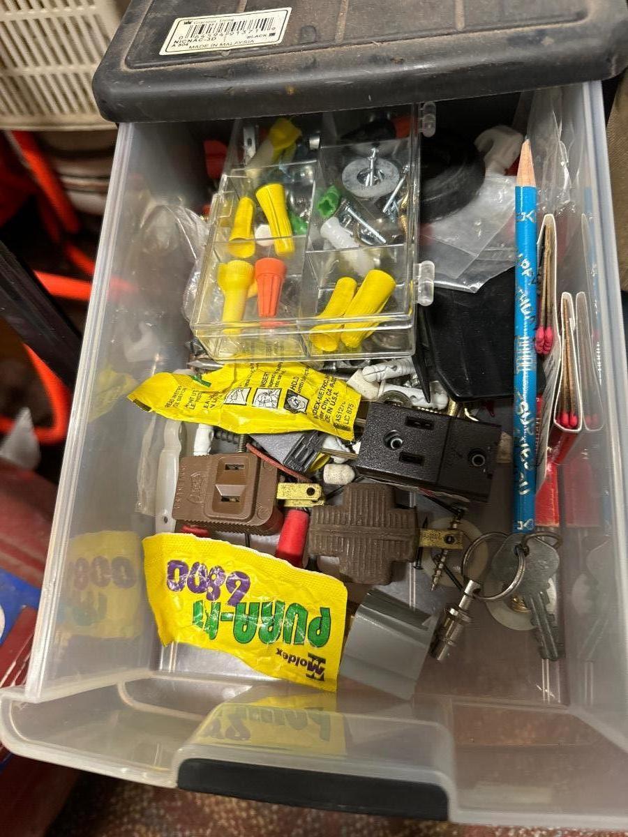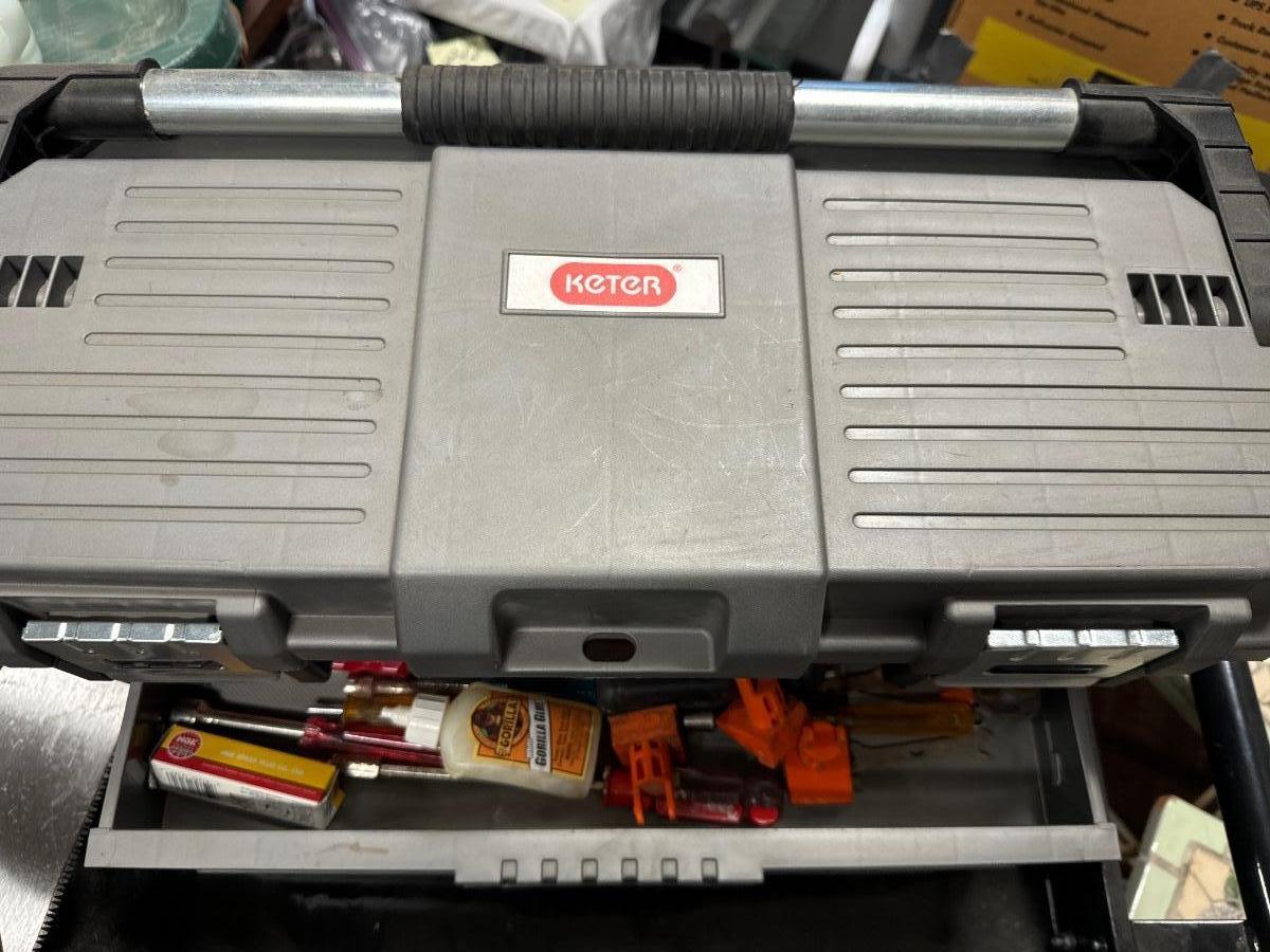 Includes many tools, hardware tool bags, metal cart and 3 drawer plastic storage unit.
