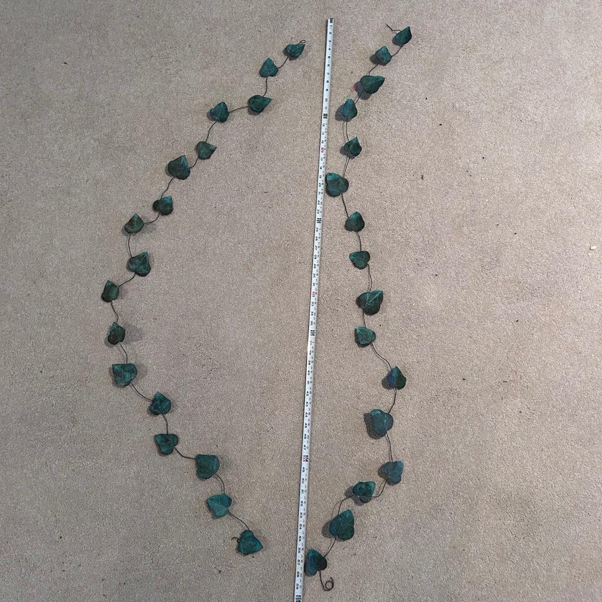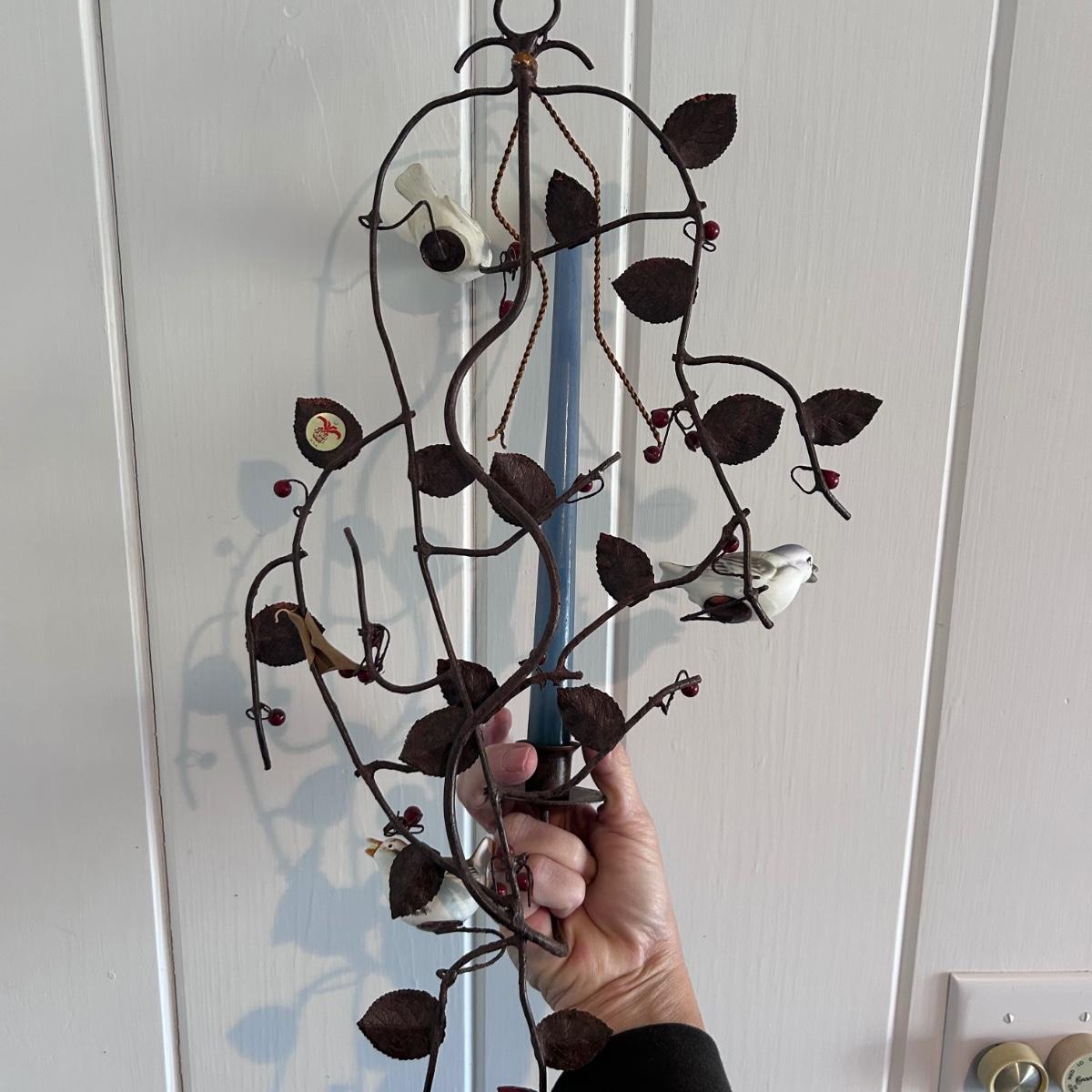 Lot contains two metal candle holders of leaves, berries and twigs. Each one has three ceramic or porcelain birds attached. There are also two metal leaf garland pieces that measure approx. 60”. The candle holders each measure approx. 12” x 4” x 21"H. Local pick up only.
