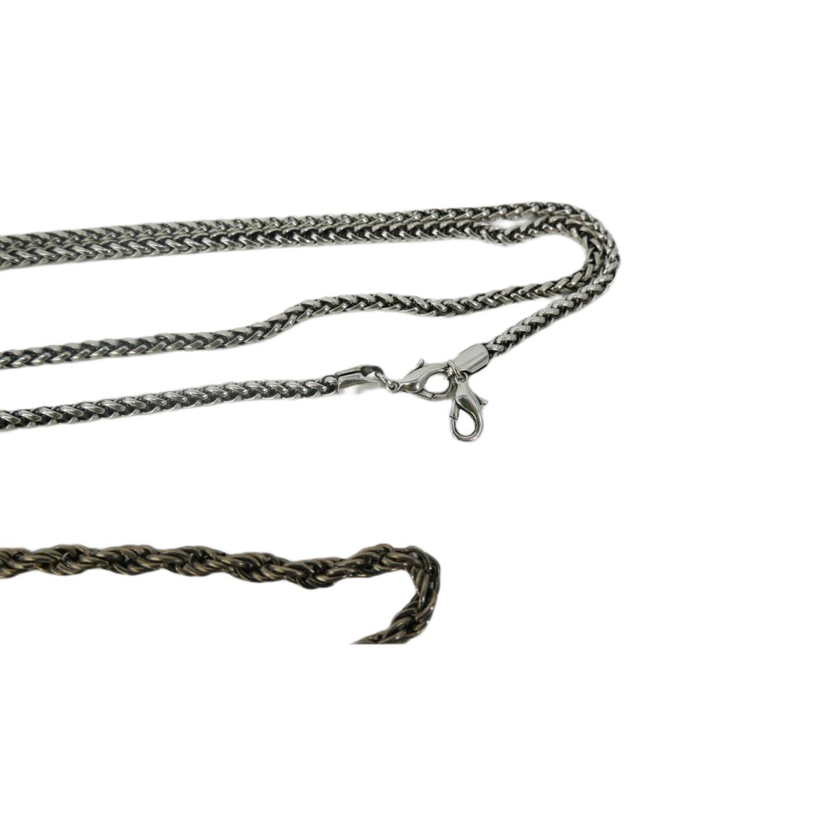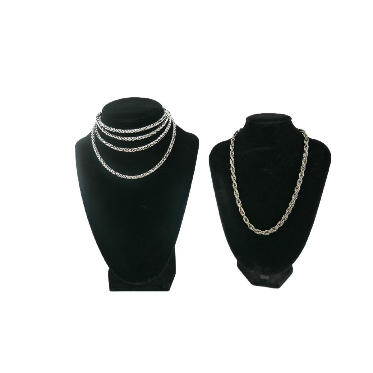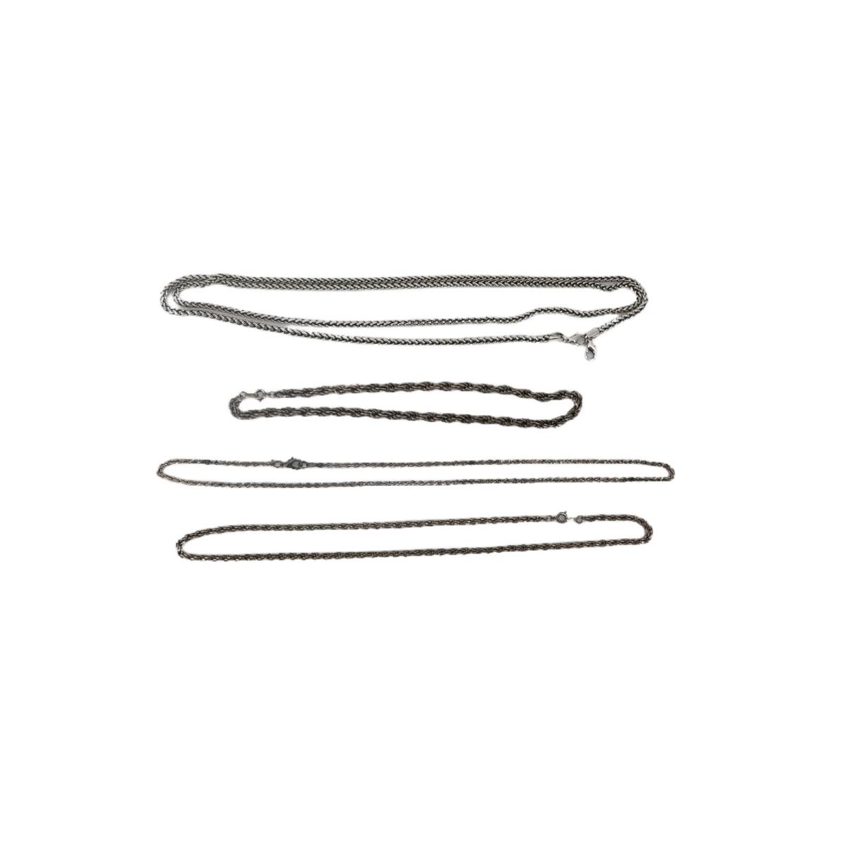 Various metal chain necklaces. Longest corded chain measures 47" long. One braided chain measures 15". Second braided chain measures 22" long. Third braided chain measures 20" and clasp does not close. In overall good condition, some could use some polishing. Weight of lot is 4 oz. (J10)