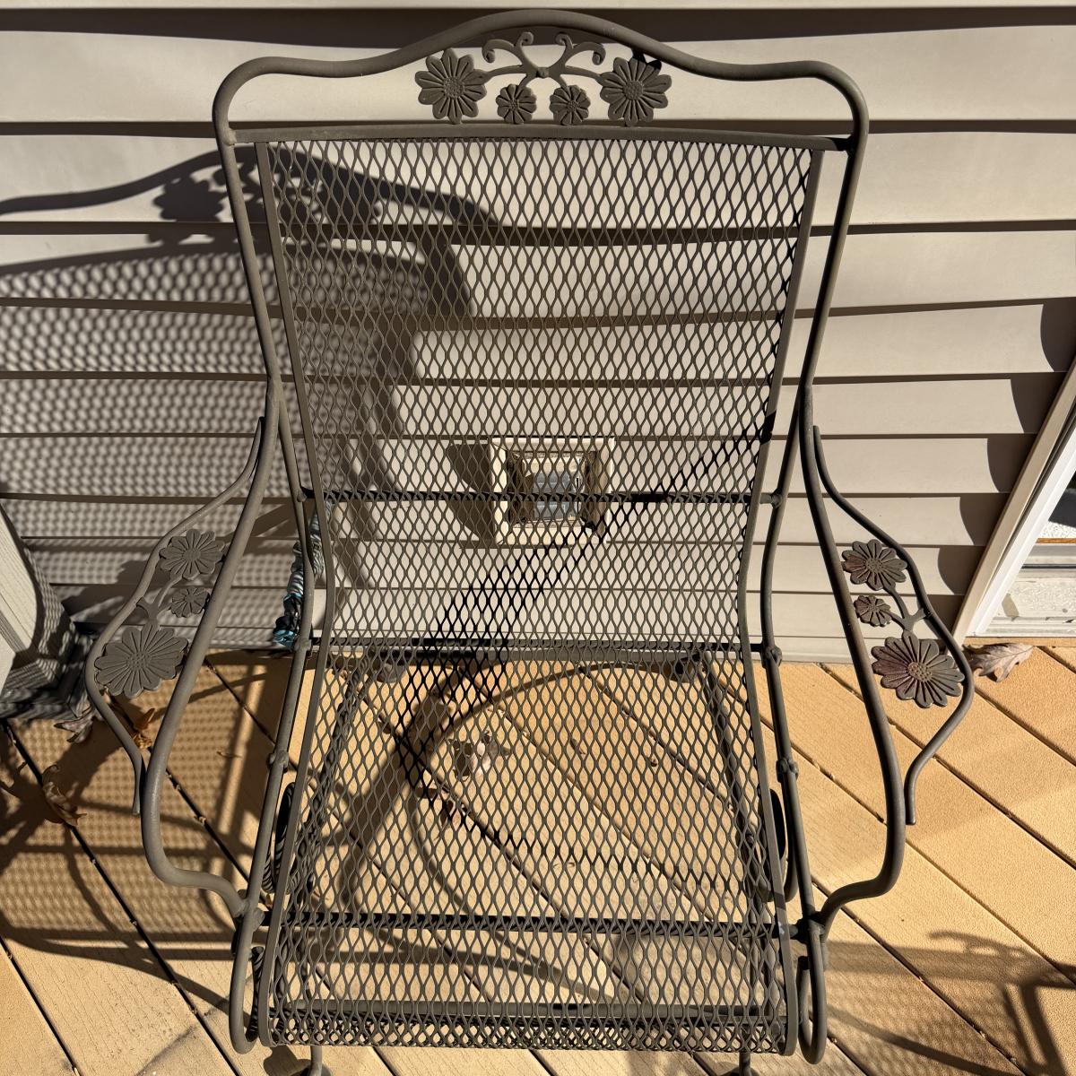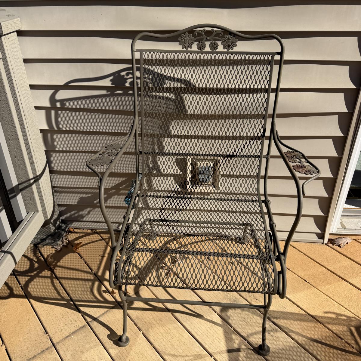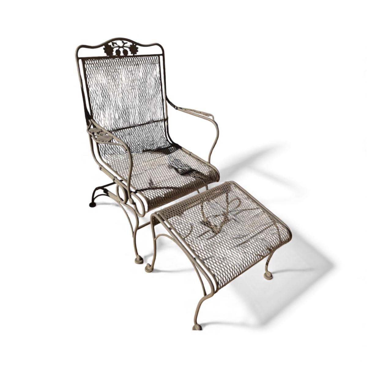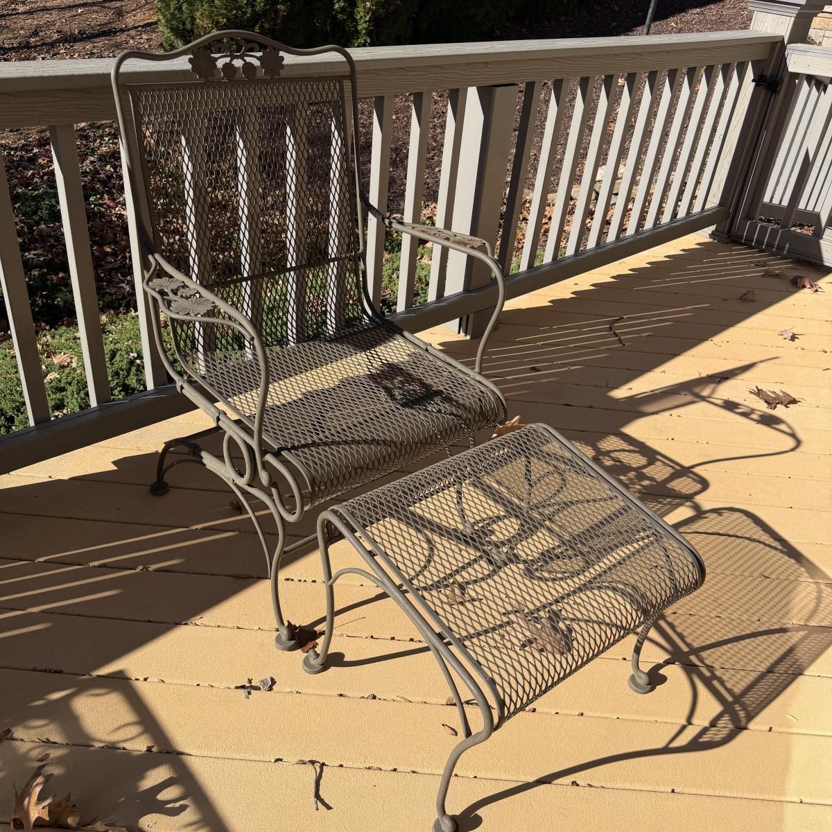 Lot includes a metal spring rocker chair with metal ottoman. Chair measures 27” x 24” x 38”H with a 17” seat height and ottoman measures 20” x 17” x 15”H.