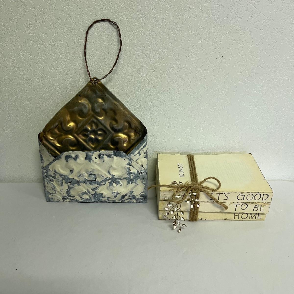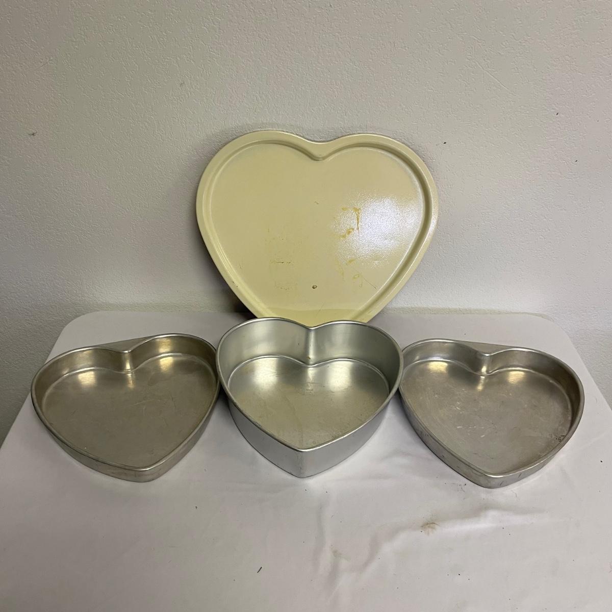 Lot includes a metal chair that converts into a stool, glass and metal table lamp with two shades, three heart shaped cake pans, metal wall hanging and three decorative books. Chair measures 15.5” x 17” x 32” with a seat height of 19”.