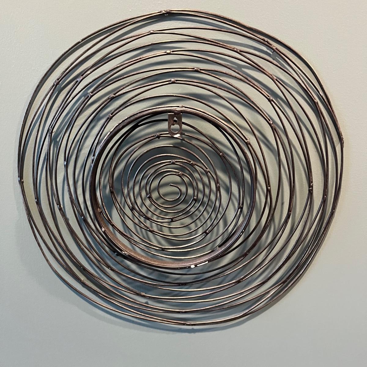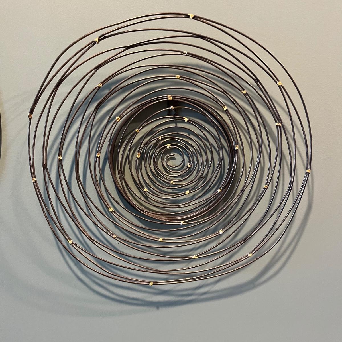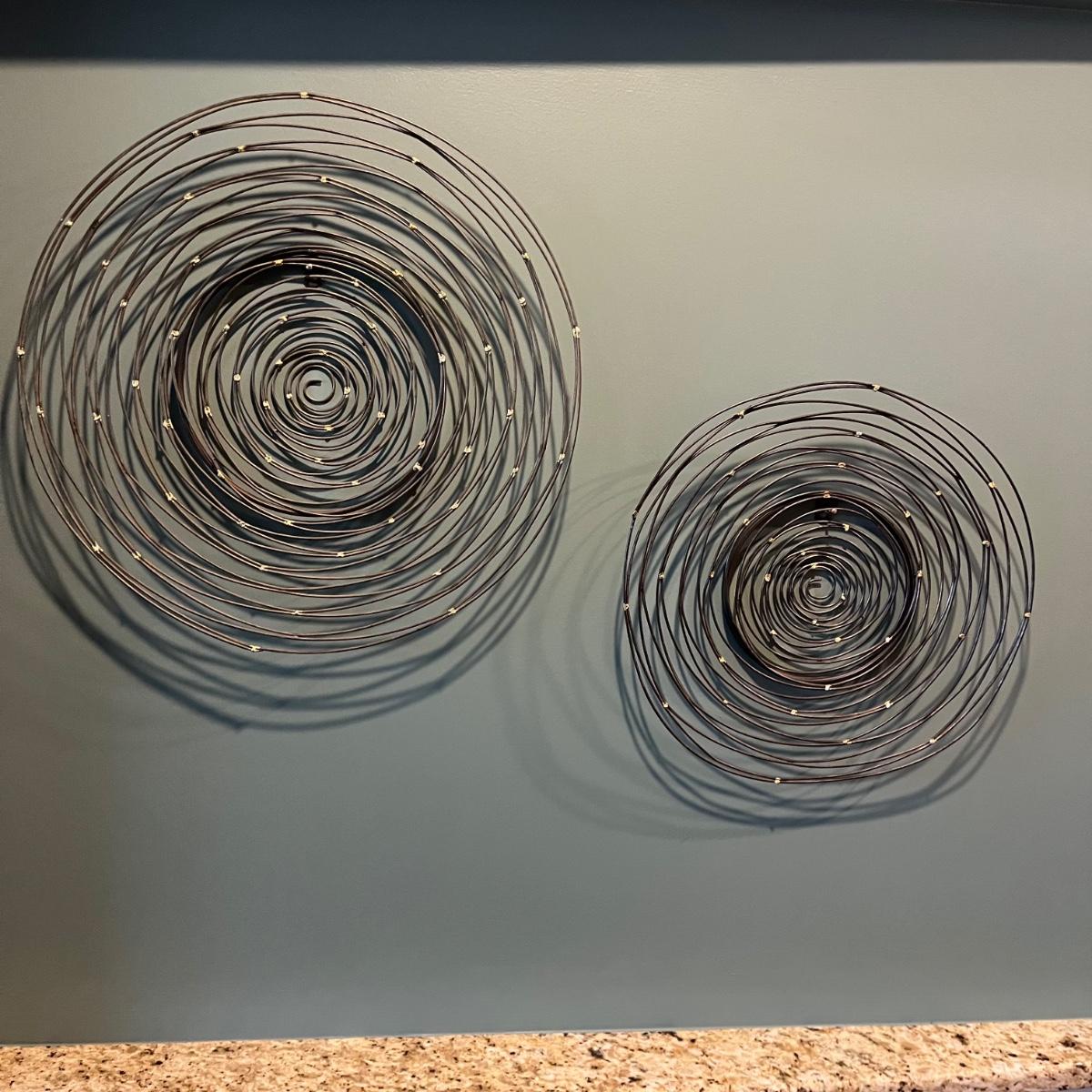 Lot includes two metal pieces of wall art that have brass colored welds. One measures 20”D and one measures 16”D. Both have wall mounts.