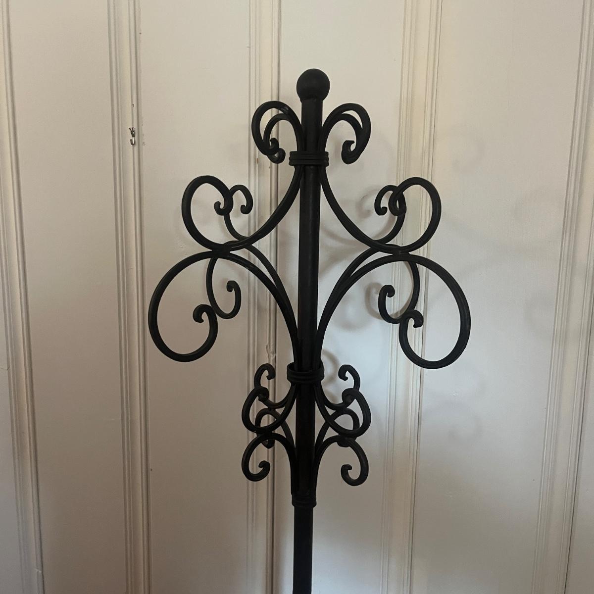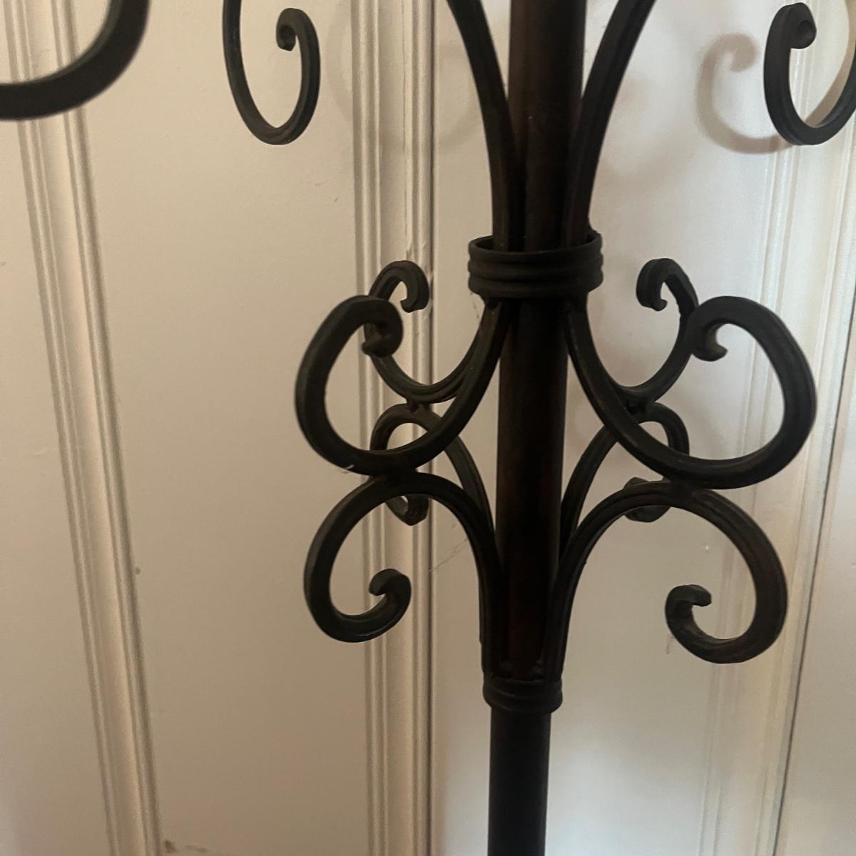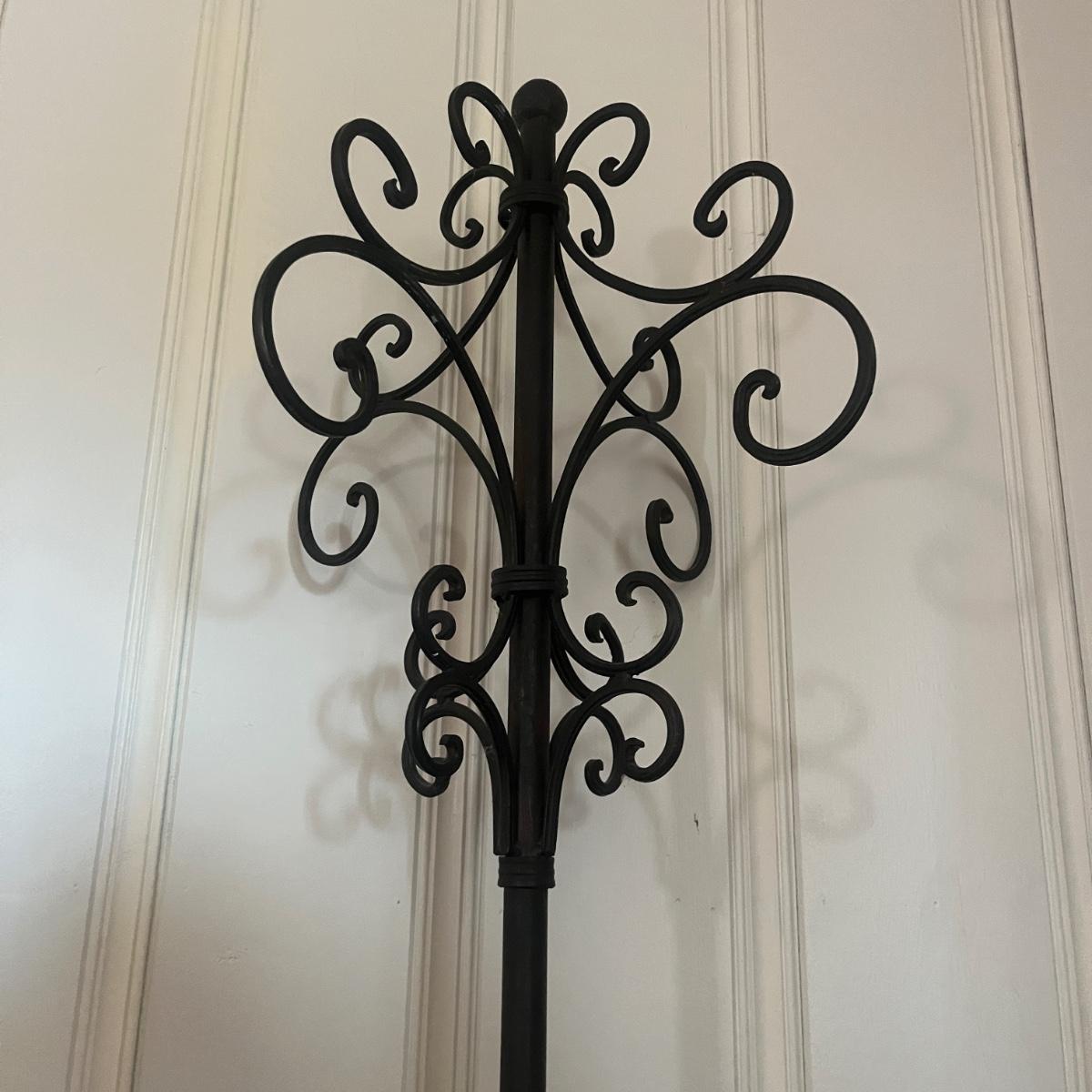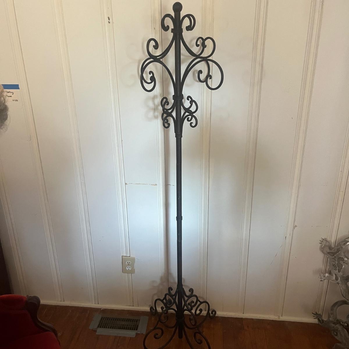 Lot includes a metal coat rack that measures 21”D x 69”H. It breaks apart into 3 pieces. The pole is lightweight metal but the top and bottom filigree is more like wrought iron.