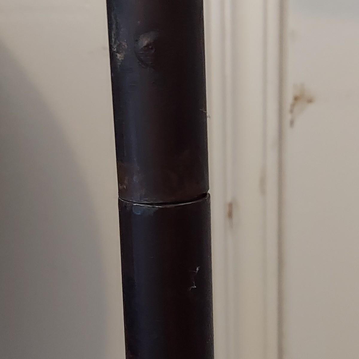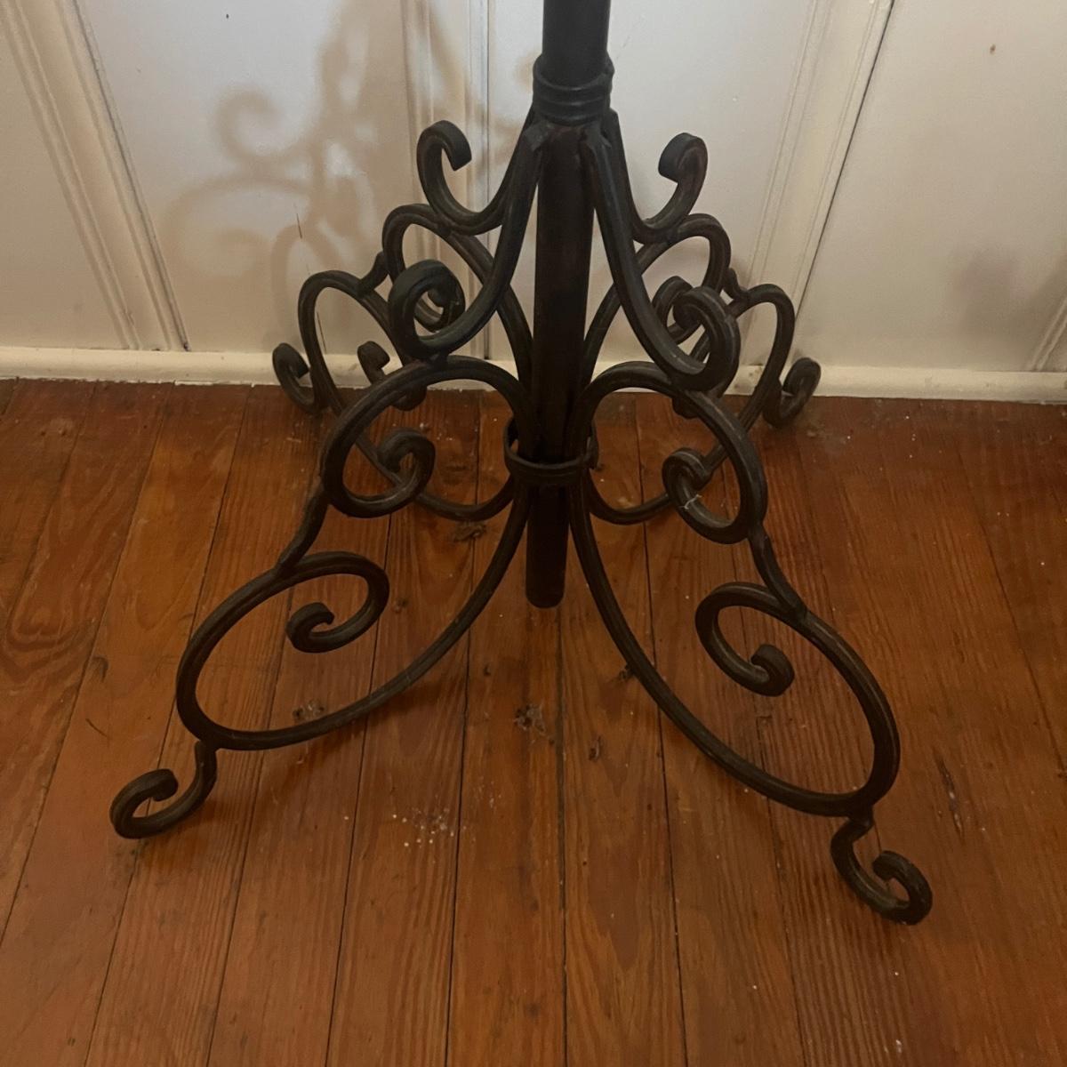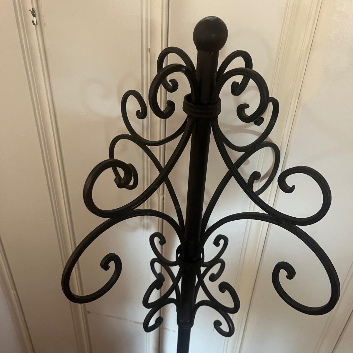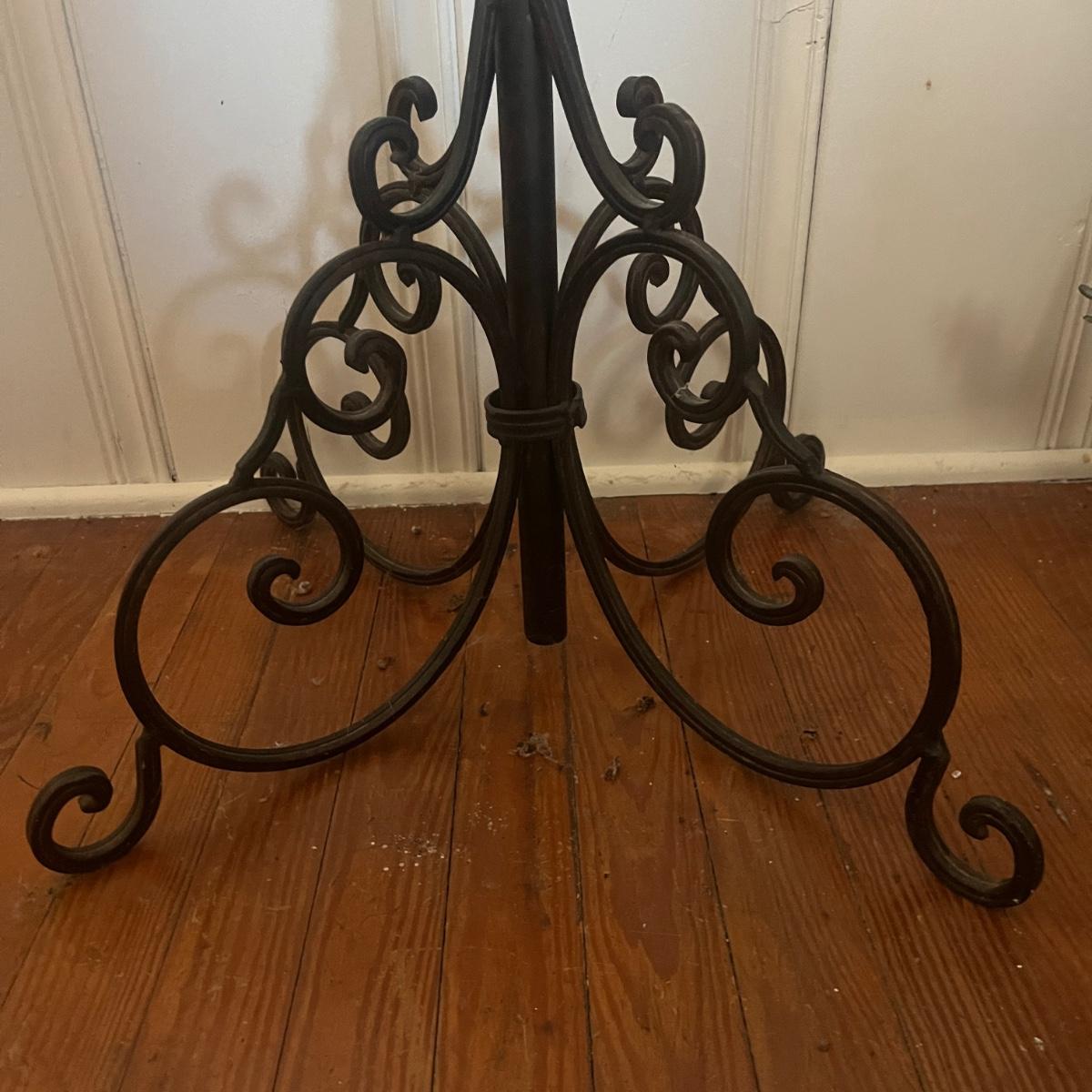 Lot includes a metal coat rack that measures 21”D x 69”H. It breaks apart into 3 pieces. The pole is lightweight metal but the top and bottom filigree is more like wrought iron.