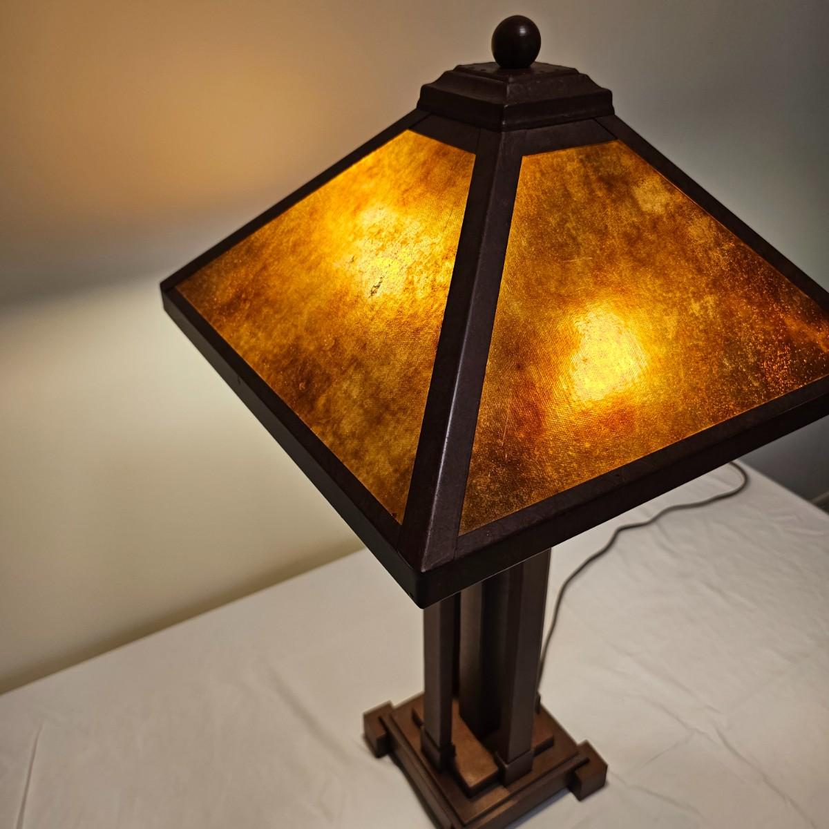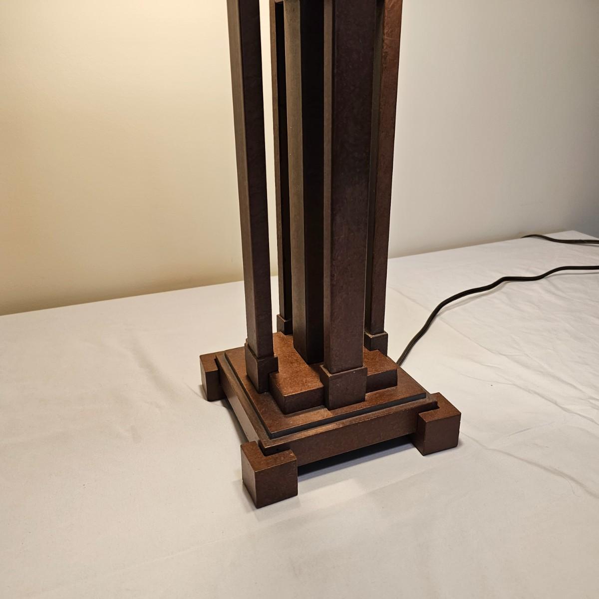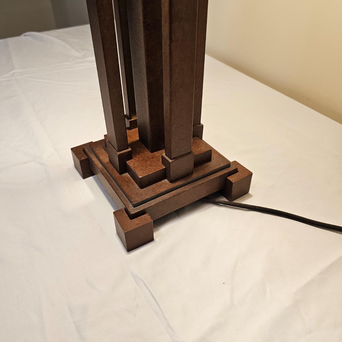 Distinctive five pillar table lamp with square shade. The lamp has two opposing bulbs with separate two way pull chains. Lamp shade measures 15" x 15" and lamp is 29"H. Lamp powered on when plugged in. Plastic/fiberglass shade. See photos for details. Shipping available. Shipping can be costly. We suggest contacting our preferred local shipping provider, Postage Express, with dimensions and getting an estimate before bidding: (828) 670-5501 or postageexpress@yahoo.com.