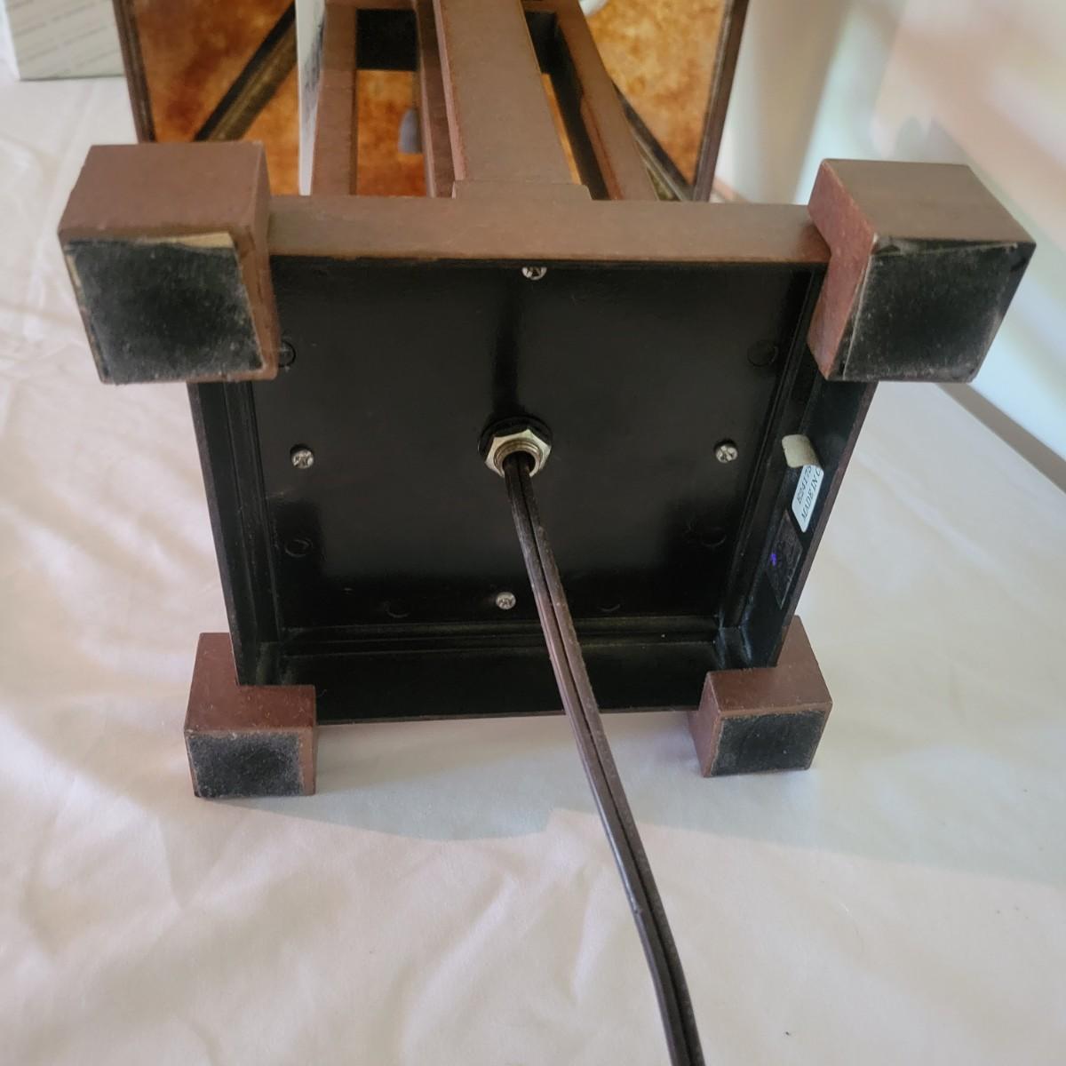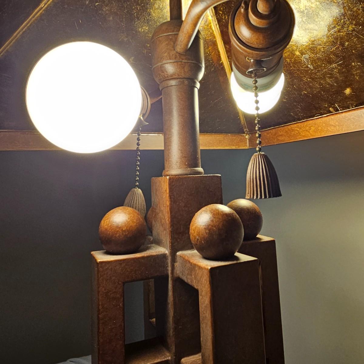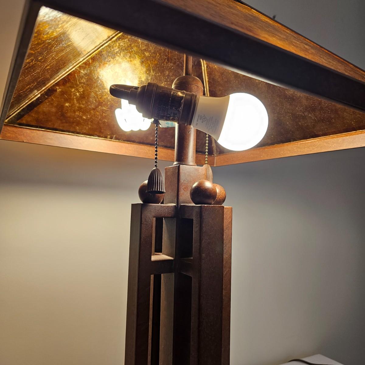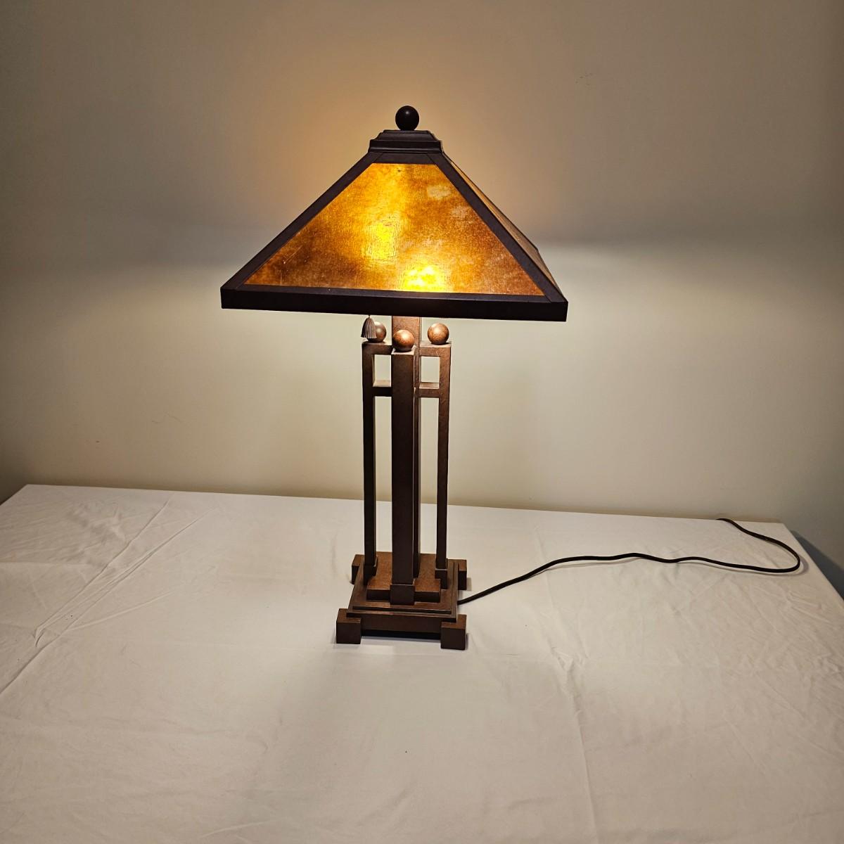 Distinctive five pillar table lamp with square shade. The lamp has two opposing bulbs with separate two way pull chains. Lamp shade measures 15" x 15" and lamp is 29"H. Lamp powered on when plugged in. Plastic/fiberglass shade. See photos for details. Shipping available. Shipping can be costly. We suggest contacting our preferred local shipping provider, Postage Express, with dimensions and getting an estimate before bidding: (828) 670-5501 or postageexpress@yahoo.com.