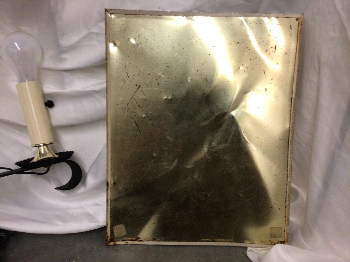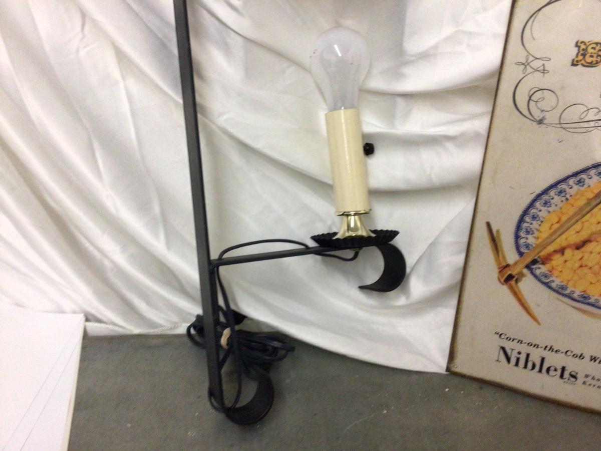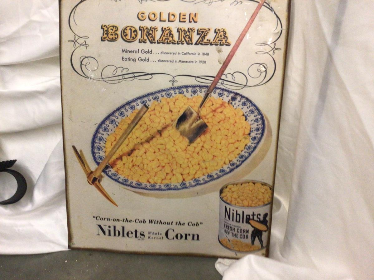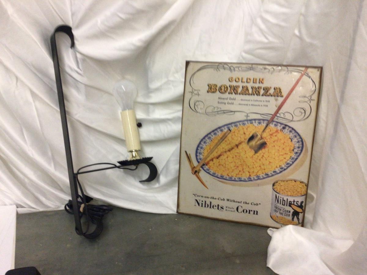 You get a vintage metal sign on corn, and a metal hook lamp.