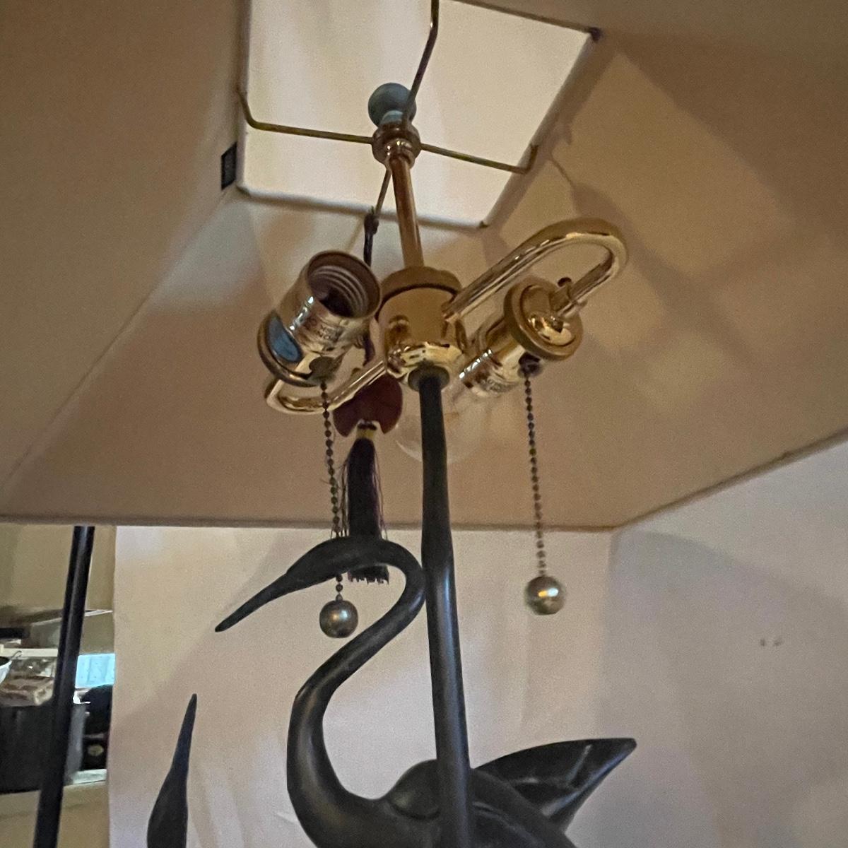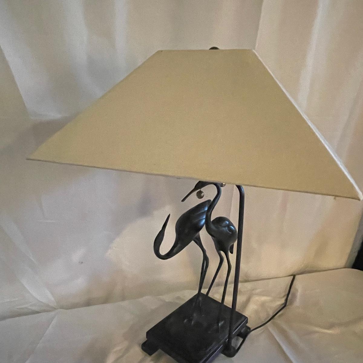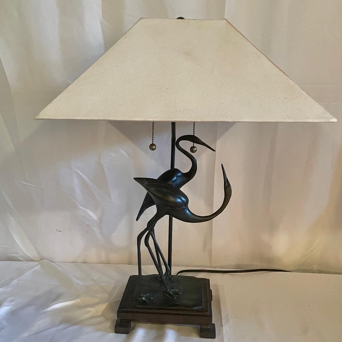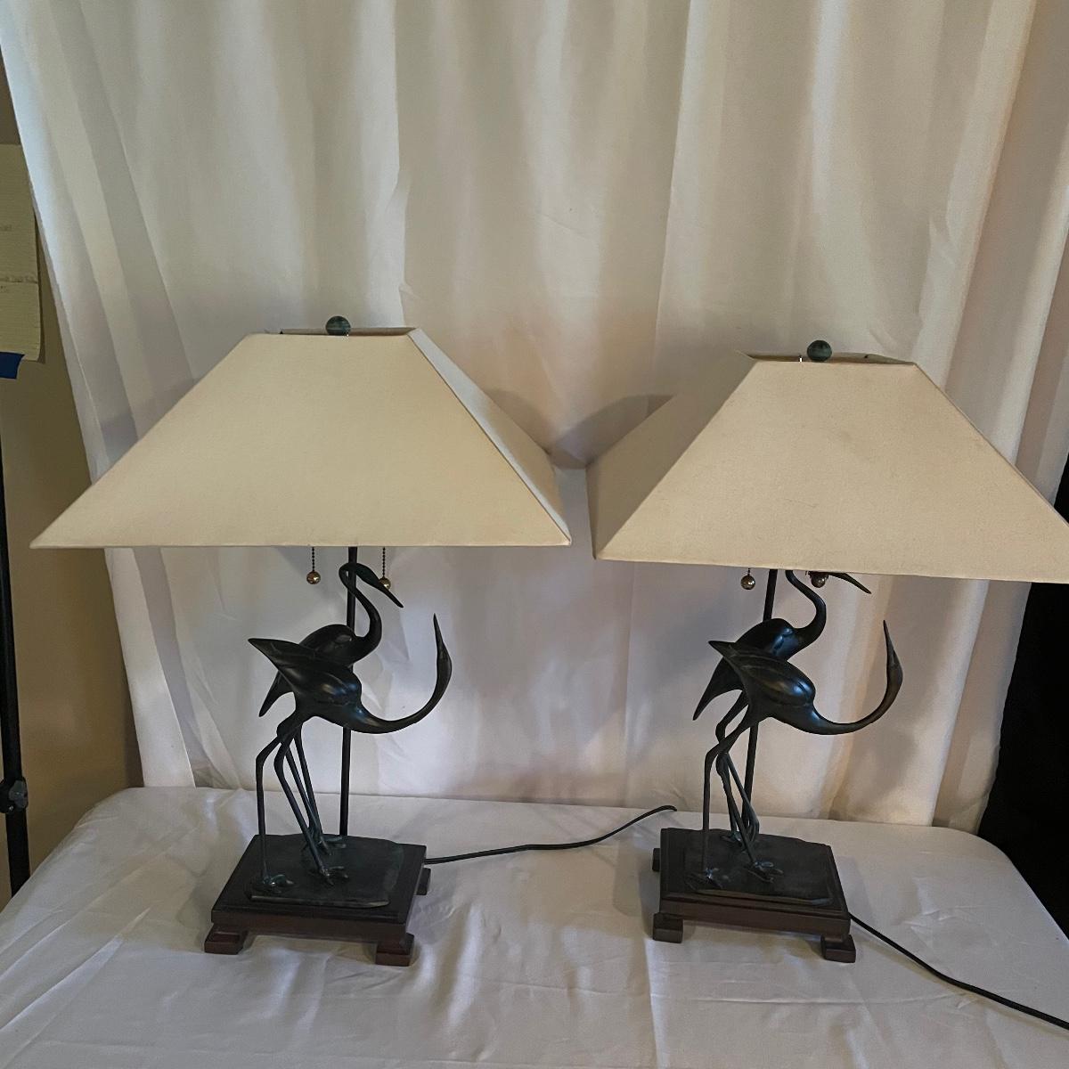 These attractive dual bulb lamps each feature a pair of Crane birds made of metal that are on a metal base. The linen colored shades compliment the bases beautifully. Note one of the Frederick Cooper shades has a small stain. Included is one carved wooden Koi fish tassel.