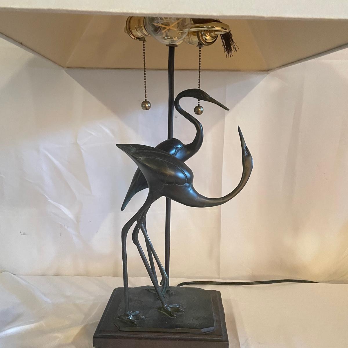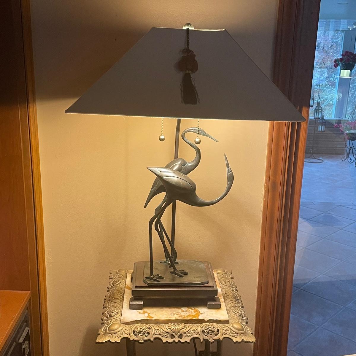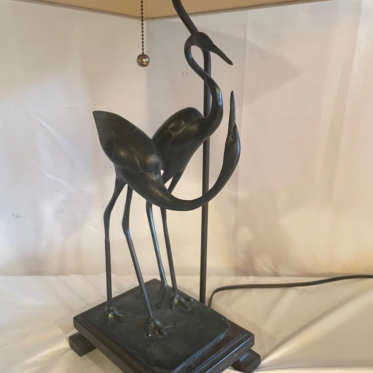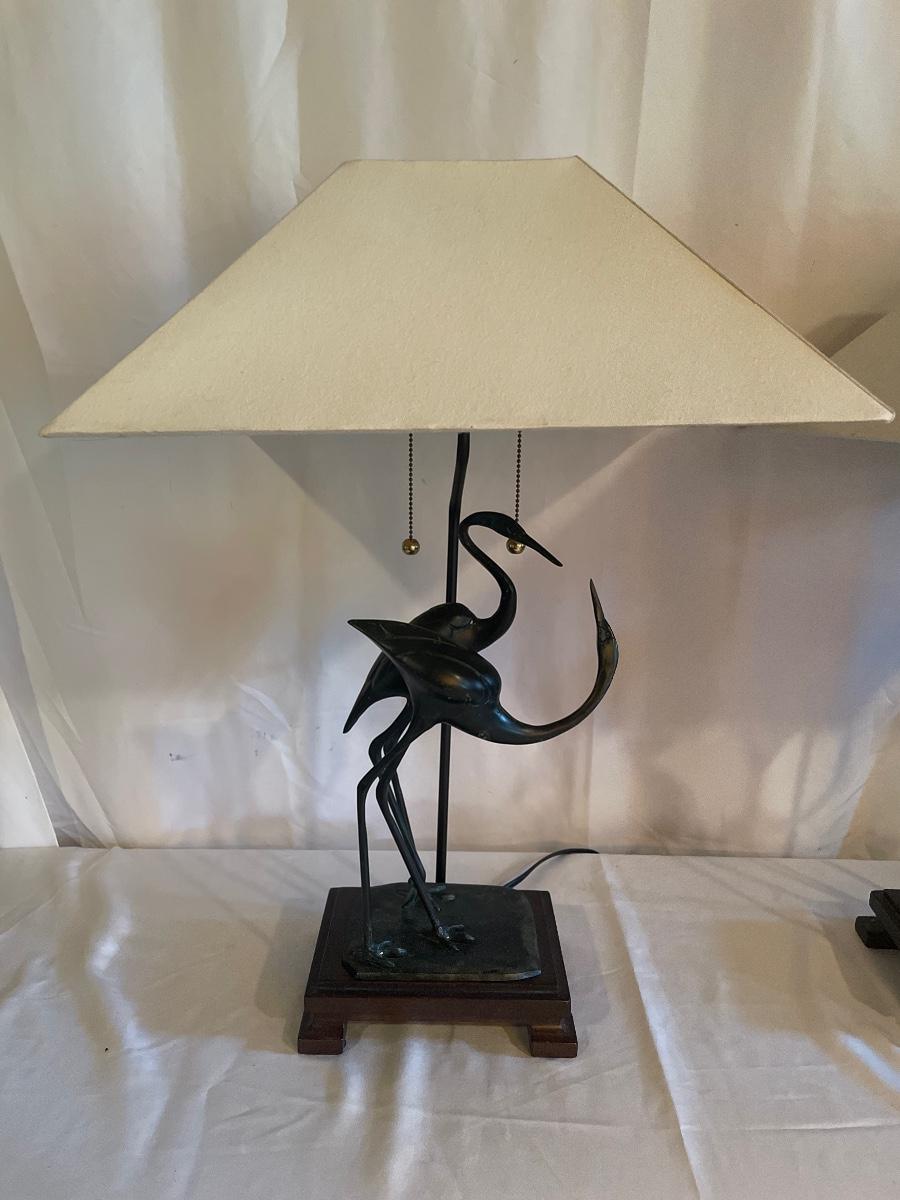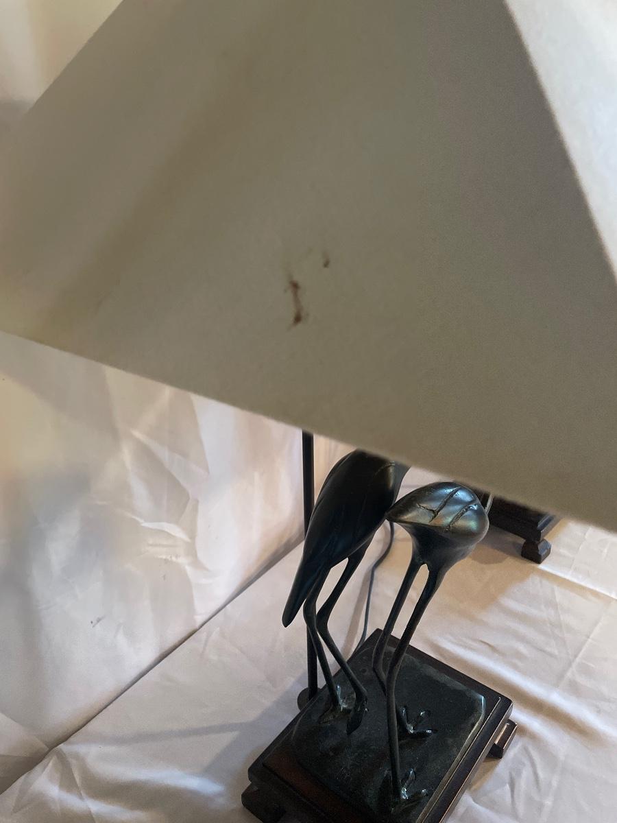 These attractive dual bulb lamps each feature a pair of Crane birds made of metal that are on a metal base. The linen colored shades compliment the bases beautifully. Note one of the Frederick Cooper shades has a small stain. Included is one carved wooden Koi fish tassel.