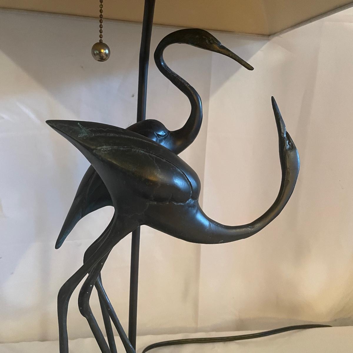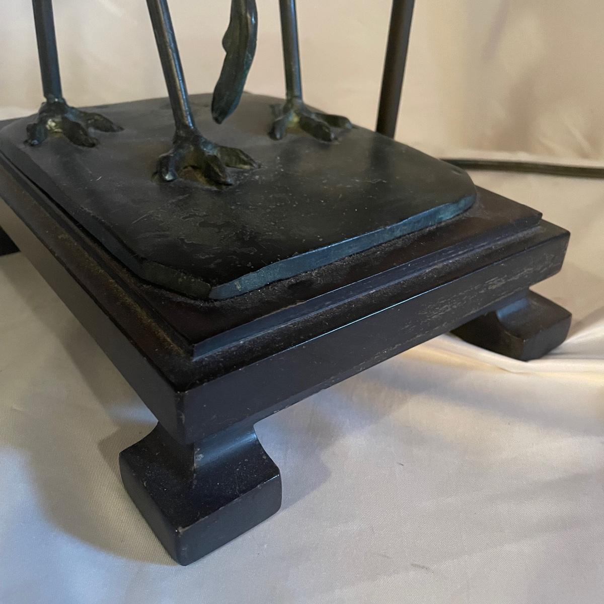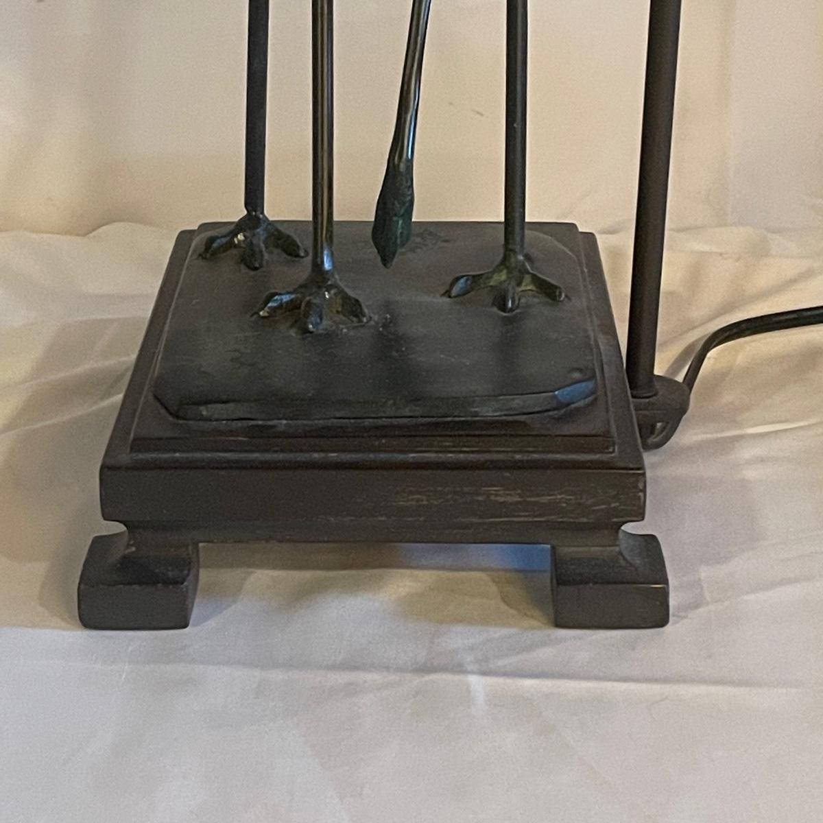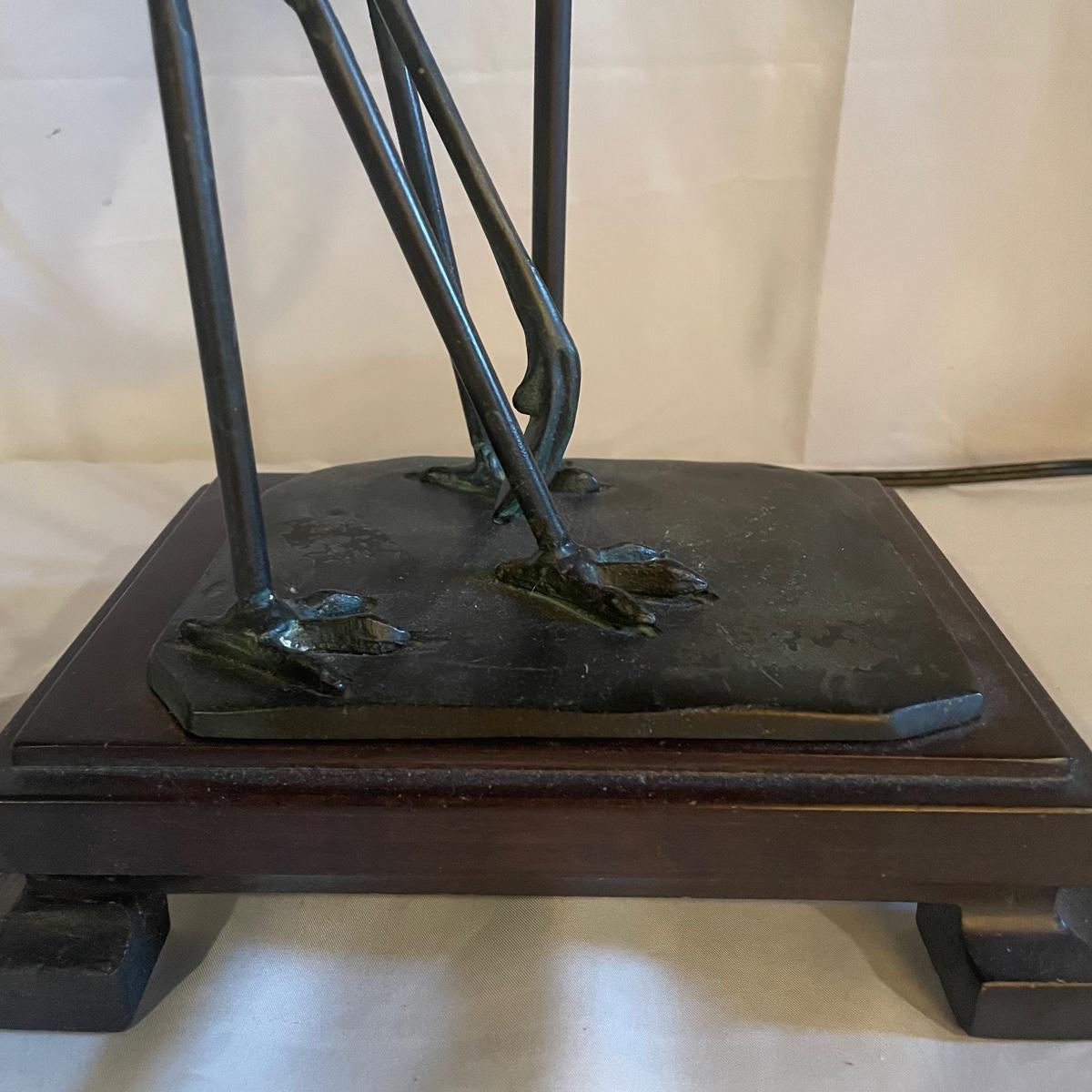 These attractive dual bulb lamps each feature a pair of Crane birds made of metal that are on a metal base. The linen colored shades compliment the bases beautifully. Note one of the Frederick Cooper shades has a small stain. Included is one carved wooden Koi fish tassel.