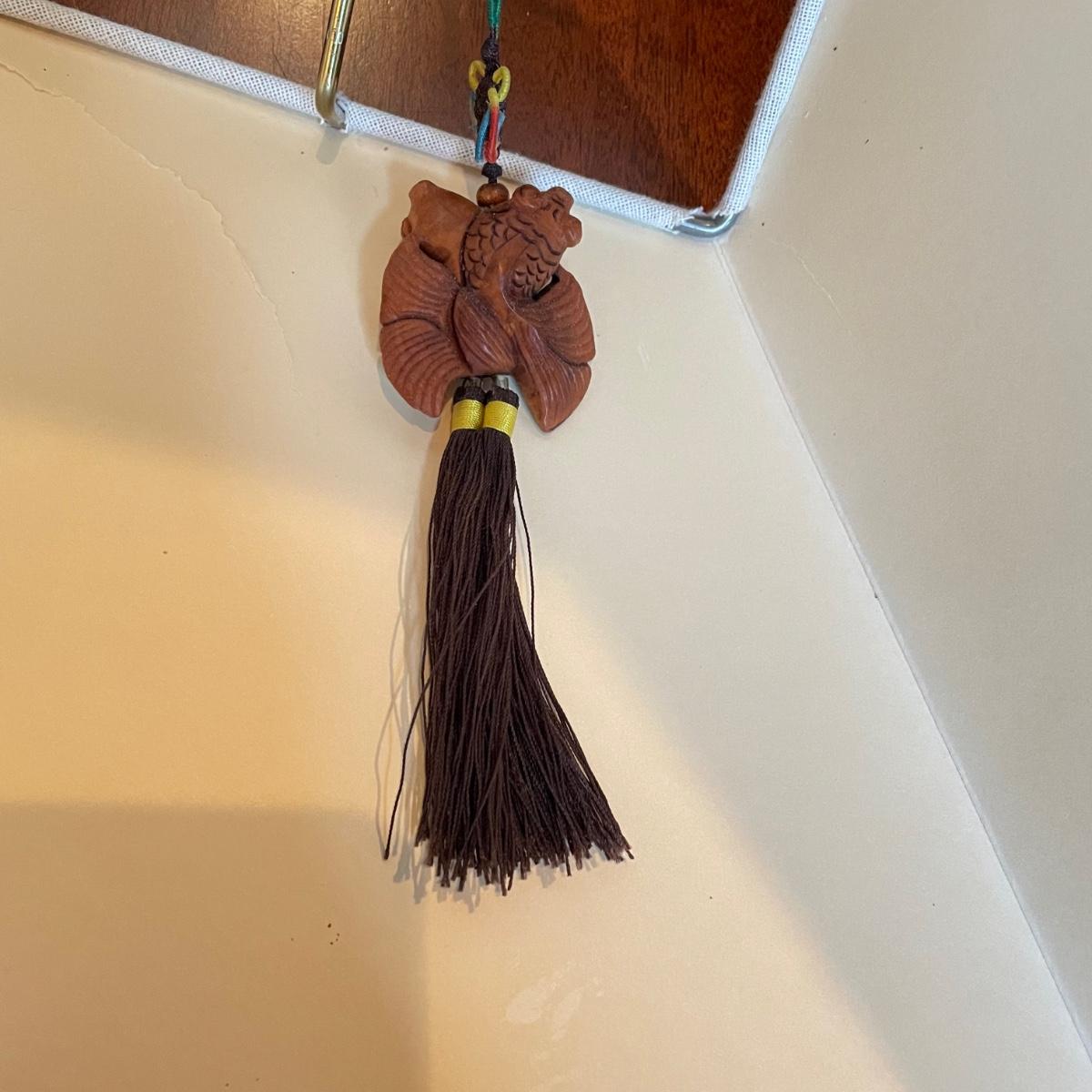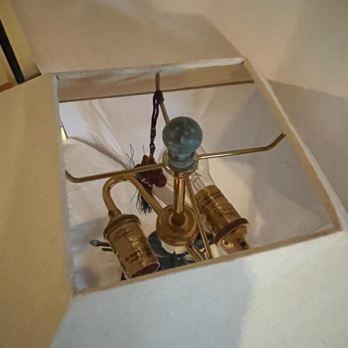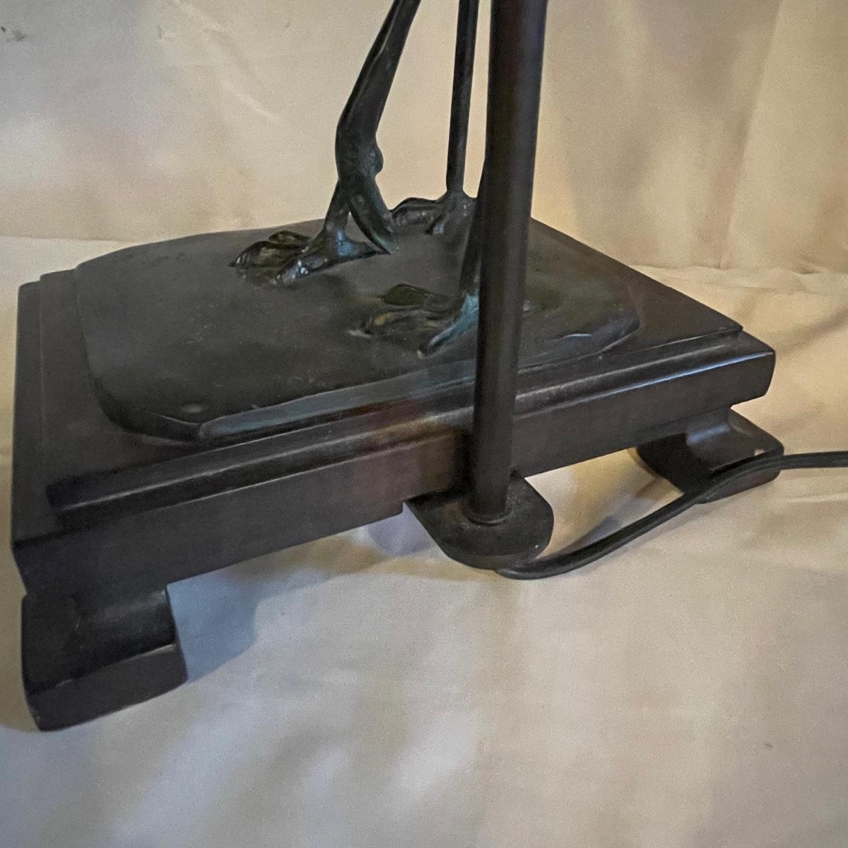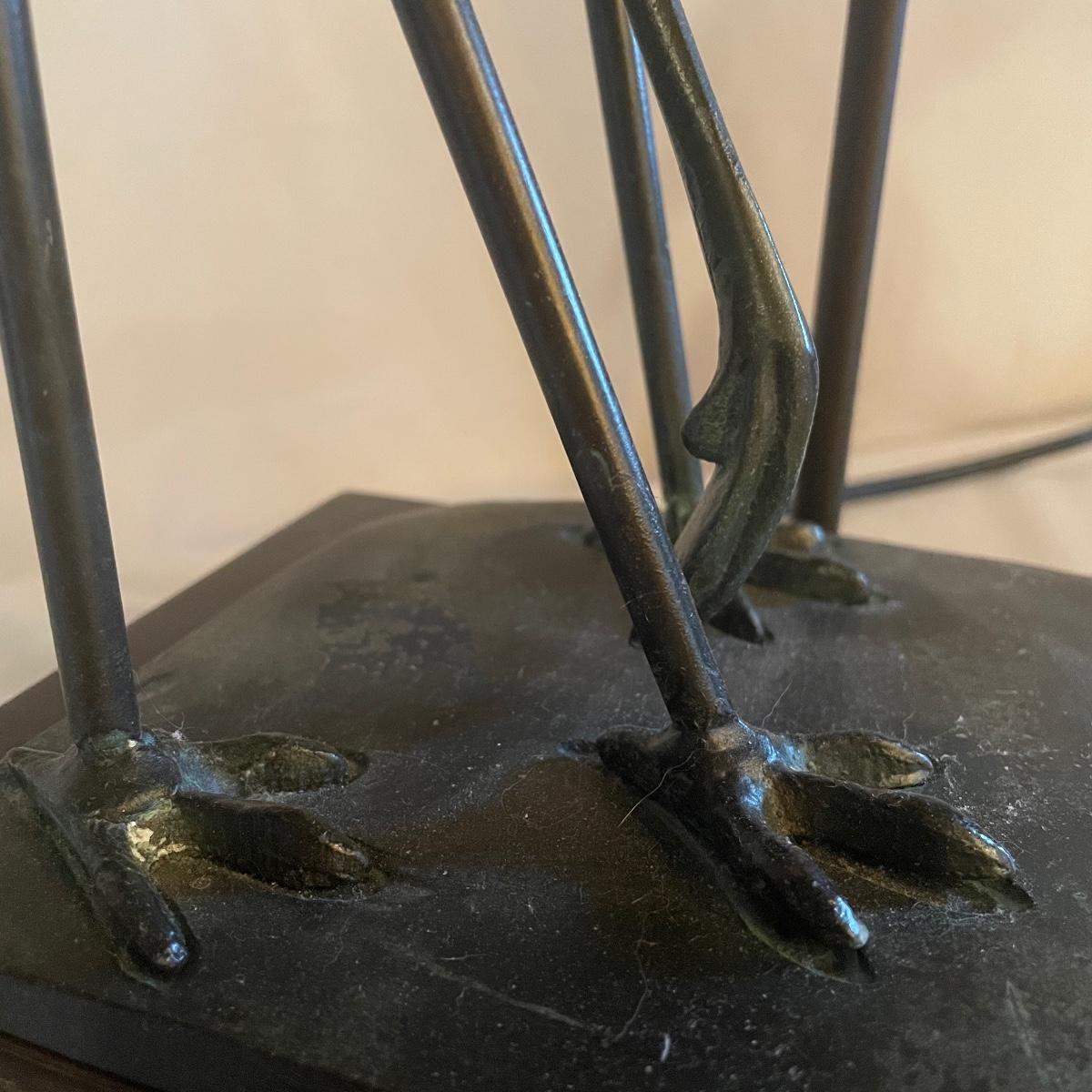 These attractive dual bulb lamps each feature a pair of Crane birds made of metal that are on a metal base. The linen colored shades compliment the bases beautifully. Note one of the Frederick Cooper shades has a small stain. Included is one carved wooden Koi fish tassel.