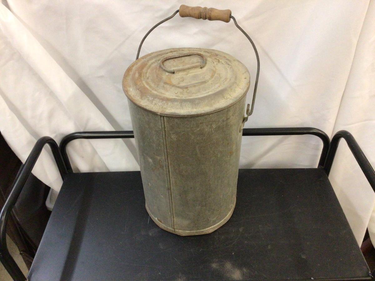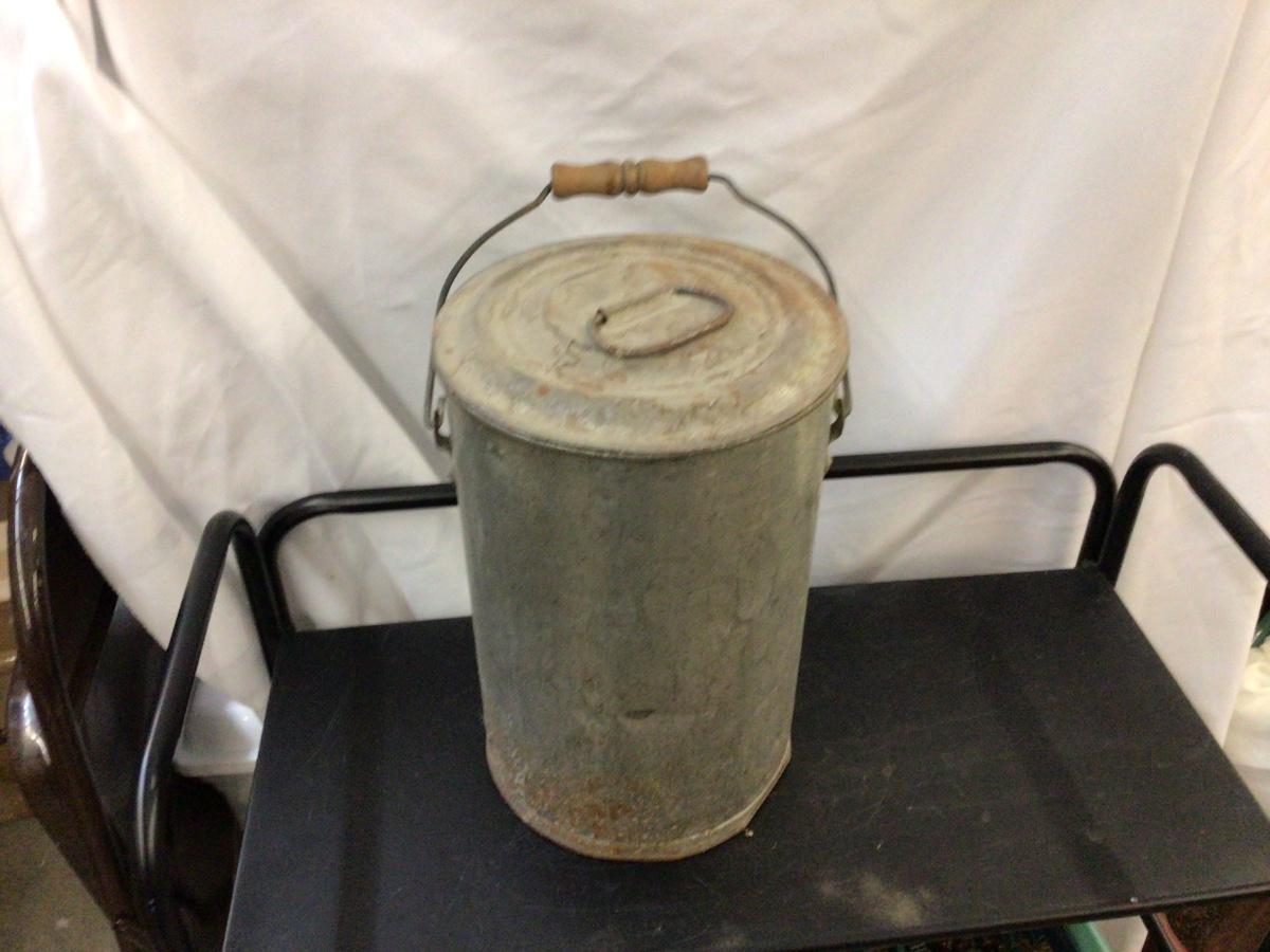 This is metal cream can with wood handle. Lid is stuck but might be able to work it off.