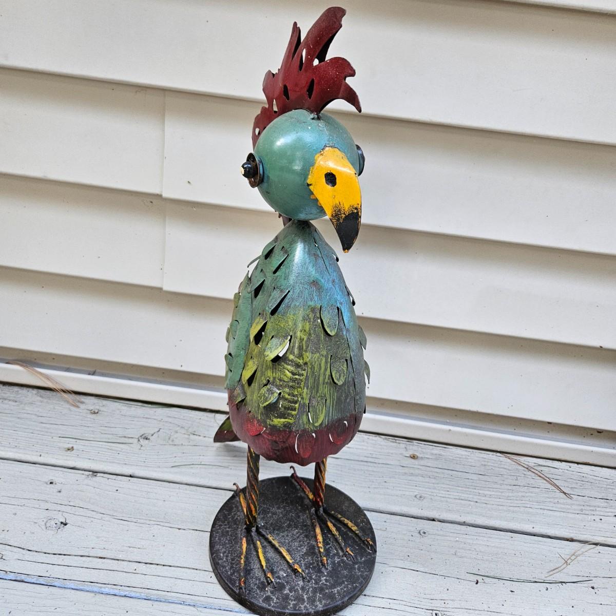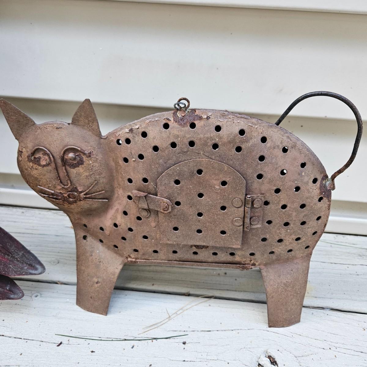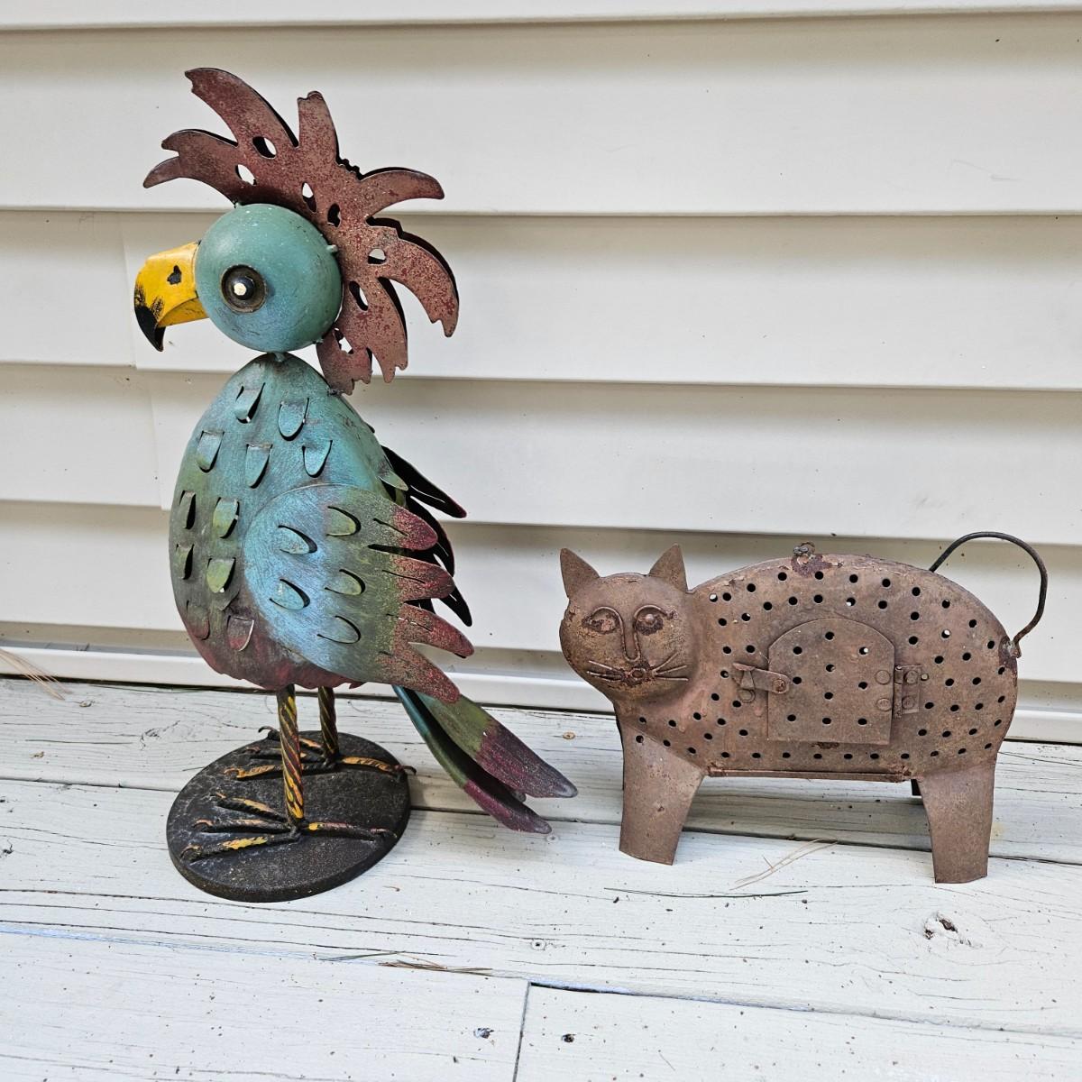 Two of metal art/decor pieces of a rooster and cat. The cat is a votive pin lamp with a chain to hang it with and a small door for the candle. The rooster measures approximately 6 5" x 11" x 19"H. Shipping available