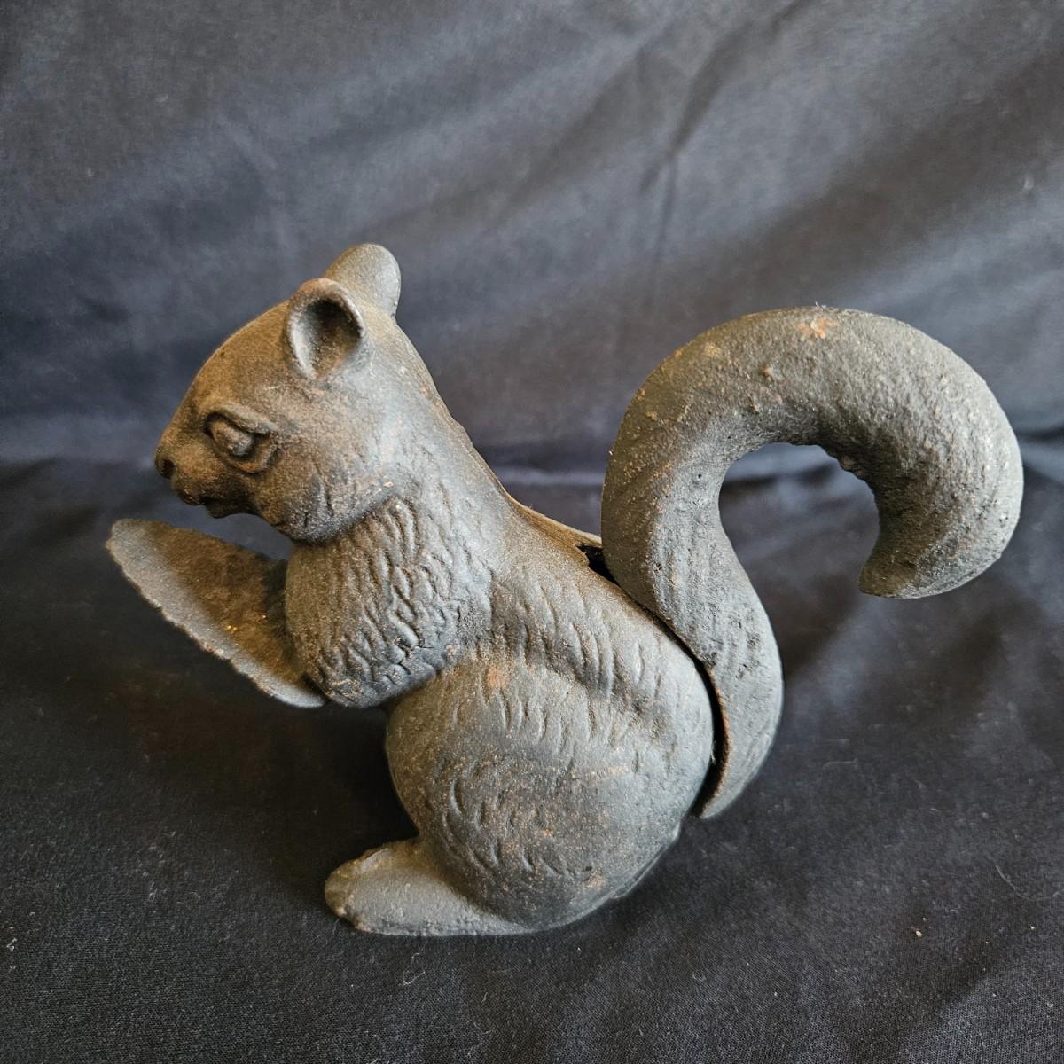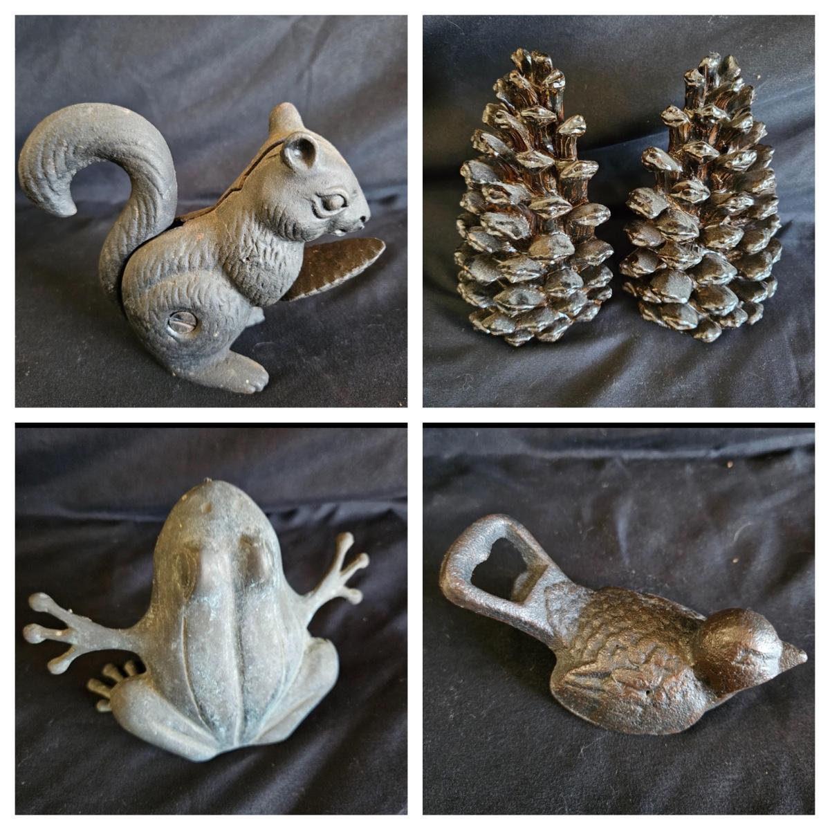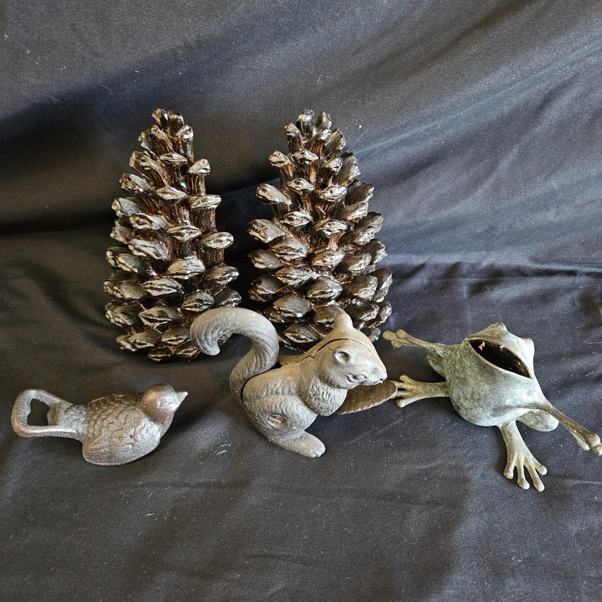 Three metal critters and a pair of what appears to be resin cast pinecone bookends. Each bookends measures approximately 4.5" x 3.5" x 7"H. Also includes a cast iron bottle openers shaped like a bird, a cast iron squirrel that is also a nut cracker and a frog that appears to be brass based on the patina. Shipping available