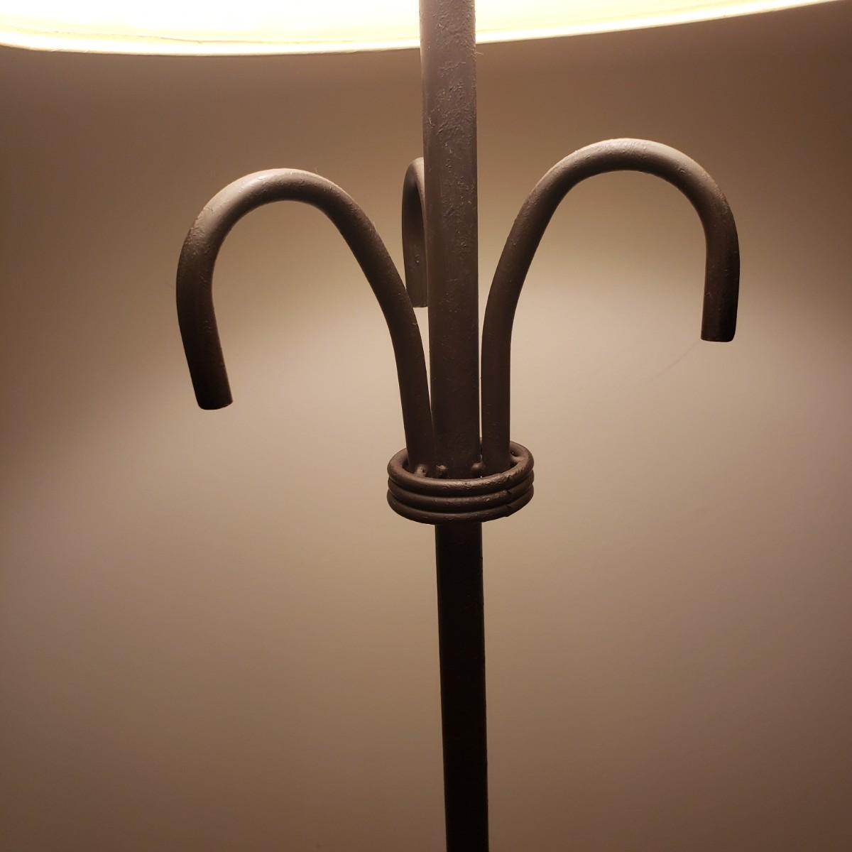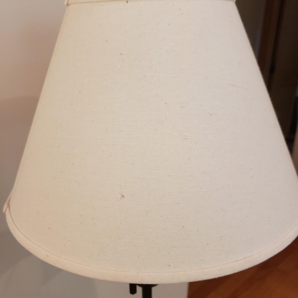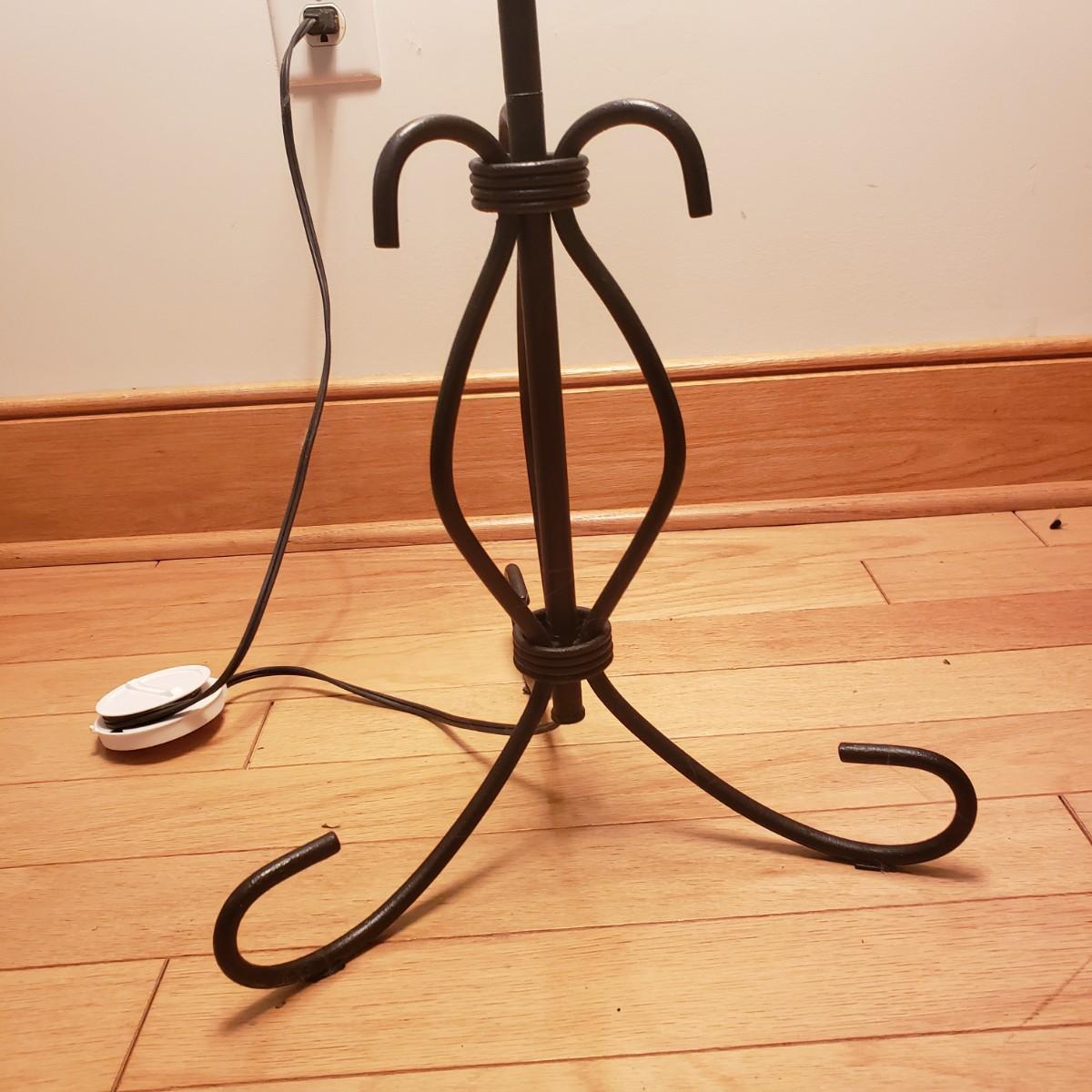 The metal floor lamp measures 14" x 48"H. The shade is a cream, tweed like material. This is a 3-way switch. A bonus is a cord away, that wraps the cord for storage. The lamp powers on when plugged in.