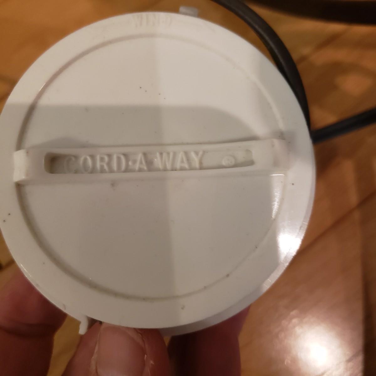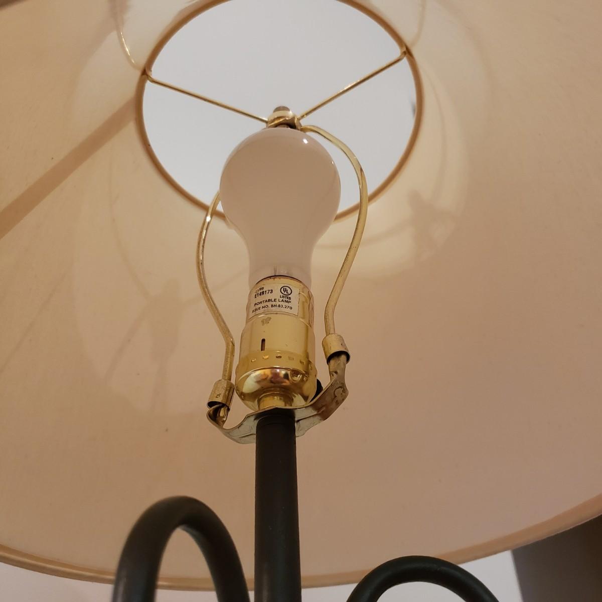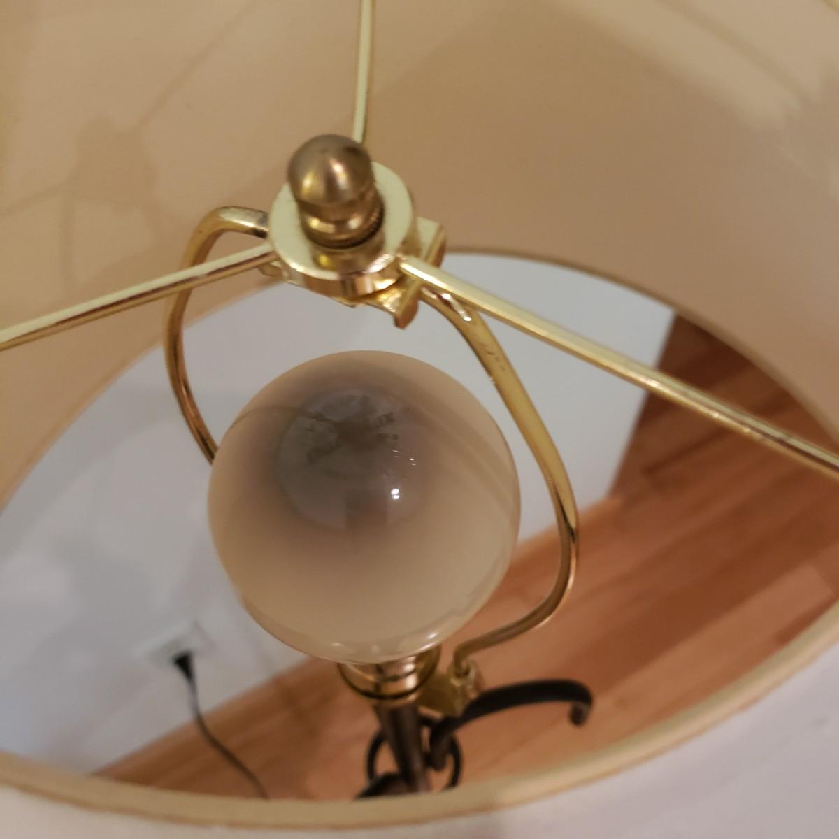 The metal floor lamp measures 14" x 48"H. The shade is a cream, tweed like material. This is a 3-way switch. A bonus is a cord away, that wraps the cord for storage. The lamp powers on when plugged in.
