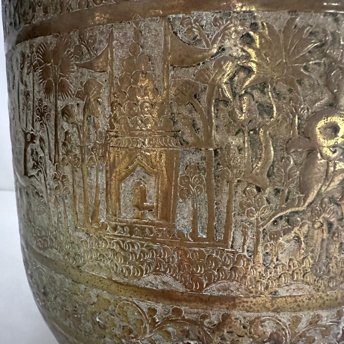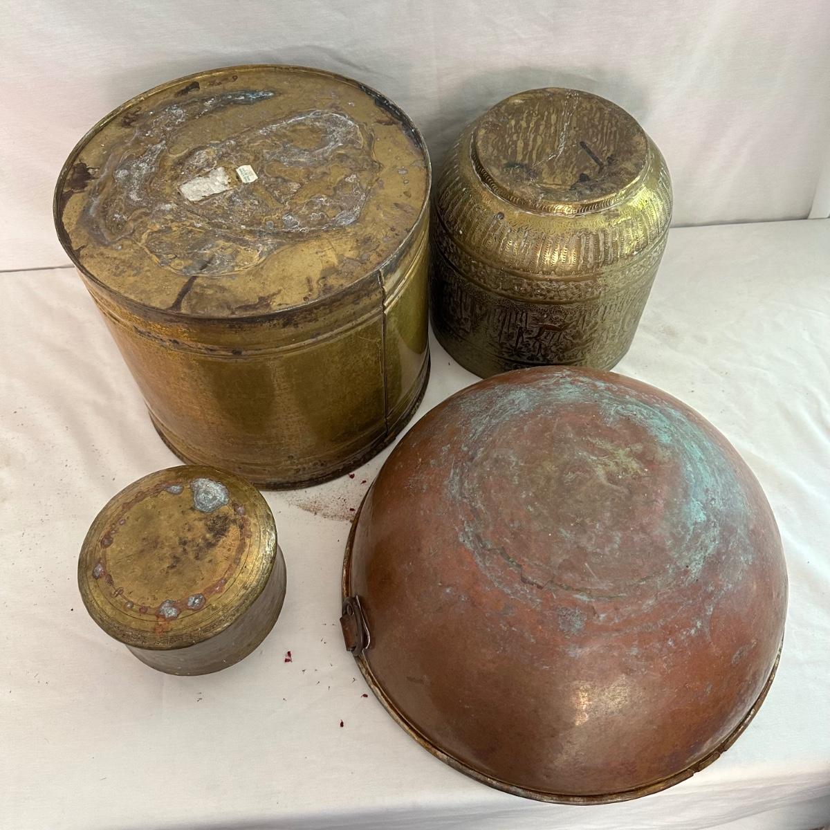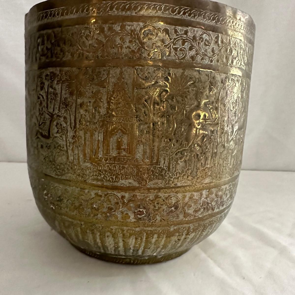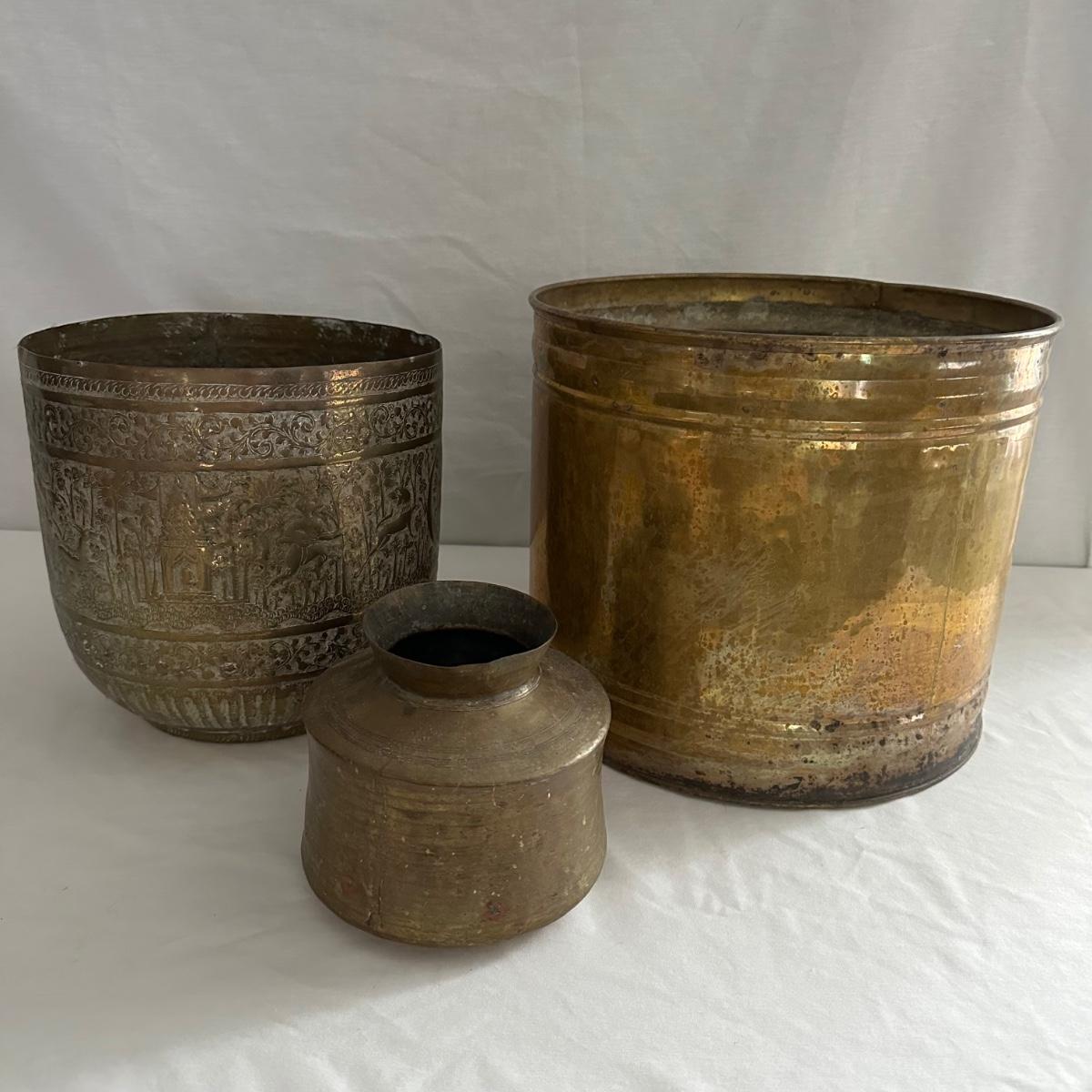 Copper and brass colored finishes on a variety of metal planters. Largest round planter is 15.5”D X 8”H. Tallest planter is 10”H. Shipping available. Shipping can be costly. We suggest contacting our preferred local shipping provider, Postage Express, with dimensions and getting an estimate before bidding: (828) 670-5501 or postageexpress@yahoo.com.