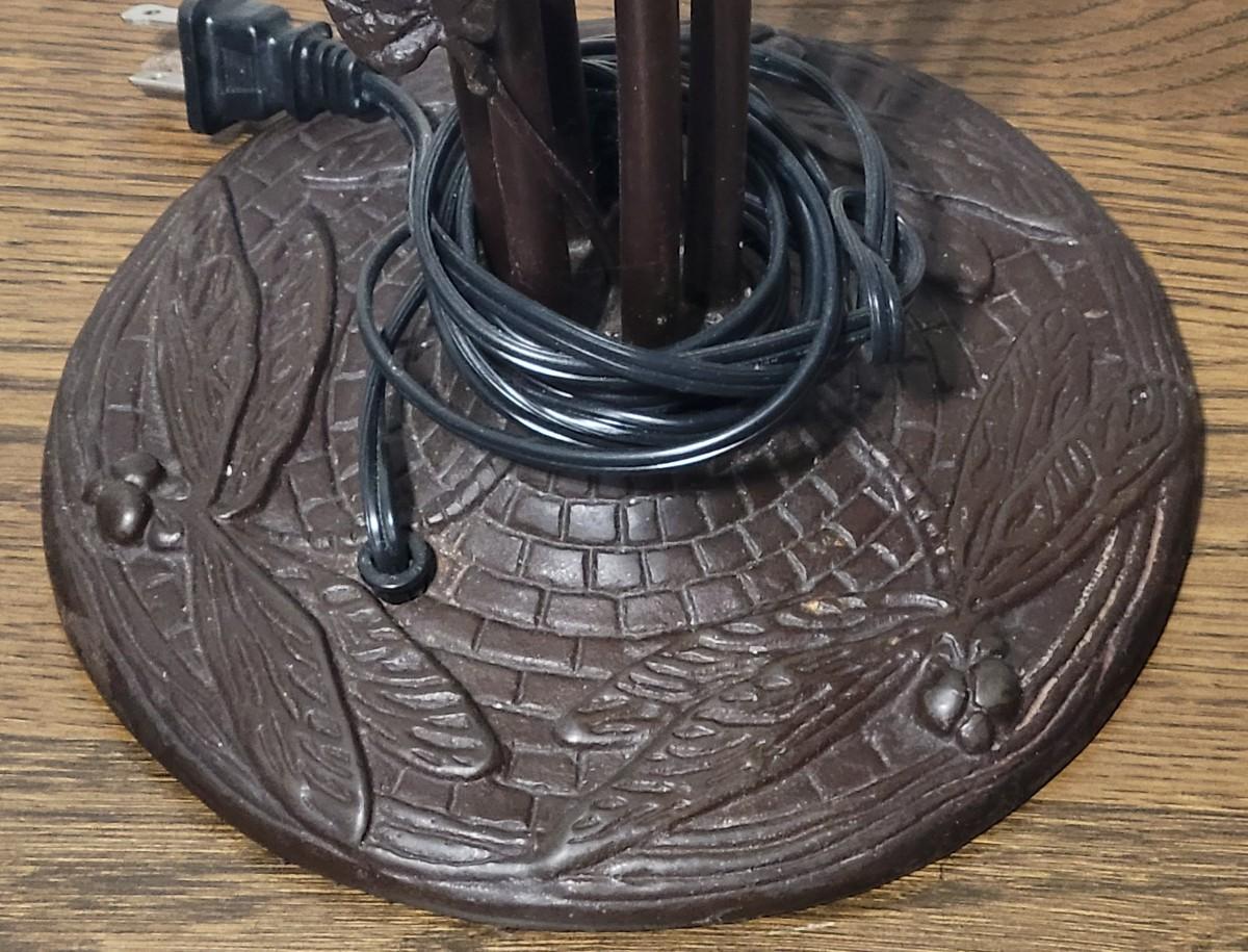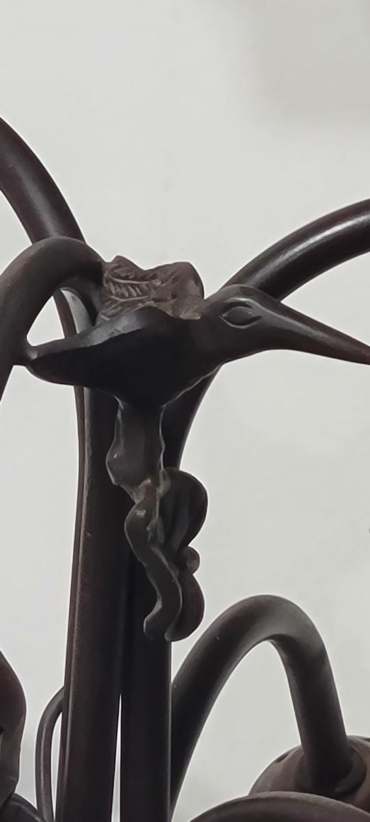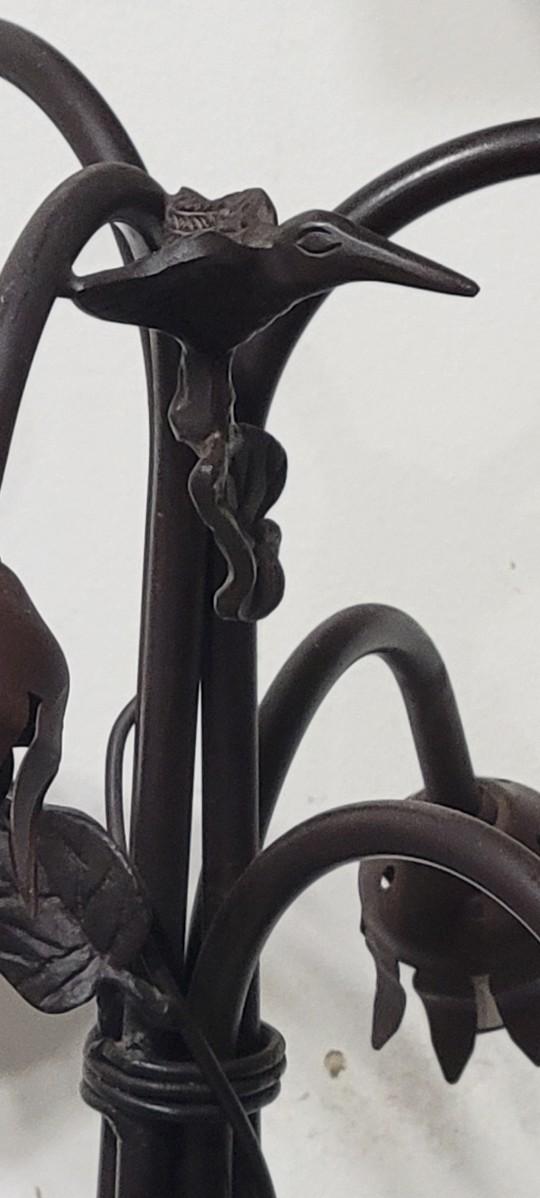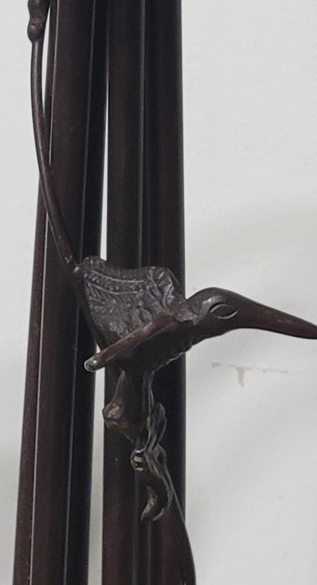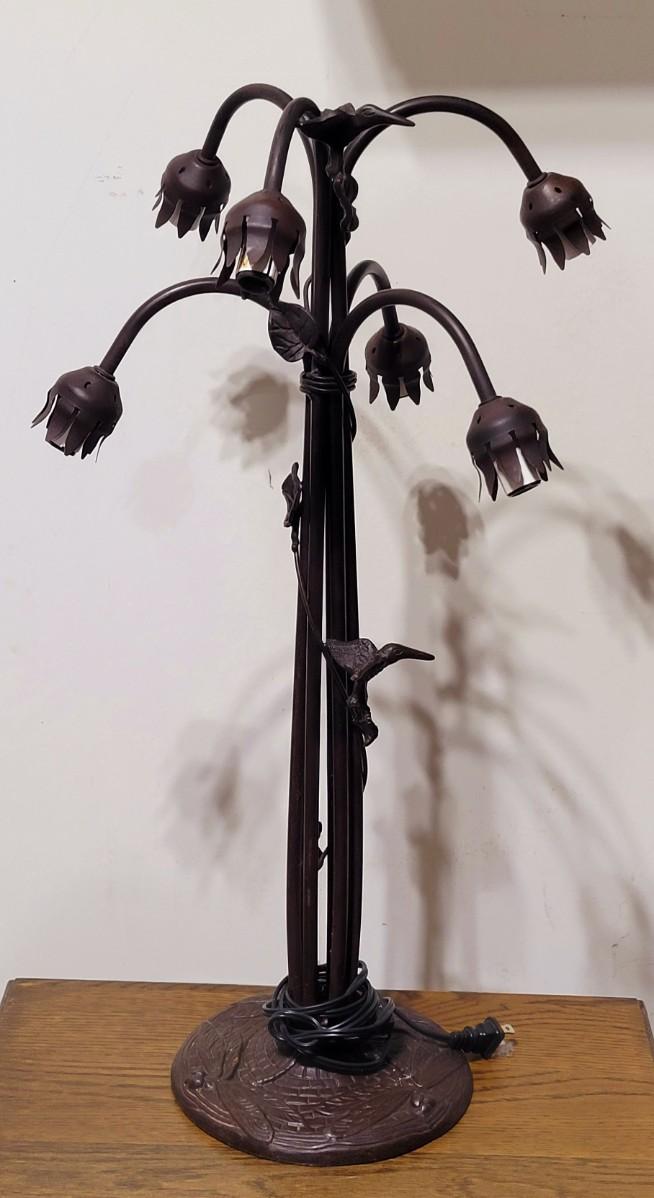 5 bulb lamp with hummingbird decor on the upright and dragonfly ornamental base.