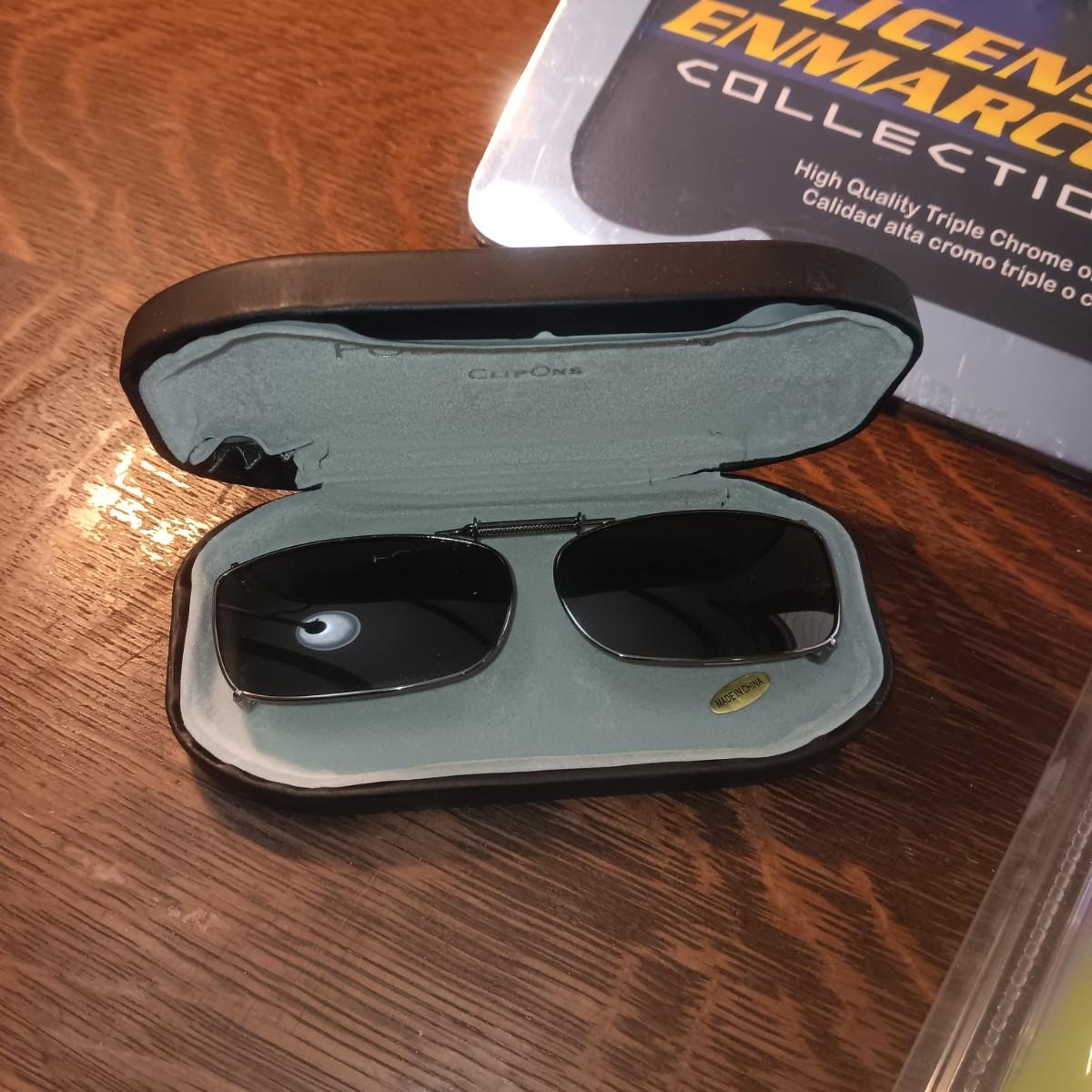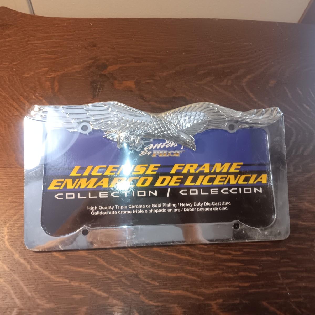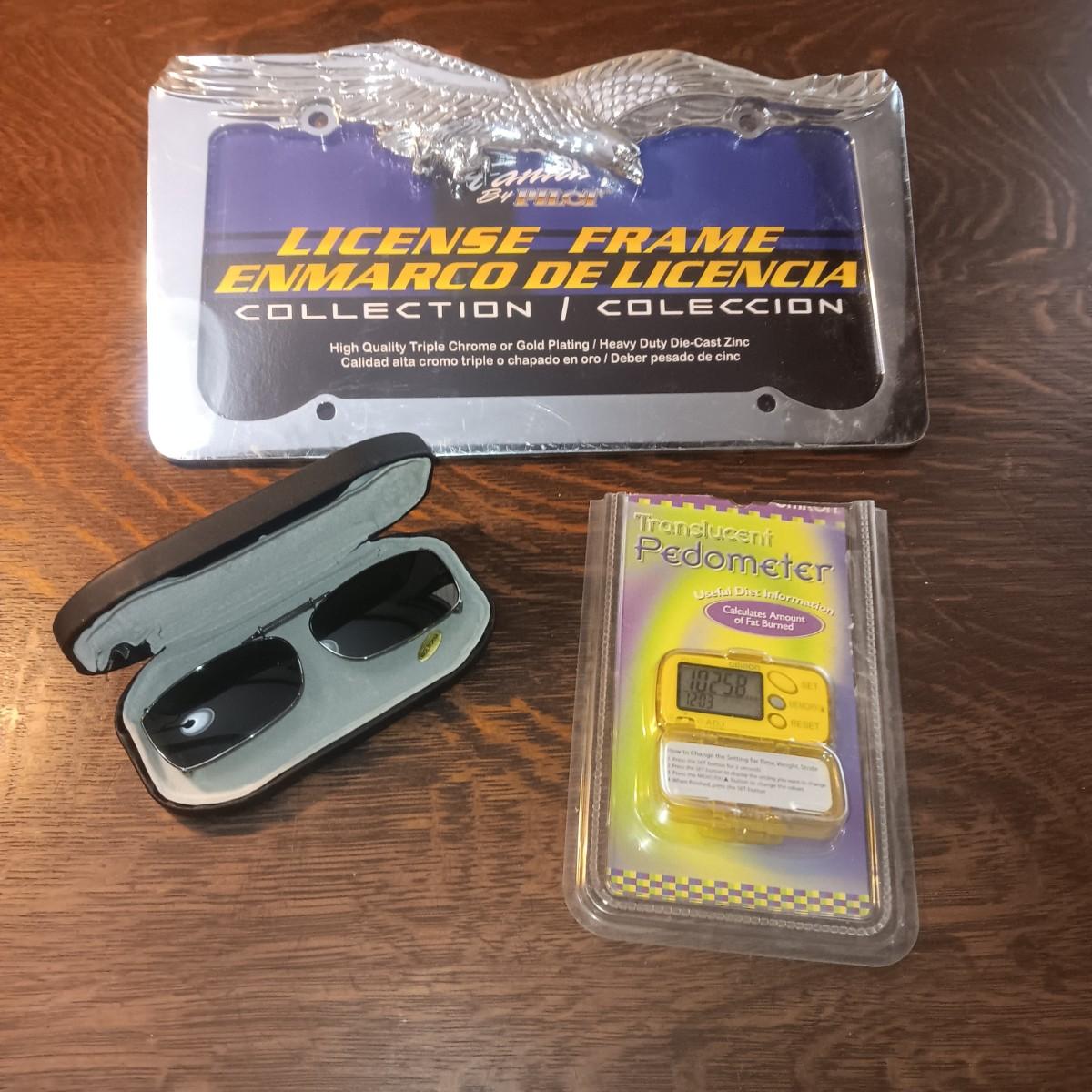 METAL EAGLE LICENSE PLATE FRAME, POLAR OPTIC CLIP ON SUNGLASSES