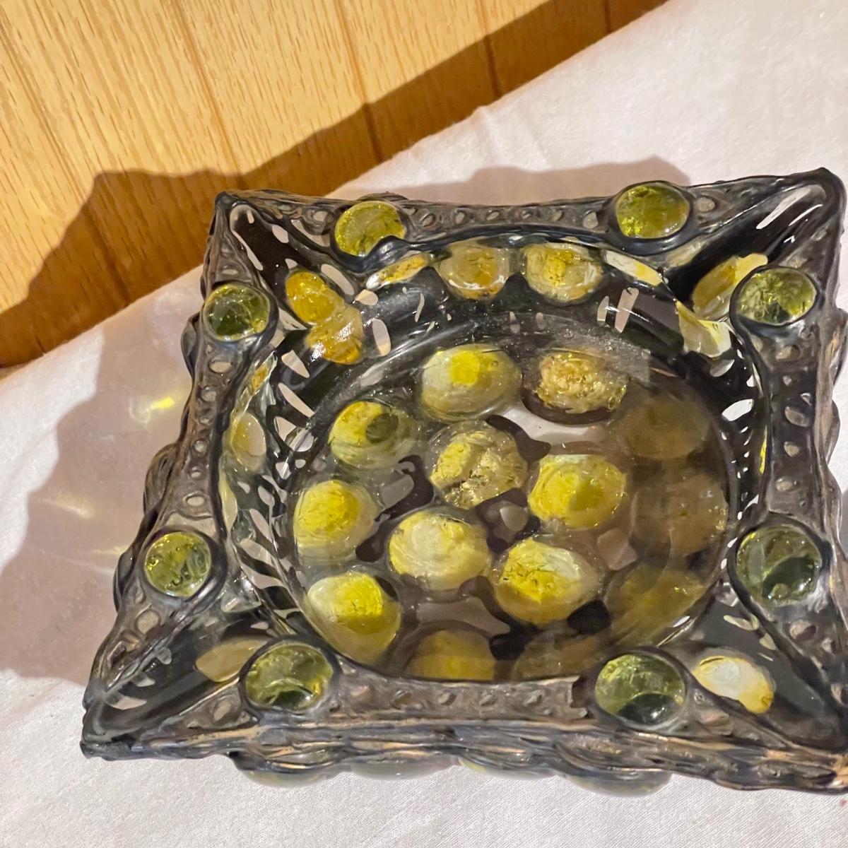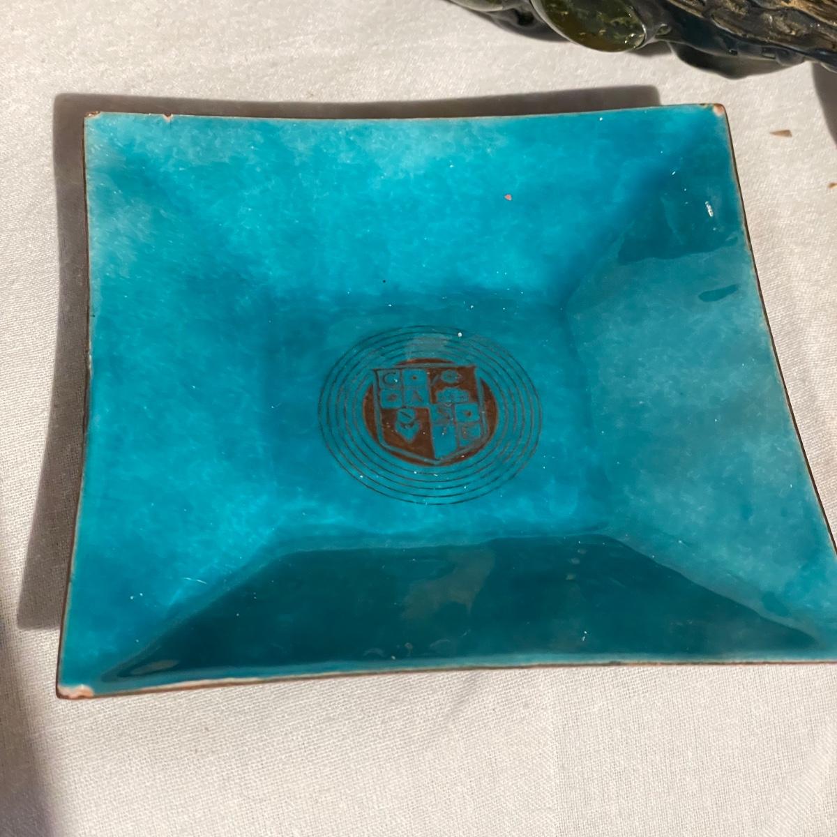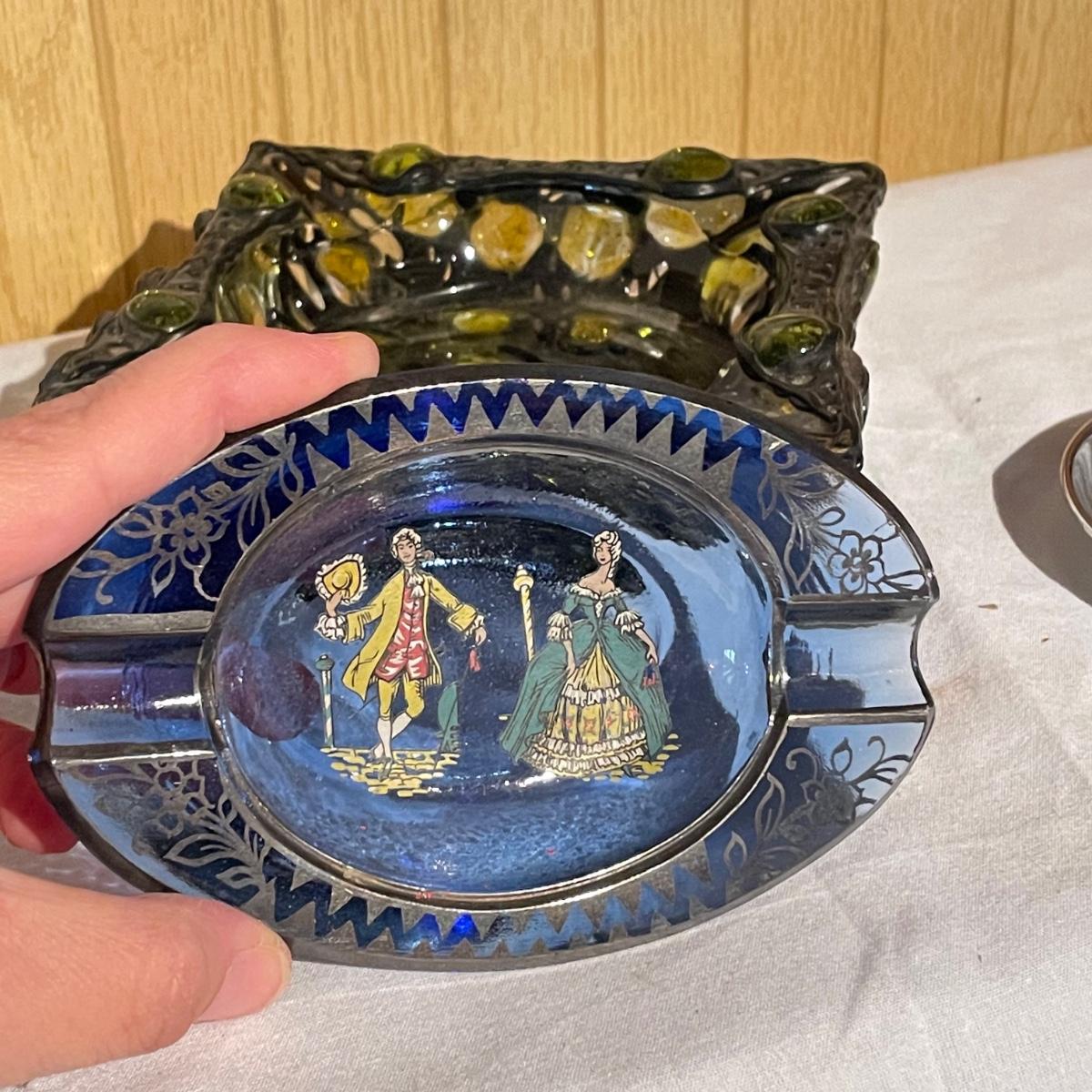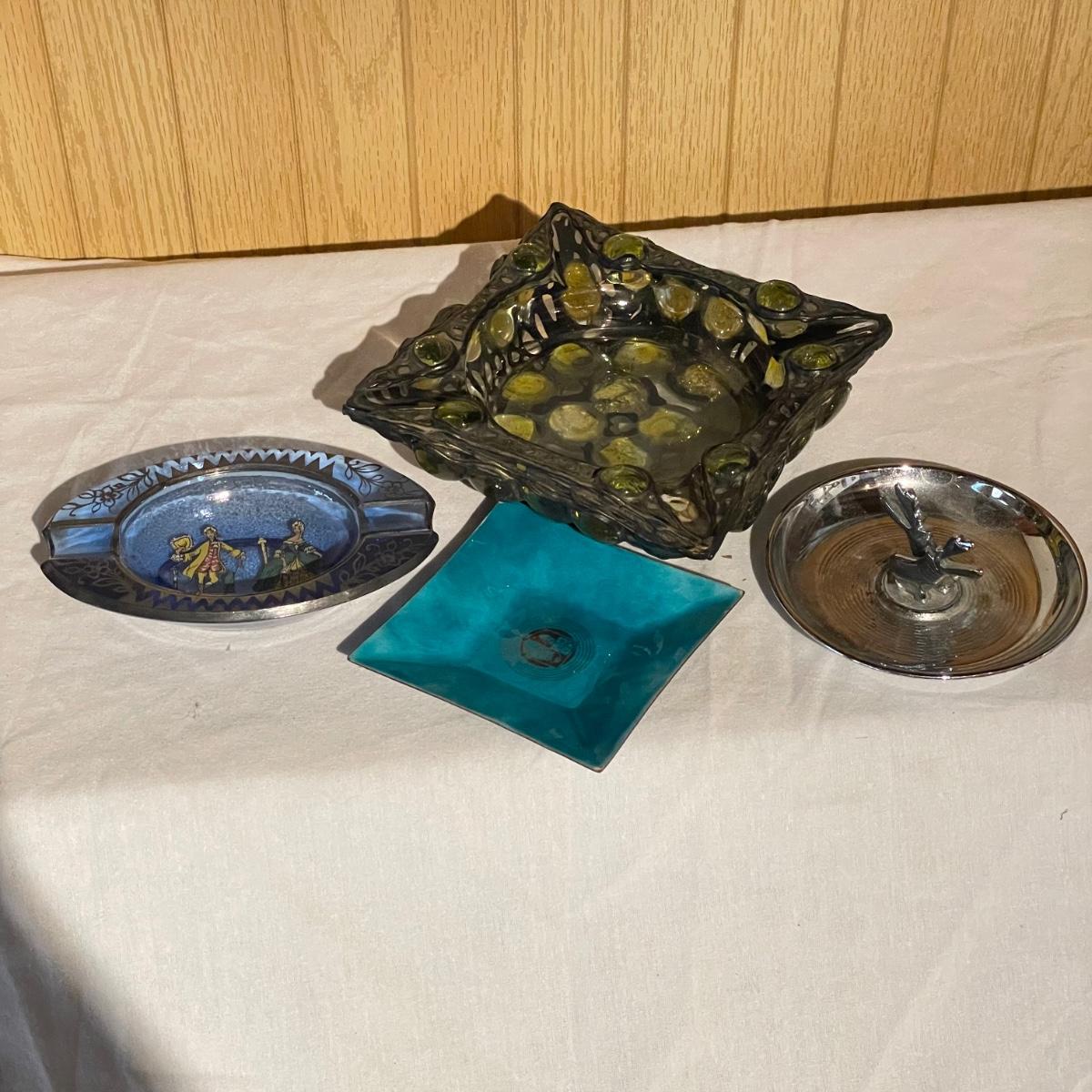 Lot features a heavy, large 6”sq lime green glass bead ashtray. The beads have been soldered to the astray with metal. A 3.75” sq teal enamel tray with a shield displaying the letters CASE, a clear blue Victorian painted ashtray plus a silver colored metal tray with two laughing hippos. See images. Shipping available.