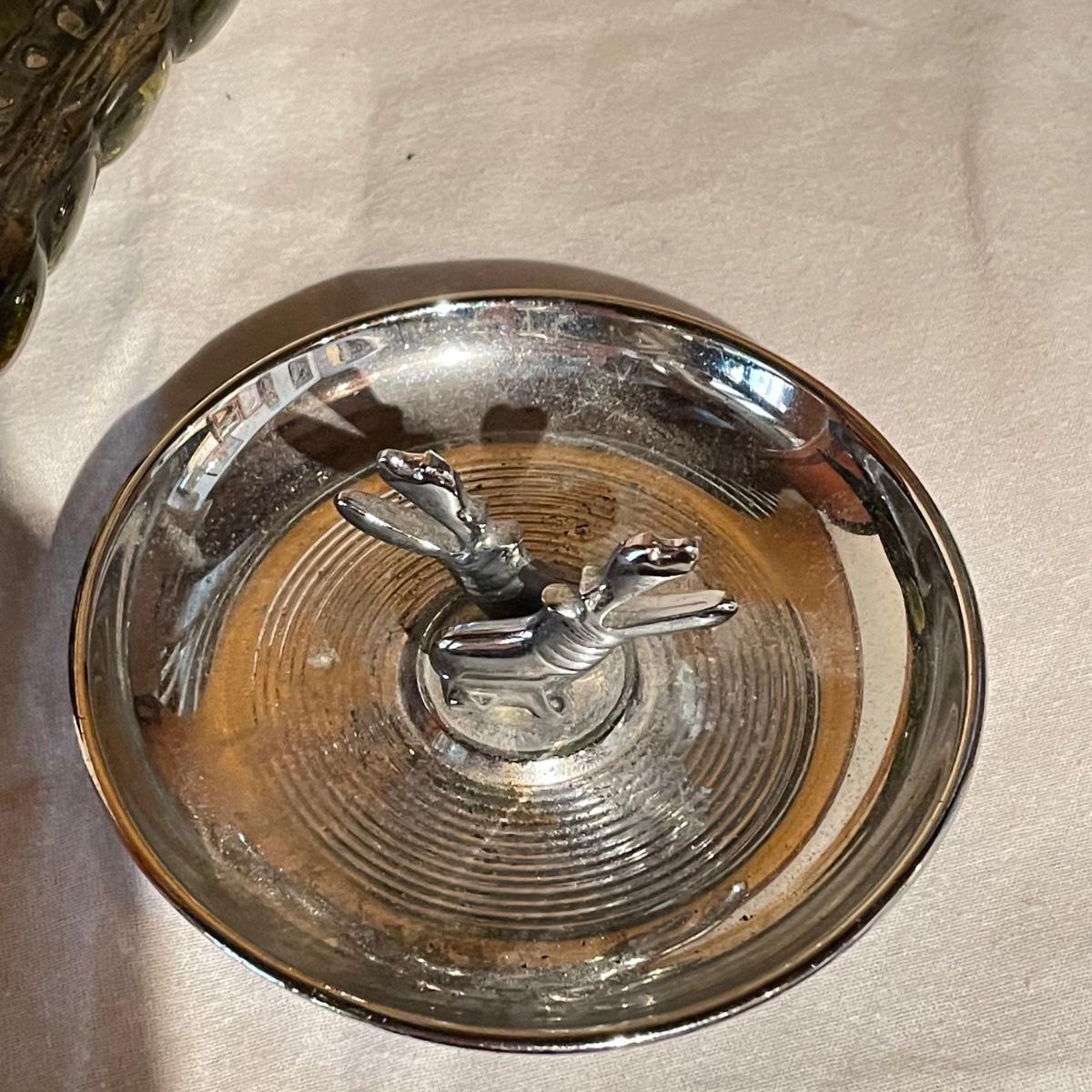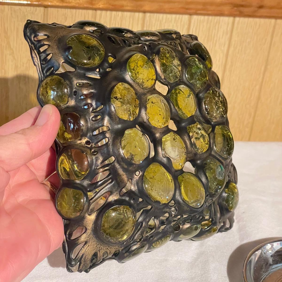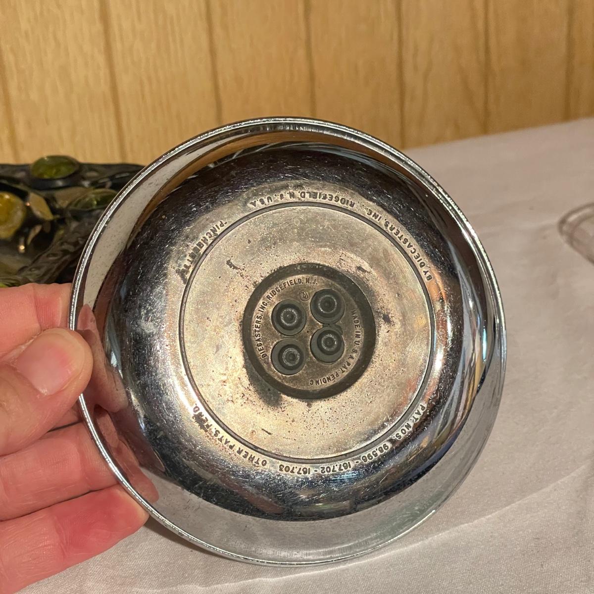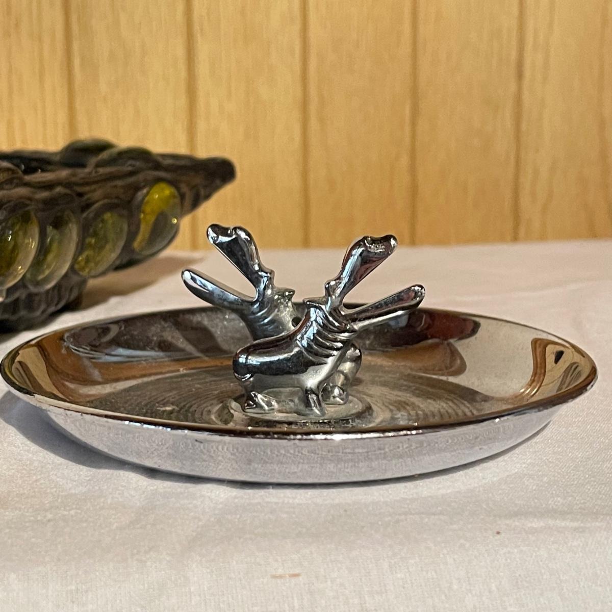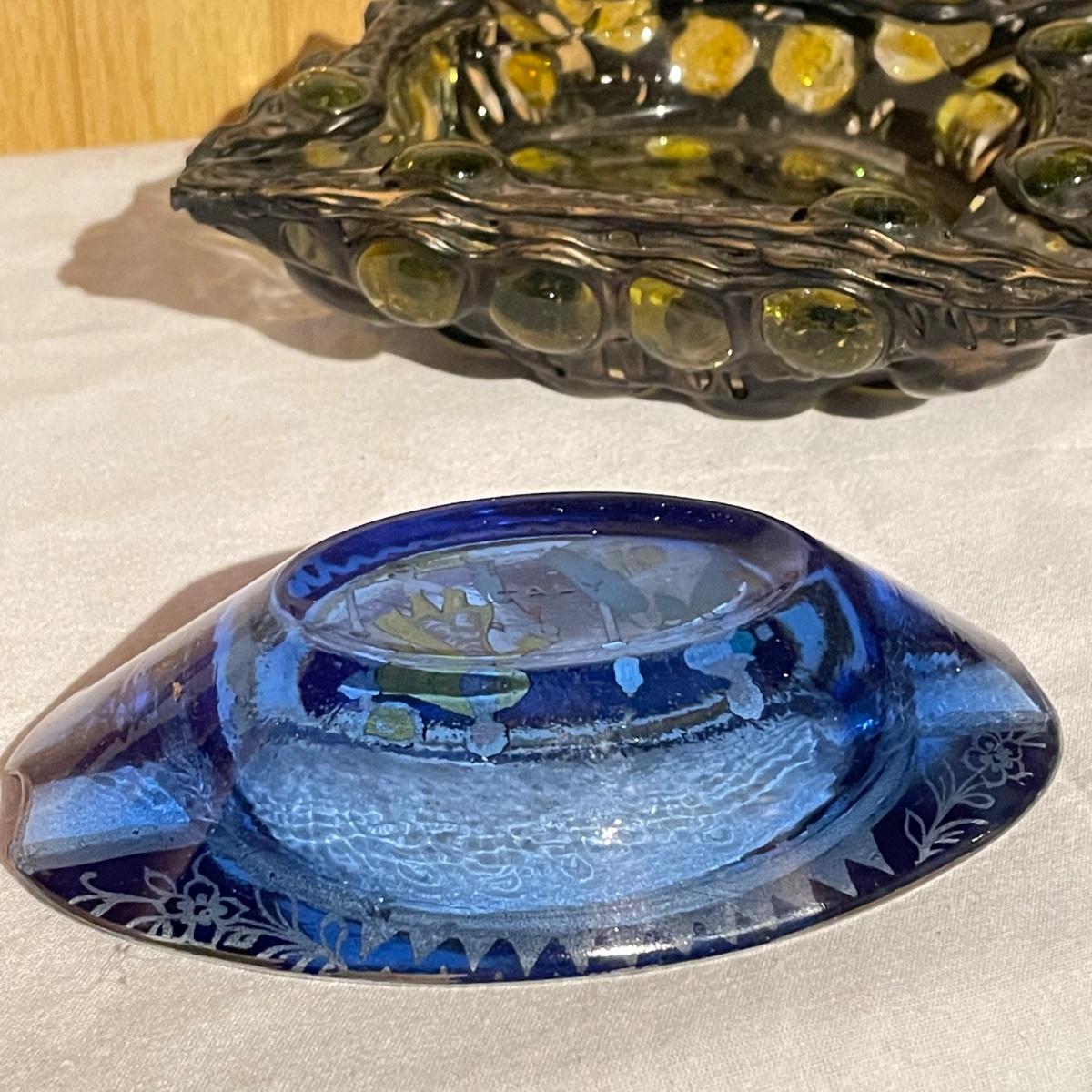 Lot features a heavy, large 6”sq lime green glass bead ashtray. The beads have been soldered to the astray with metal. A 3.75” sq teal enamel tray with a shield displaying the letters CASE, a clear blue Victorian painted ashtray plus a silver colored metal tray with two laughing hippos. See images. Shipping available.
