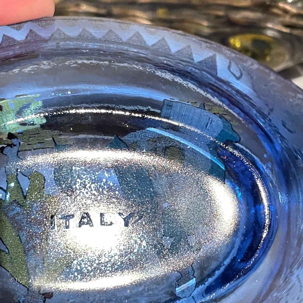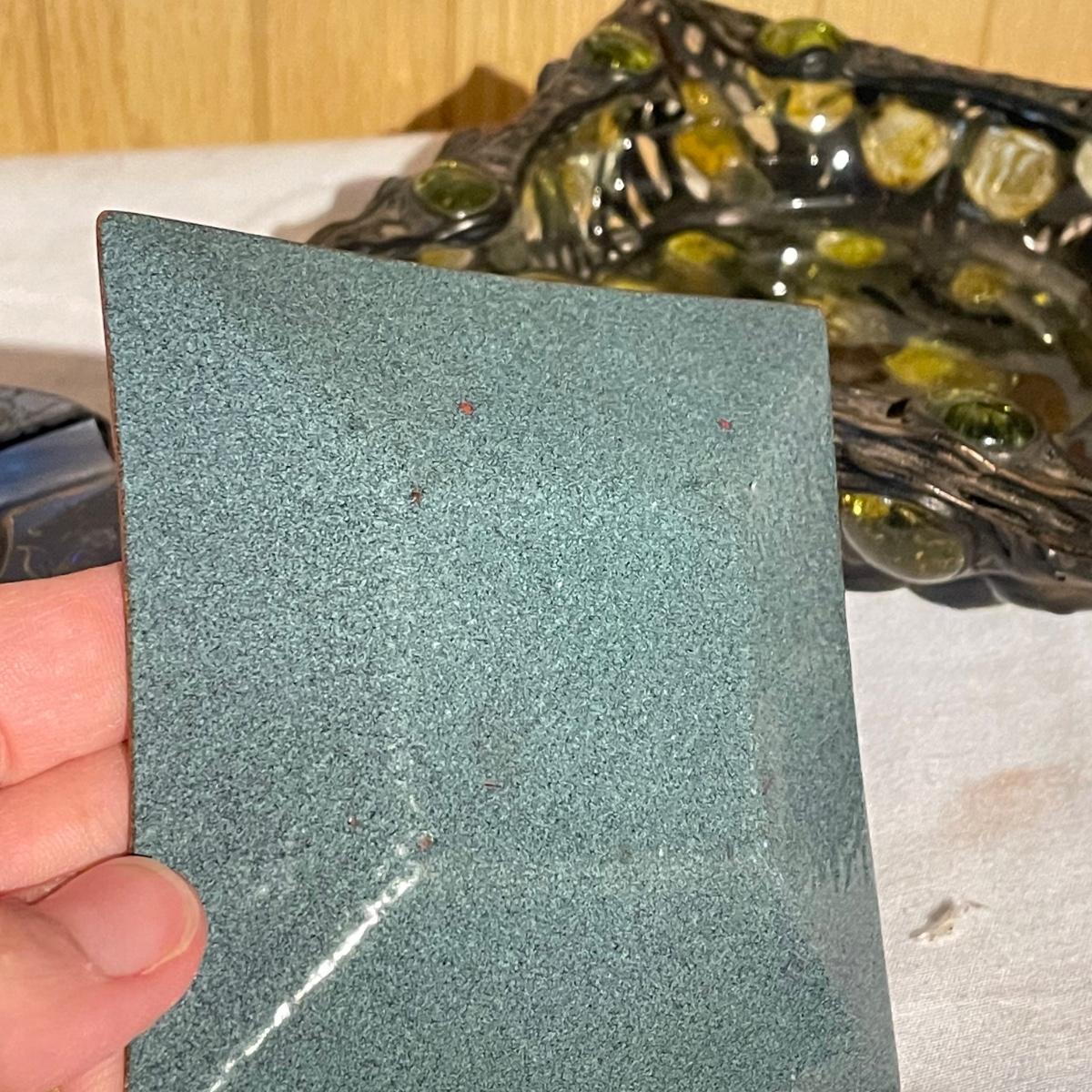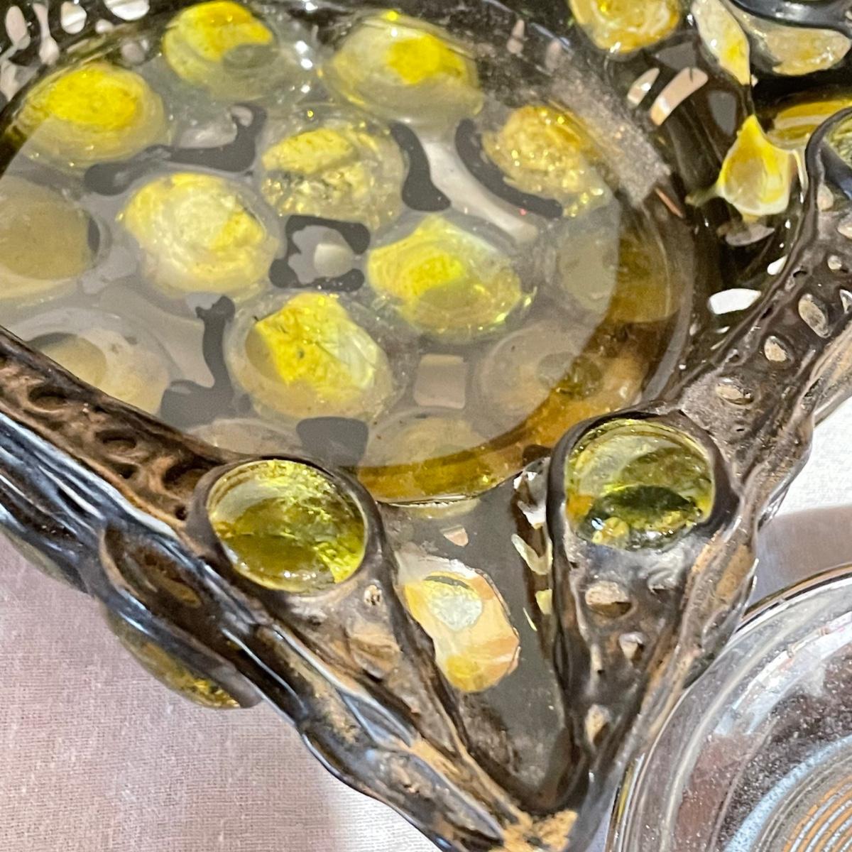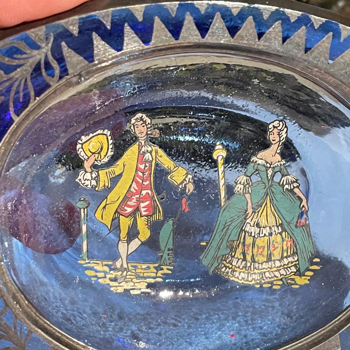 Lot features a heavy, large 6”sq lime green glass bead ashtray. The beads have been soldered to the astray with metal. A 3.75” sq teal enamel tray with a shield displaying the letters CASE, a clear blue Victorian painted ashtray plus a silver colored metal tray with two laughing hippos. See images. Shipping available.