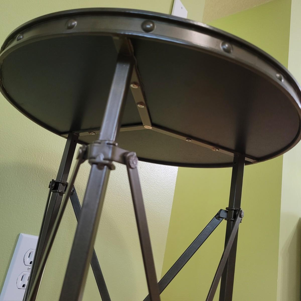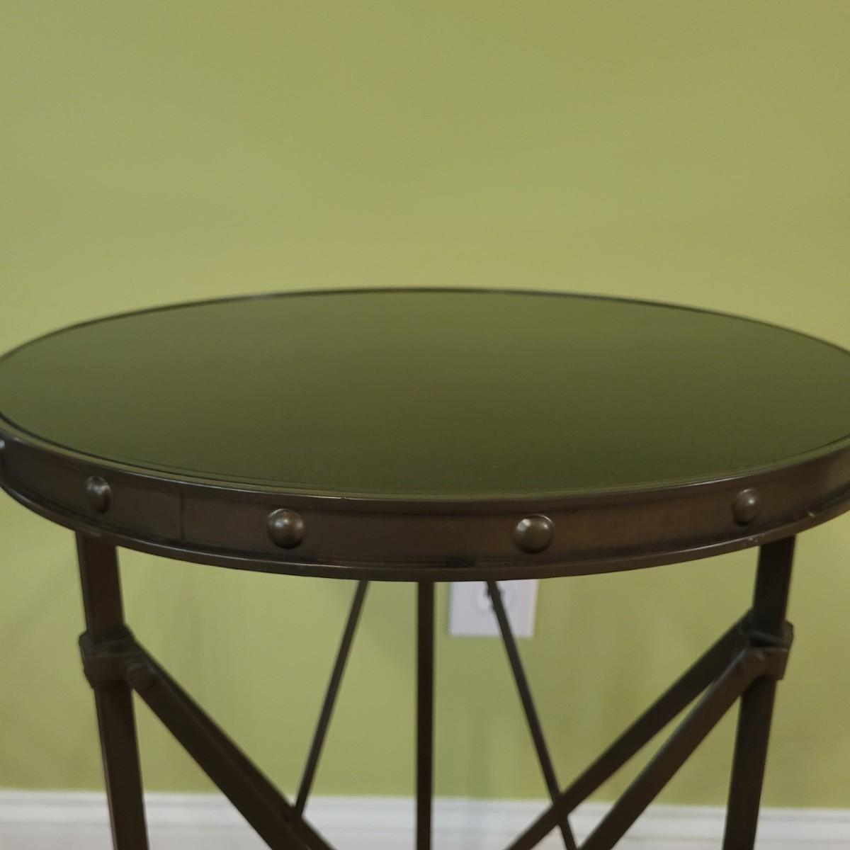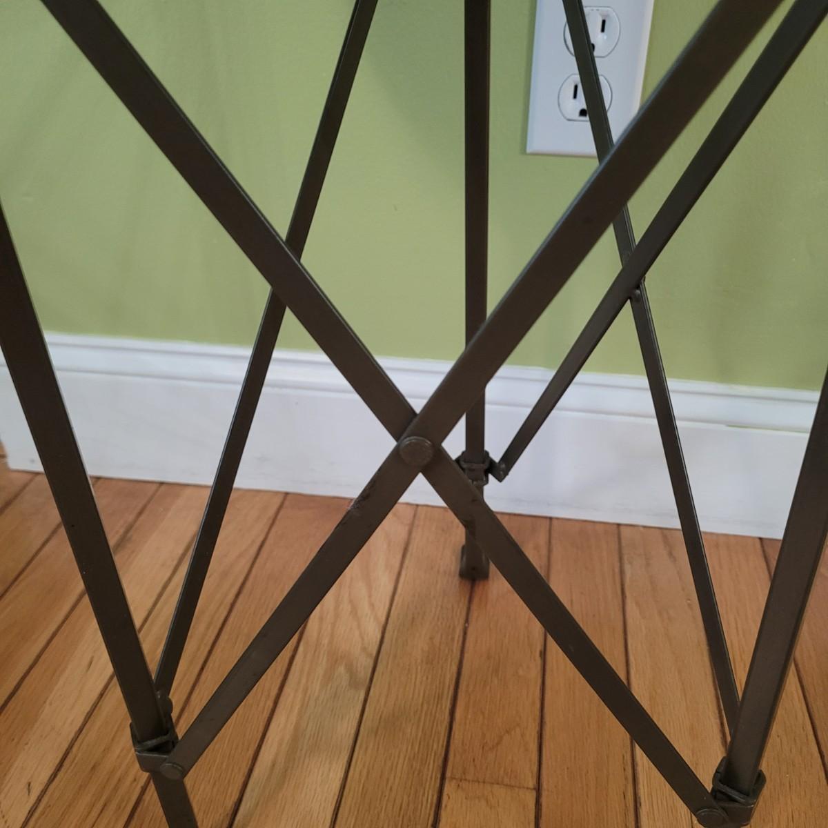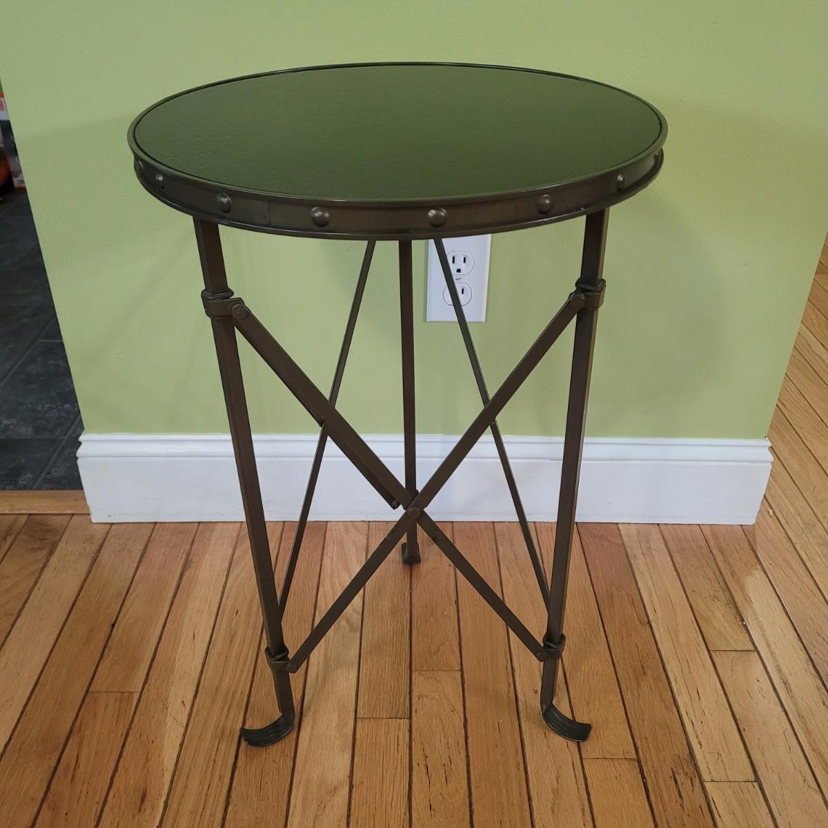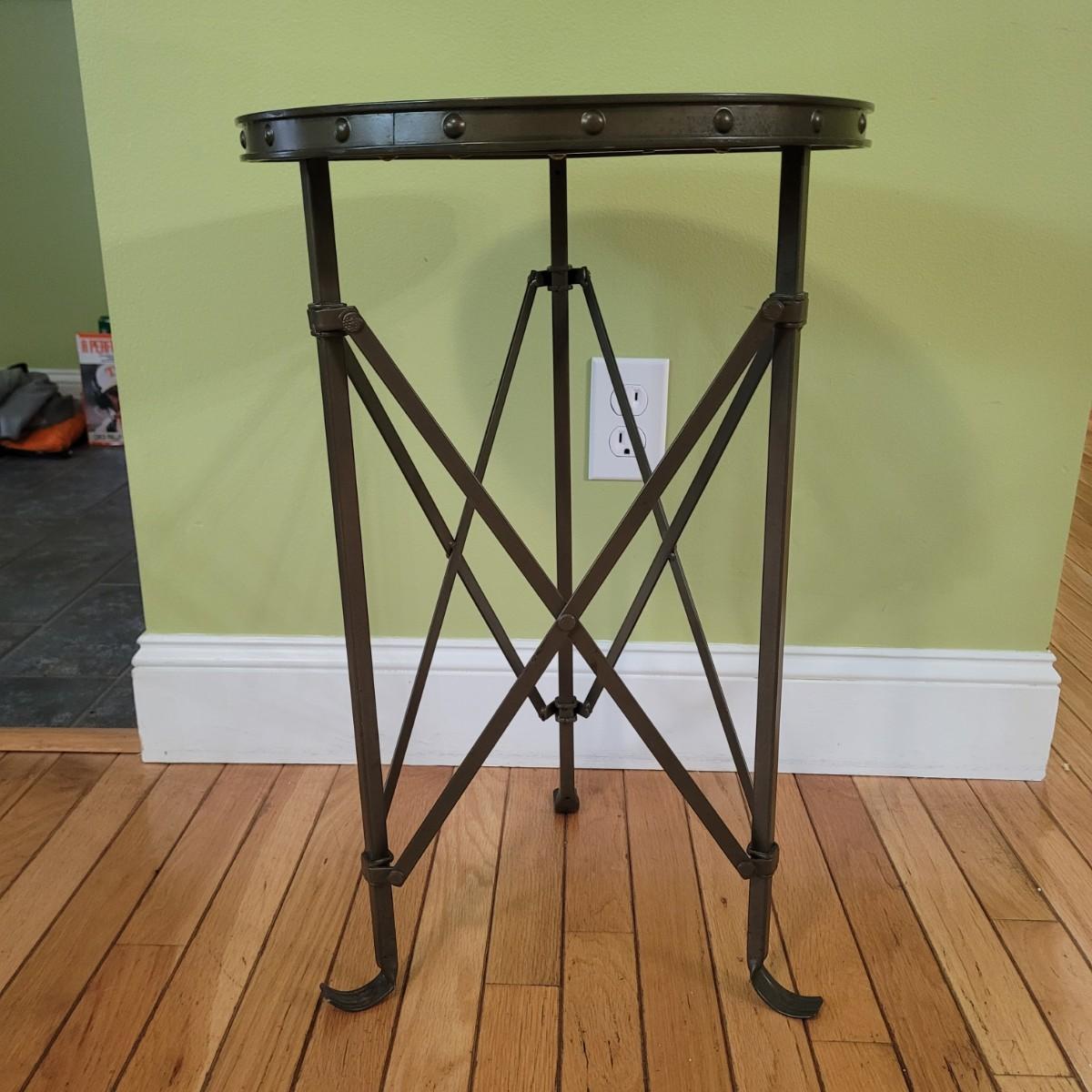 This lot includes a metal end table with a heavy top that appears to be marble. The base is made from crisscrossed metal arms and legs. The top is made from a metal ring that encompasses the round stone piece. The table measures 15" x 15" x 24"H.