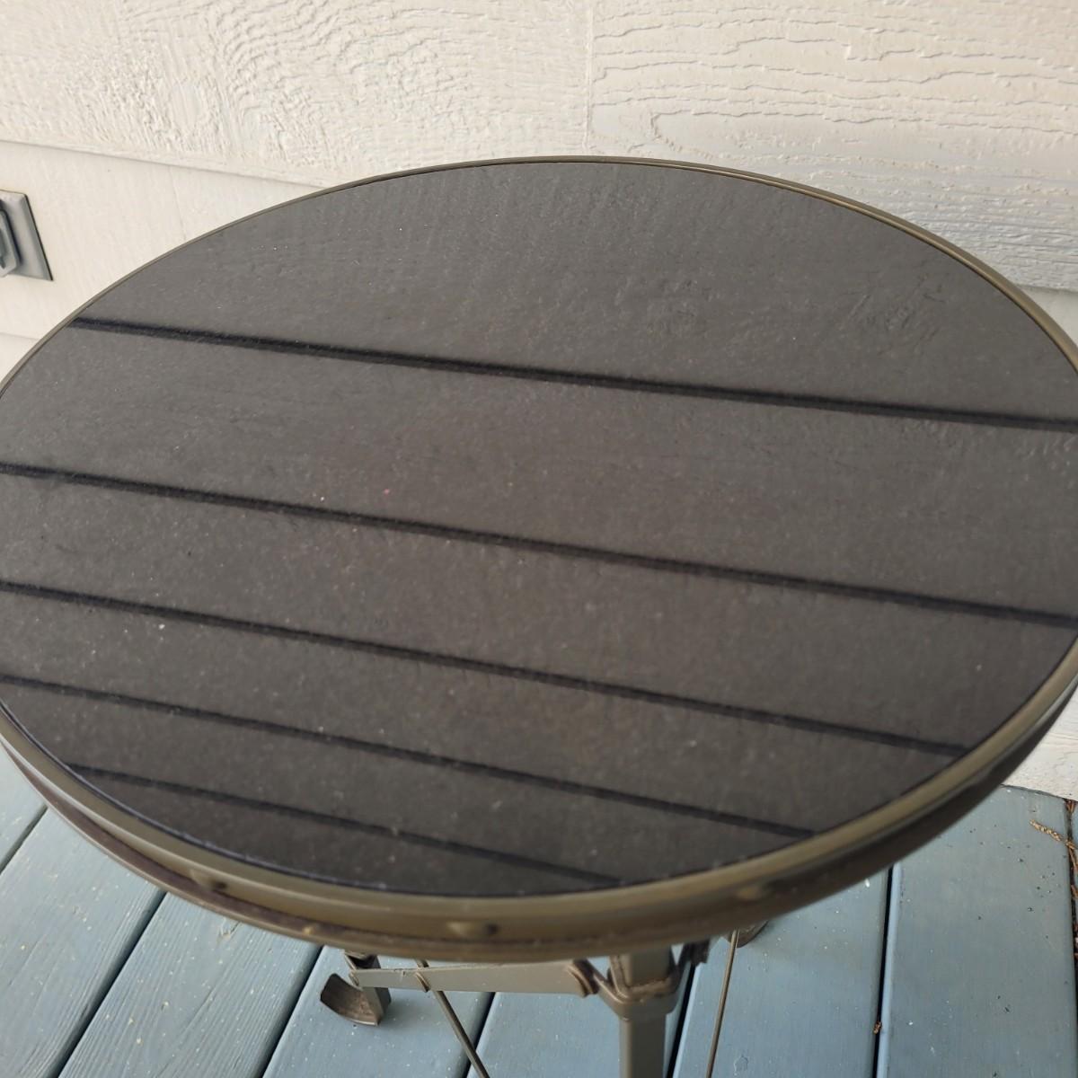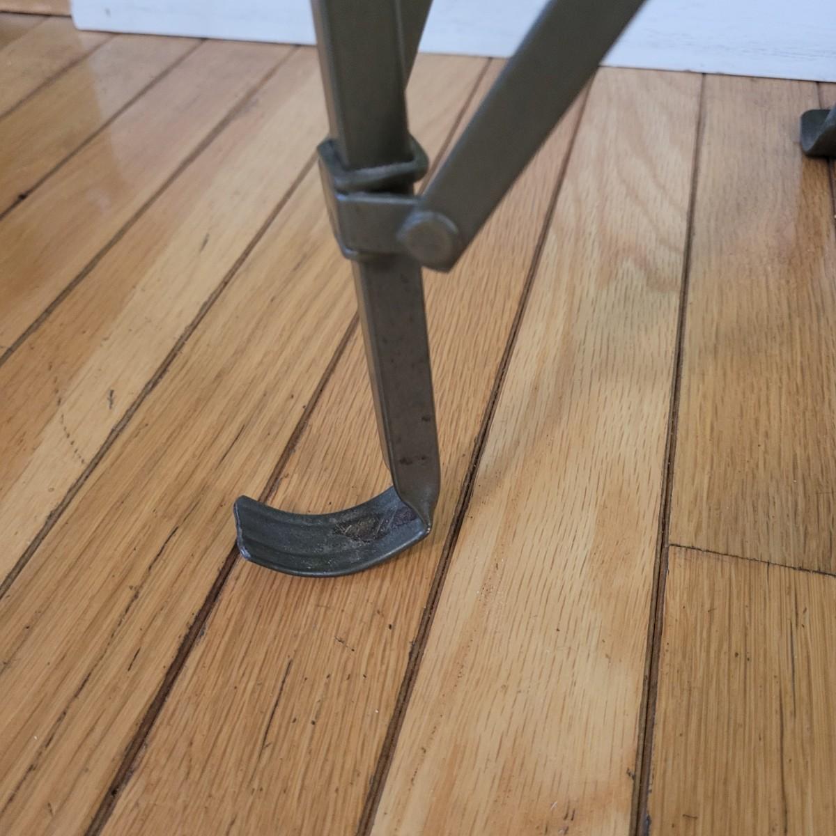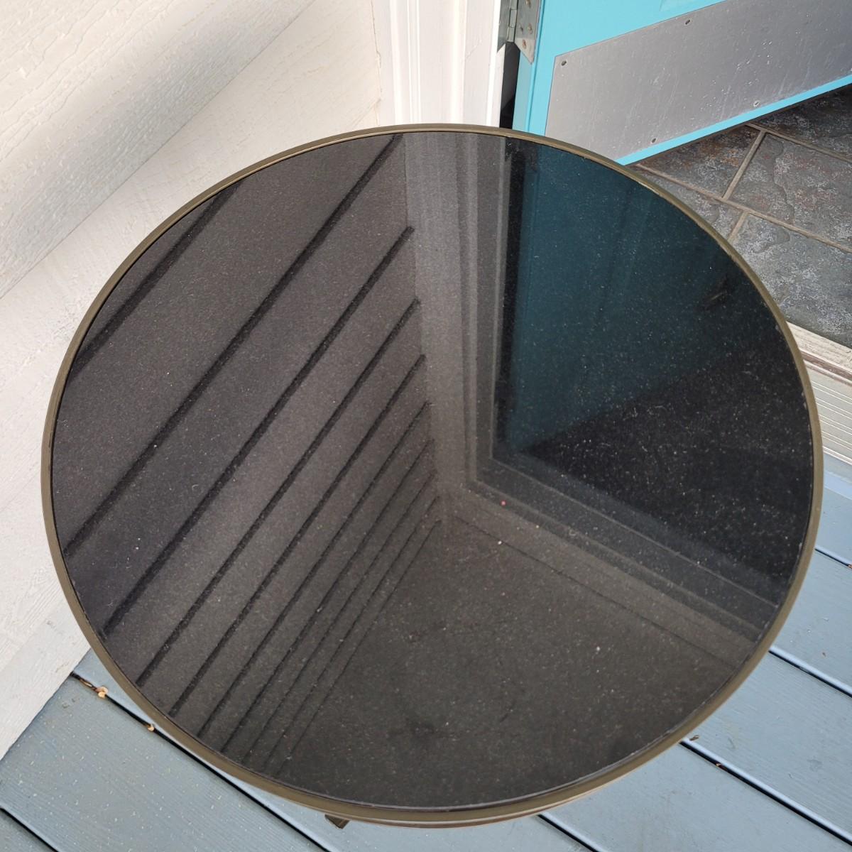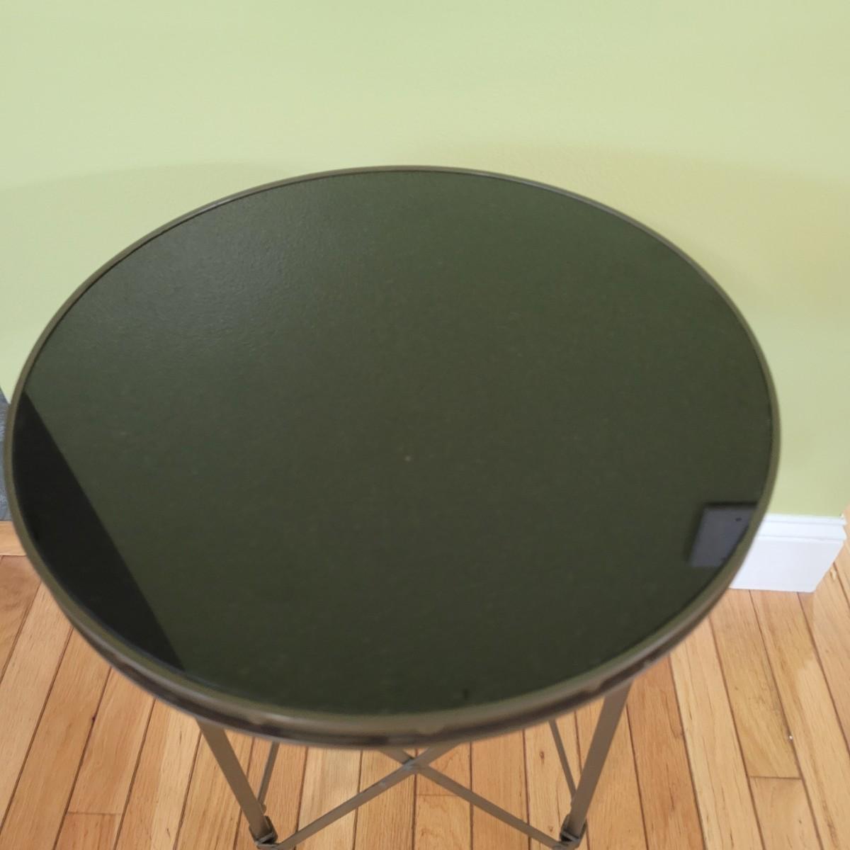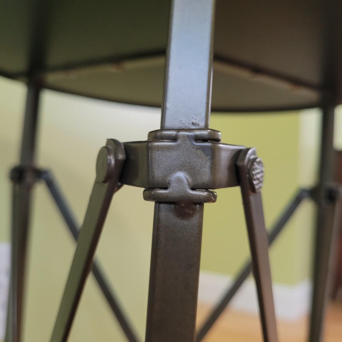 This lot includes a metal end table with a heavy top that appears to be marble. The base is made from crisscrossed metal arms and legs. The top is made from a metal ring that encompasses the round stone piece. The table measures 15" x 15" x 24"H.