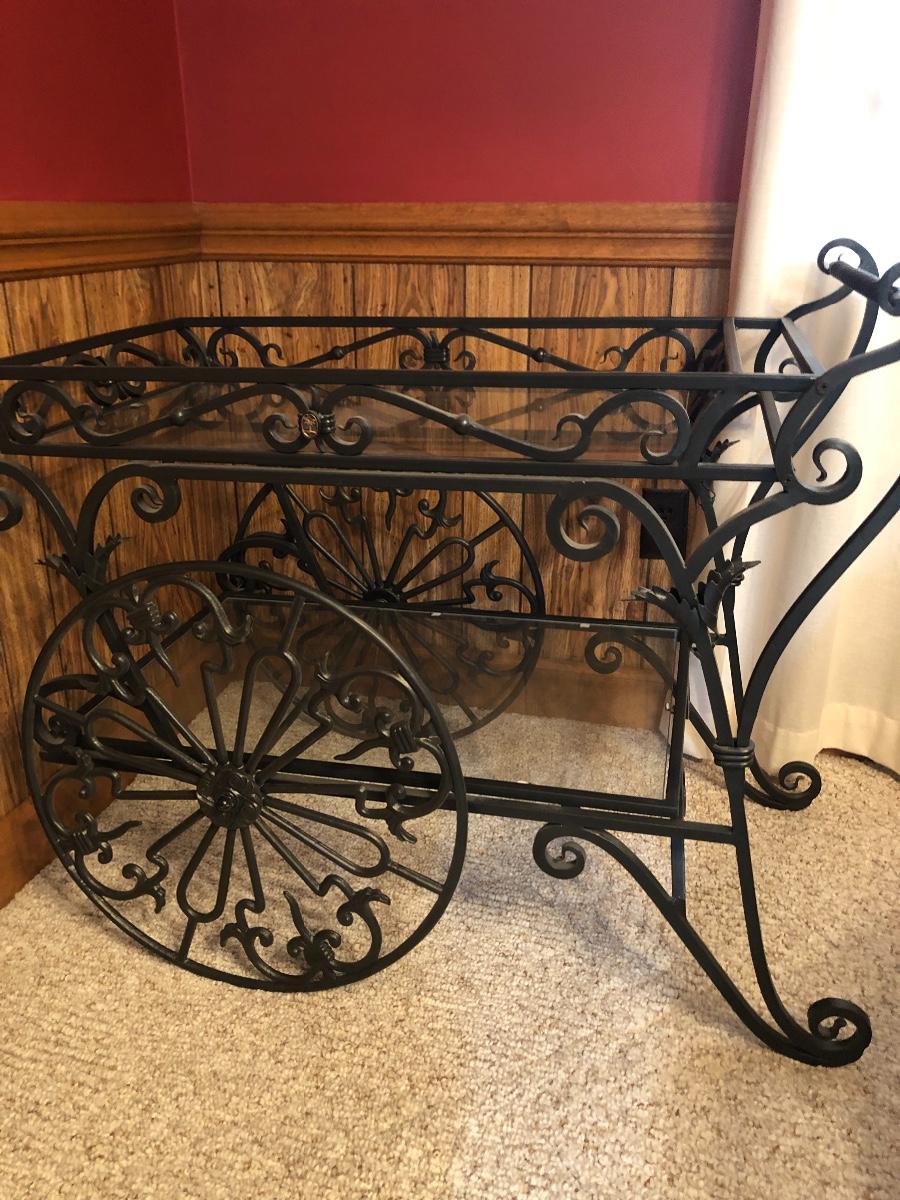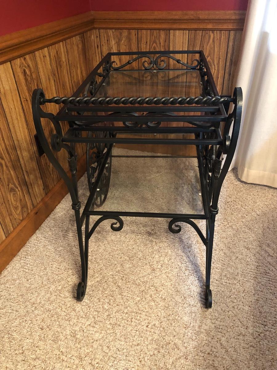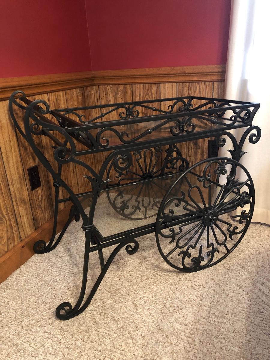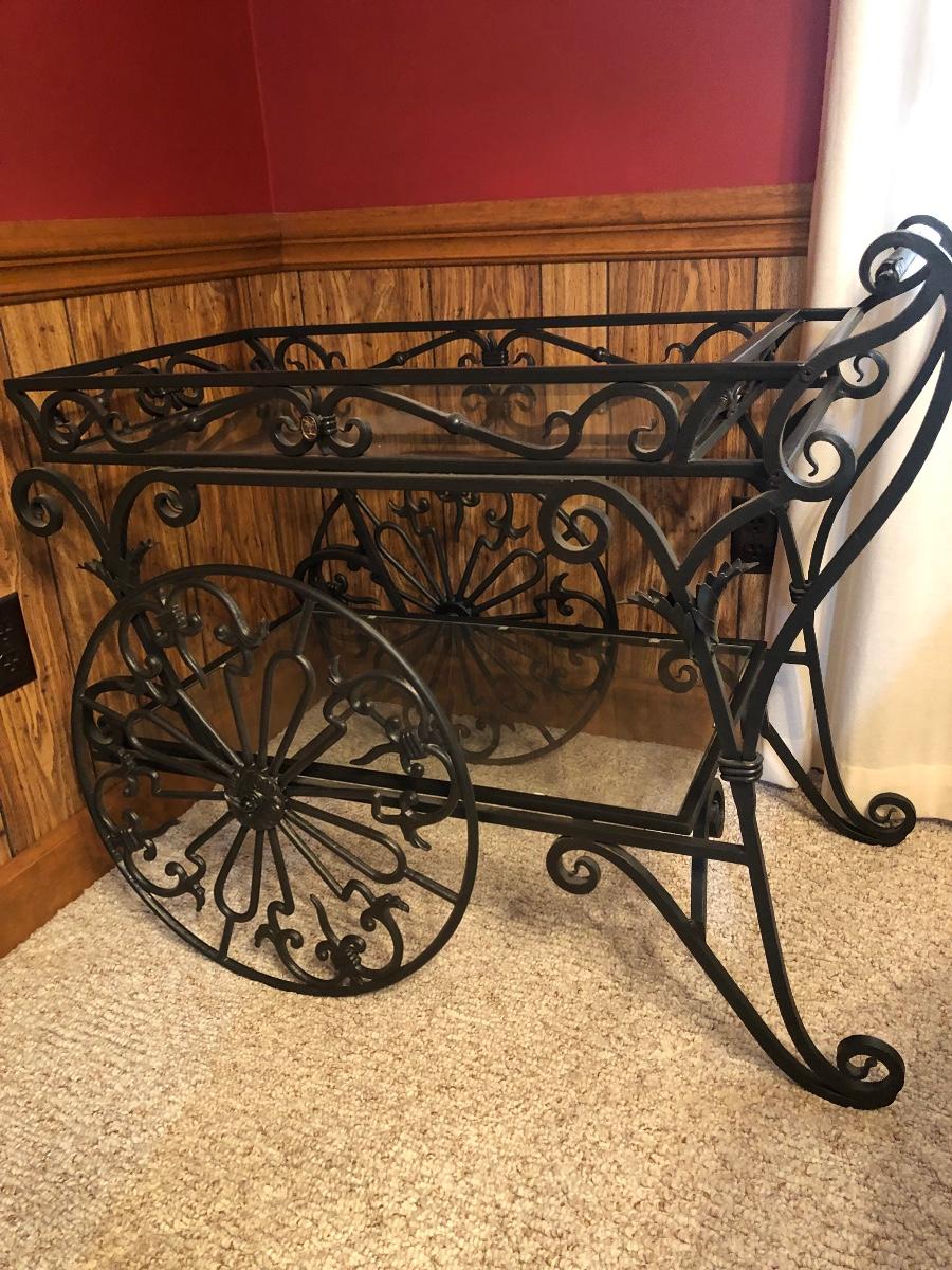 This cart has two glass shelves and is made of wrought iron. Although the cart is heavy duty, it moves easily on its’ two large wheels. Dimensions are 36” x 18” x 31”. Local pick up only.