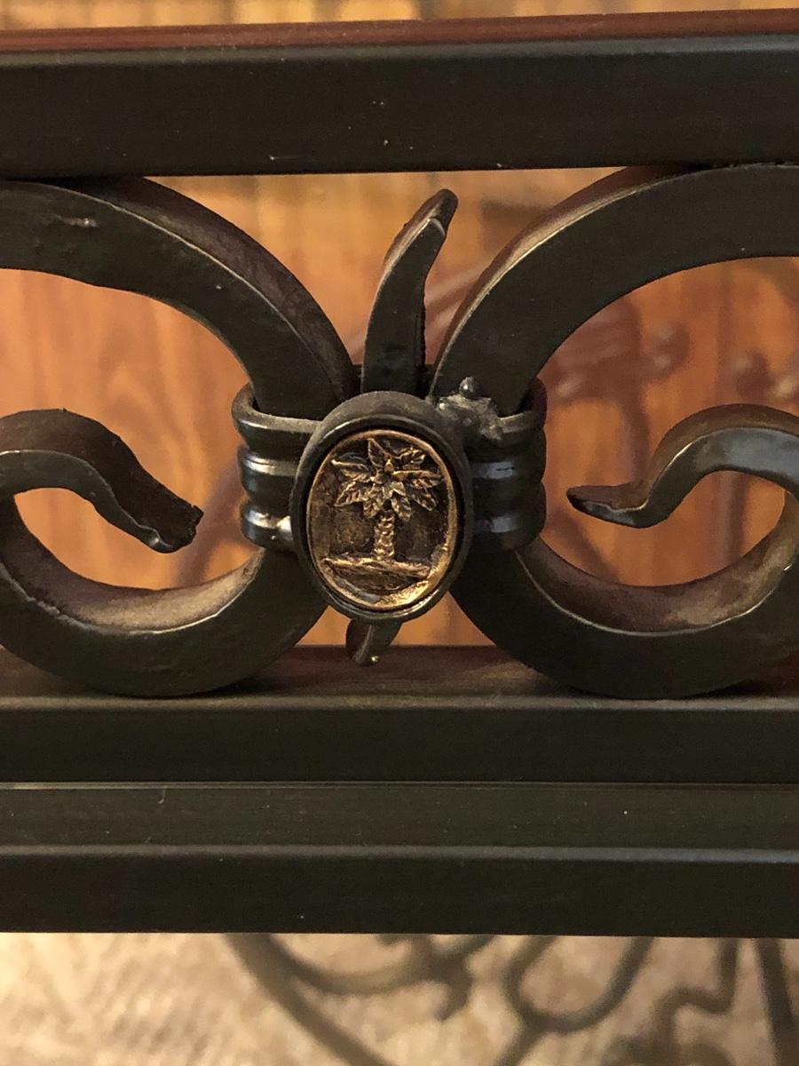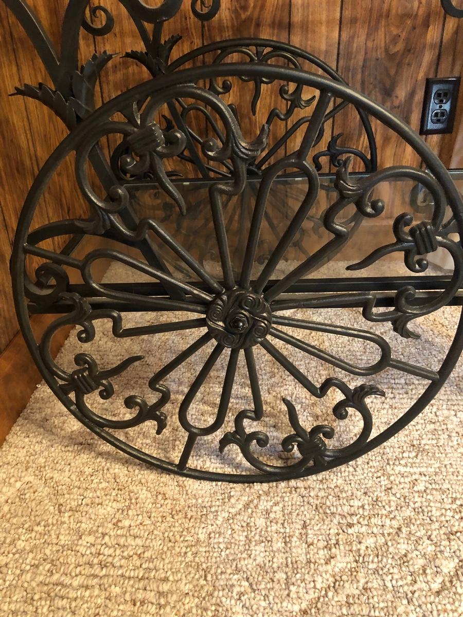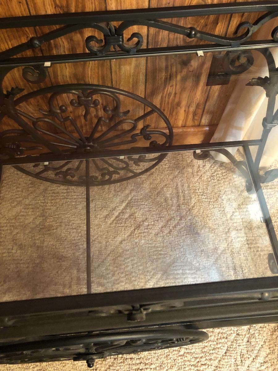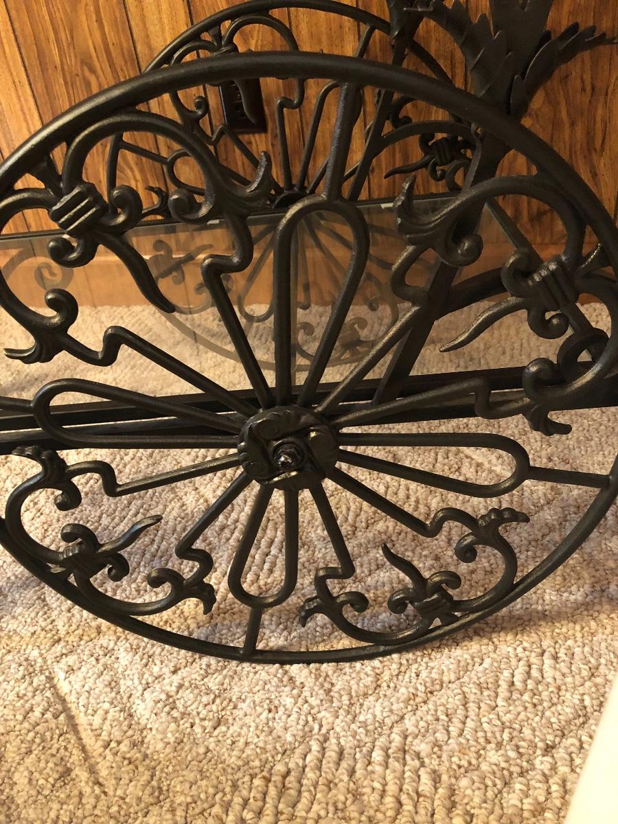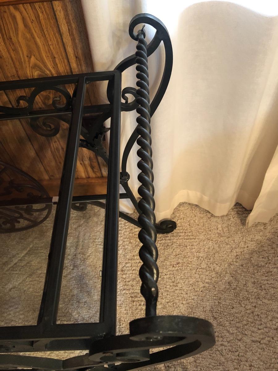 This cart has two glass shelves and is made of wrought iron. Although the cart is heavy duty, it moves easily on its’ two large wheels. Dimensions are 36” x 18” x 31”. Local pick up only.