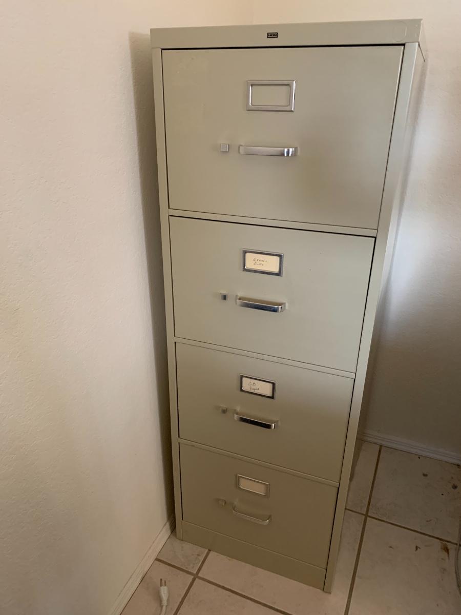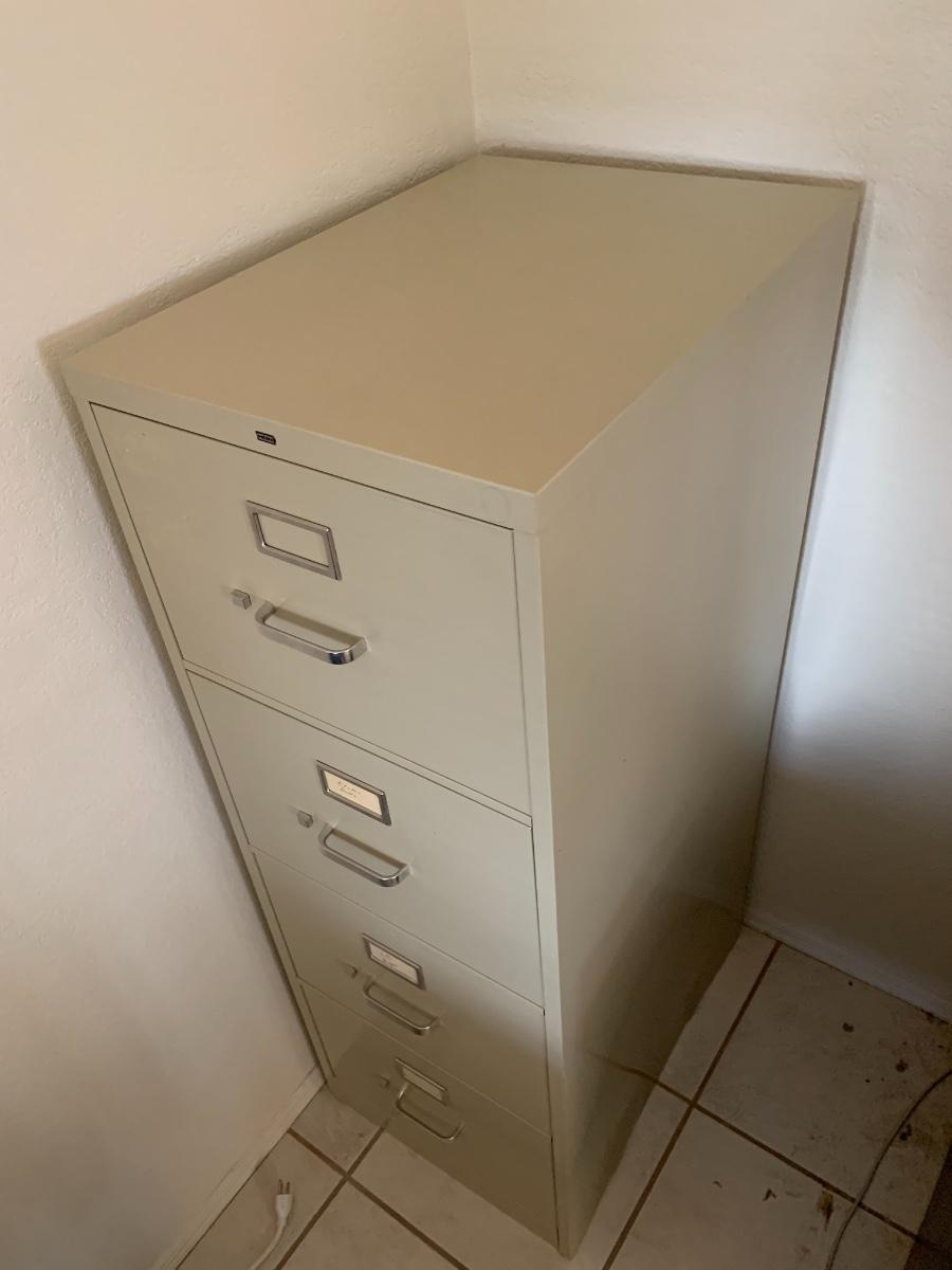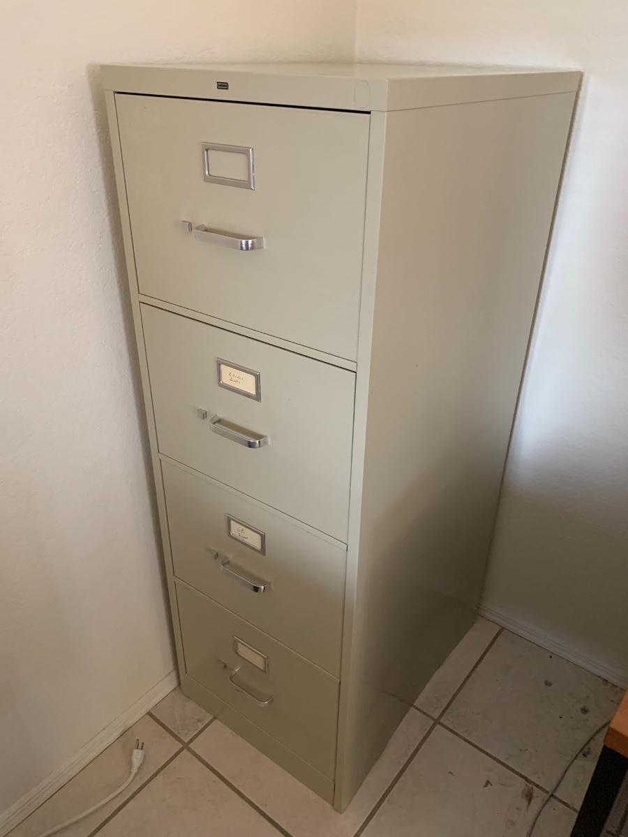 Metal file cabinet, 4 drawers. No lock, good condition. 52” tall x 18” wide x 25” deep