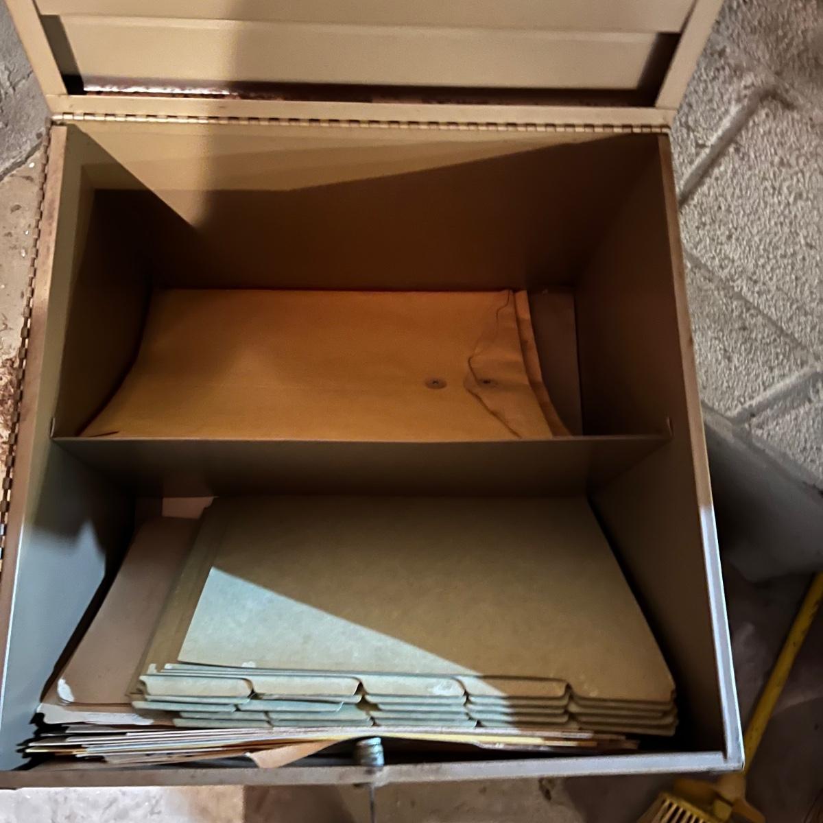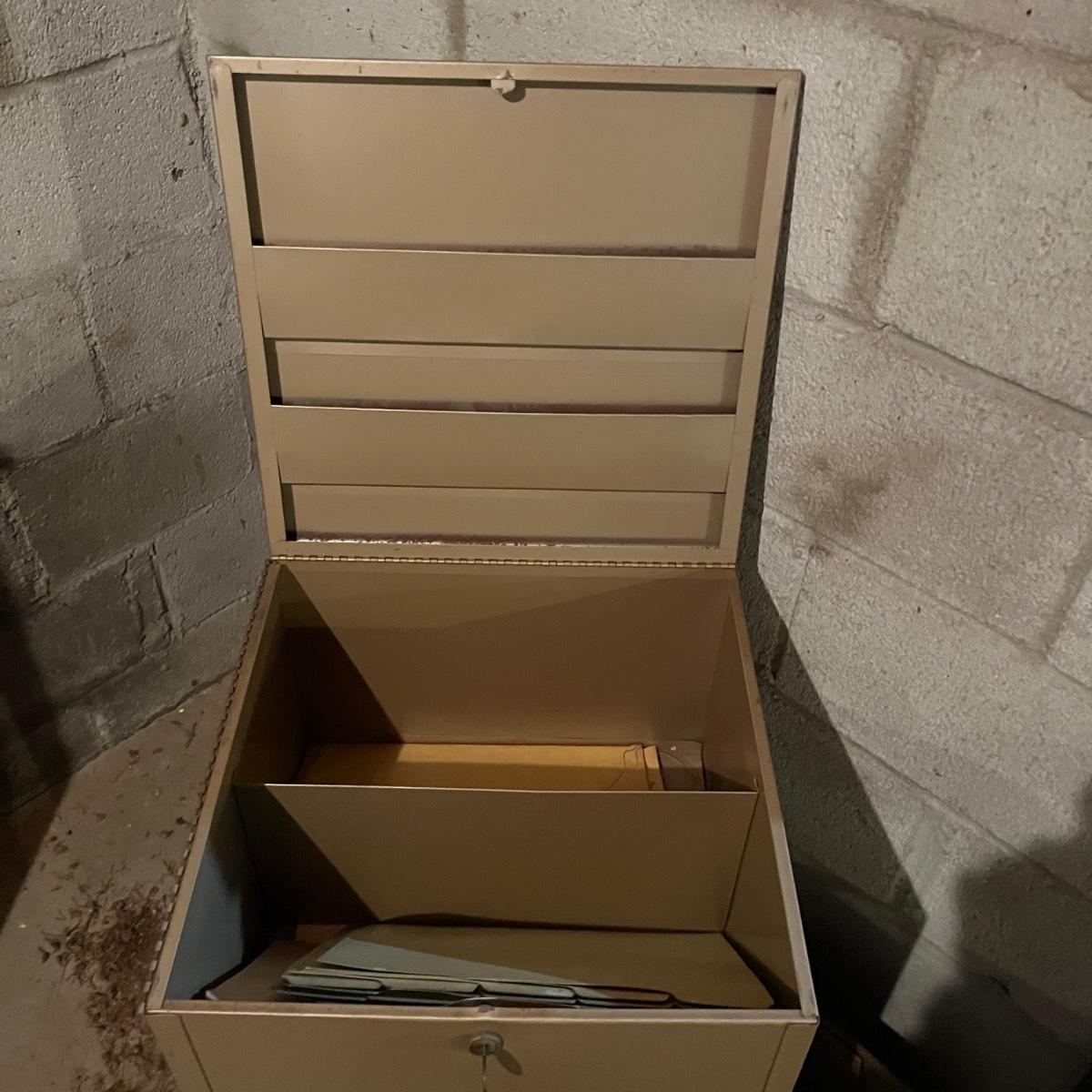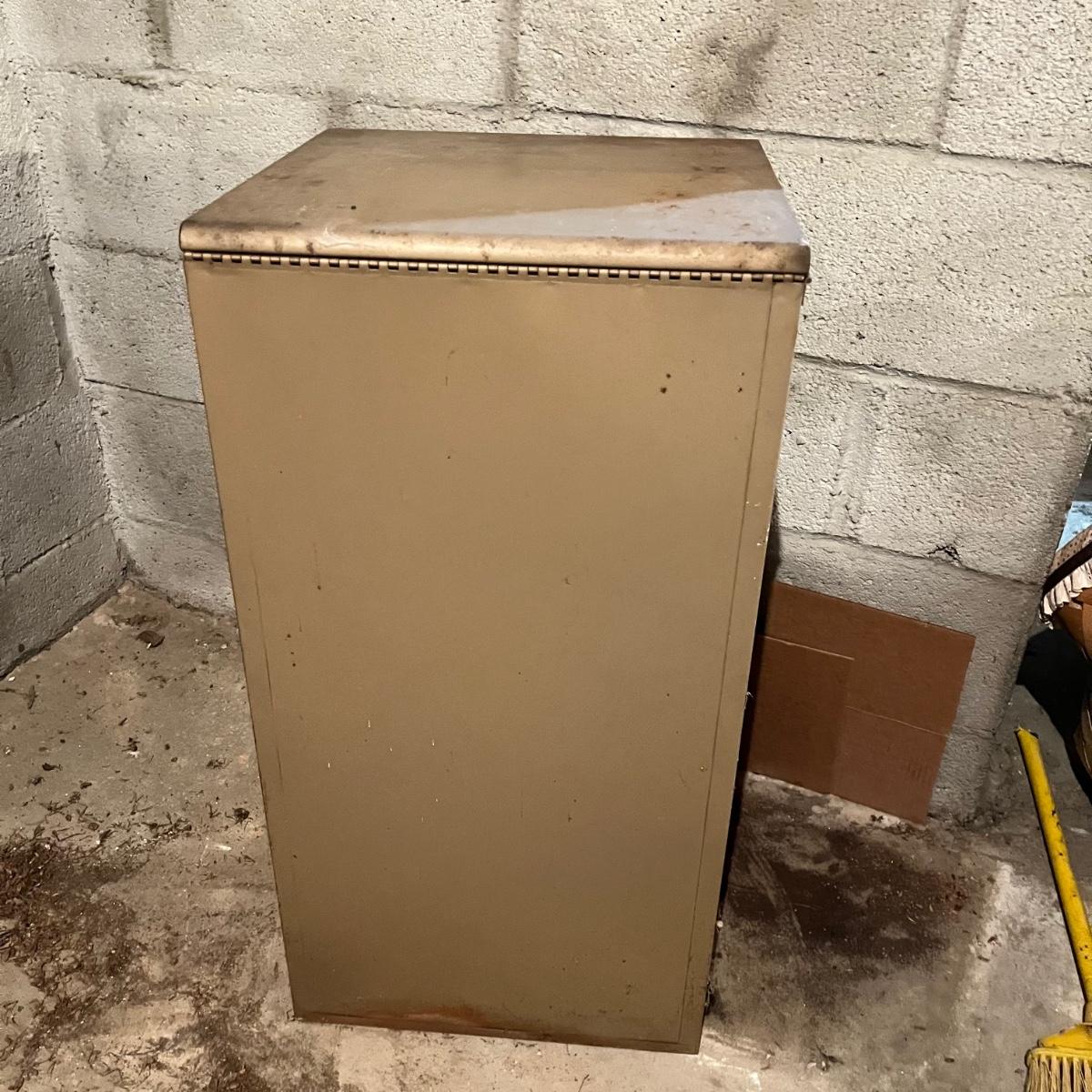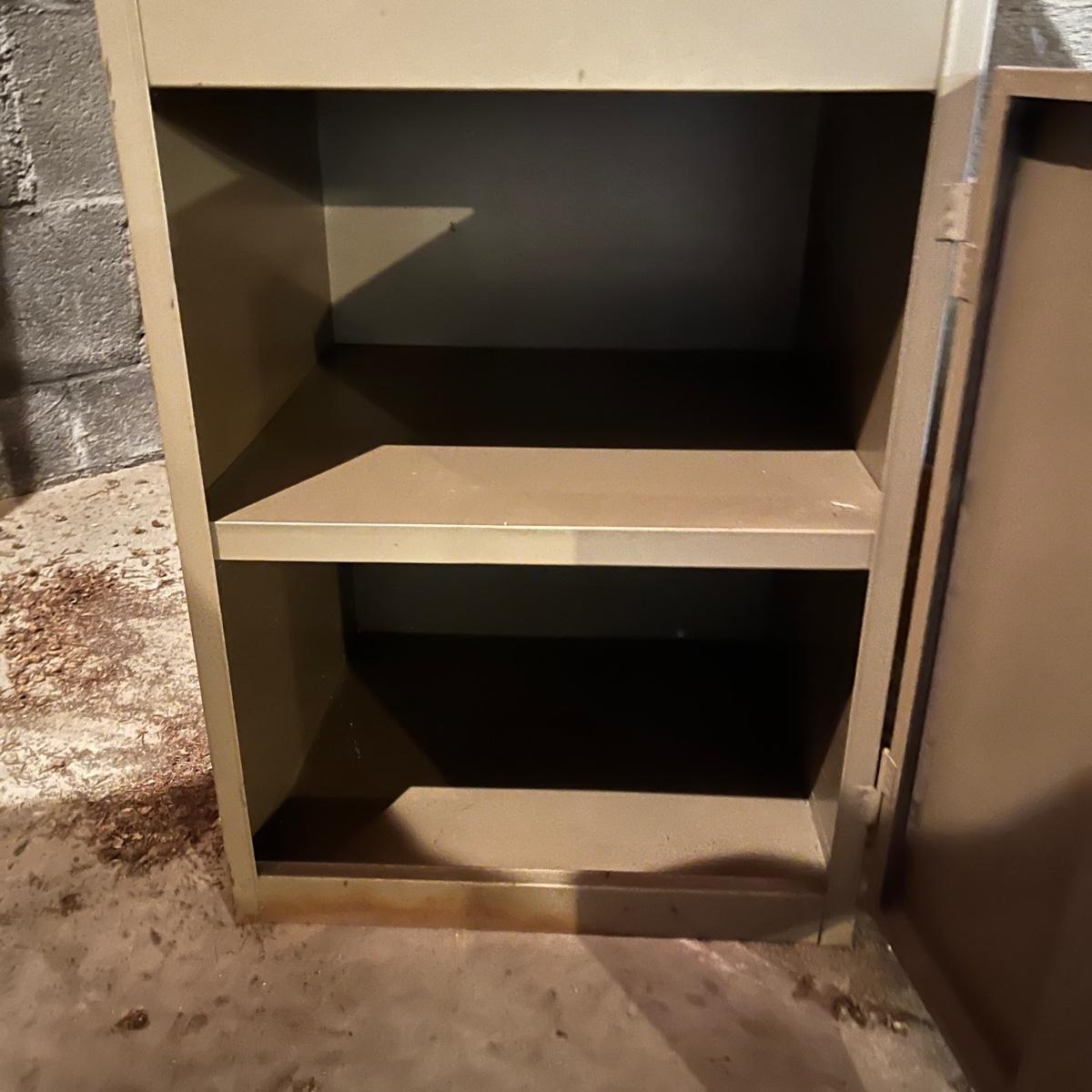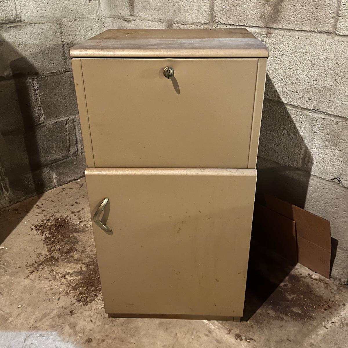 Lot includes a metal file cabinet with lockable top and a cabinet underneath. Key included. Cabinet measures 15.5” x 16.5” x 30”. Cabinet has scratches and nicks, see pictures.