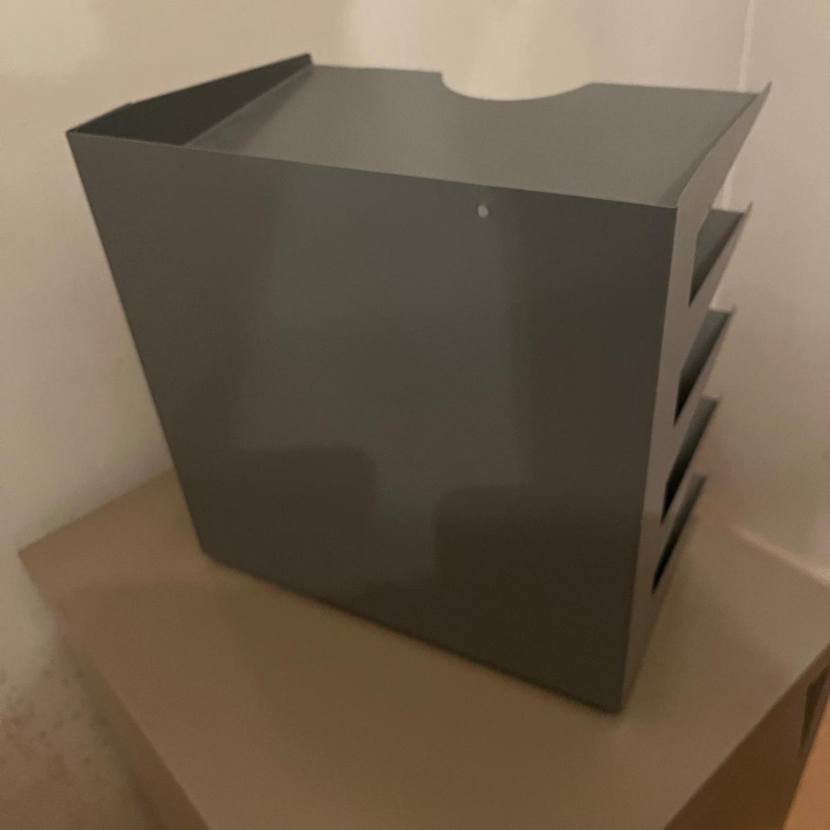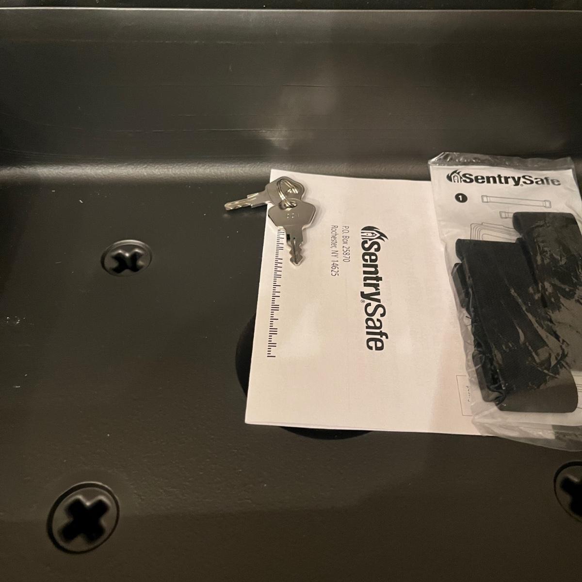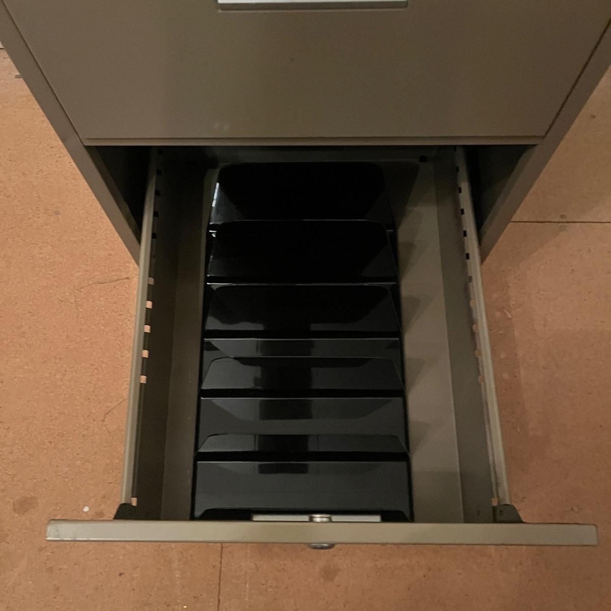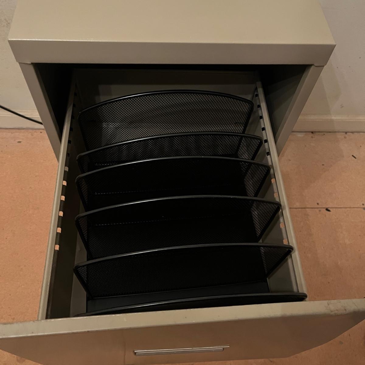 Lot includes one metal two drawer file cabinet, one four drawer metal file cabinet, Sentry Safe lockbox with keys and a metal in/out box. Four drawer cabinet measures 15” x 28” x 52”H.