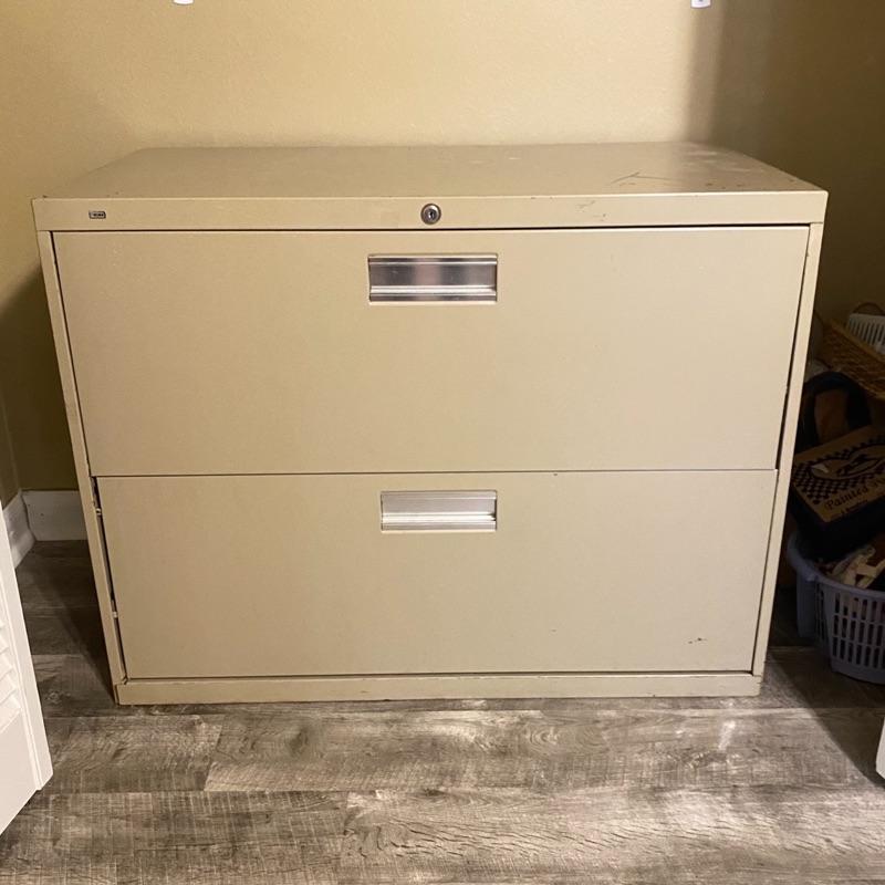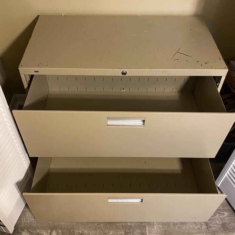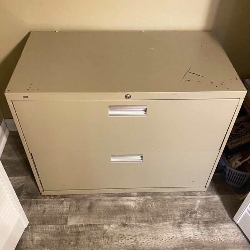 No inside hardware or file hanging bars / No Keys / Can be used for storage / 36” L x 19” D x 28” H