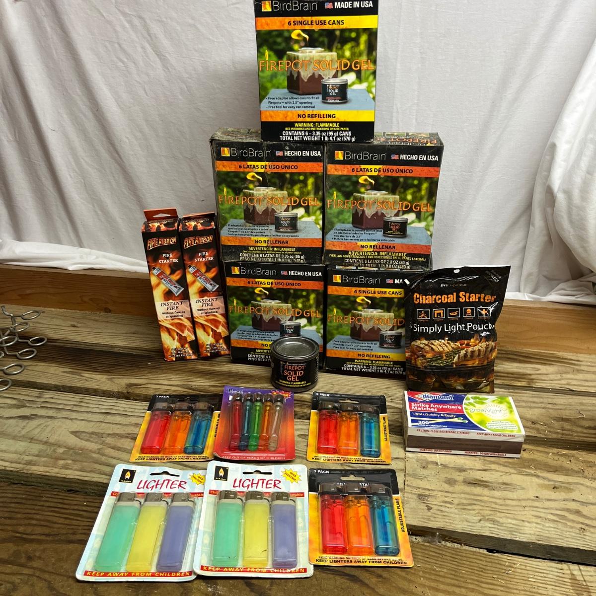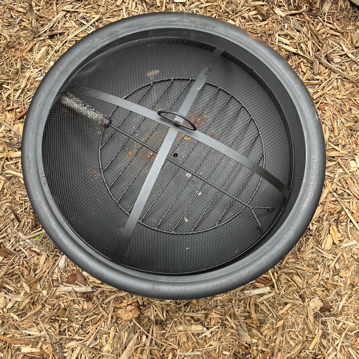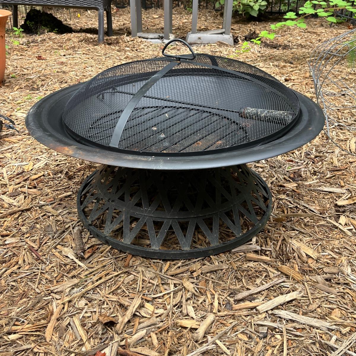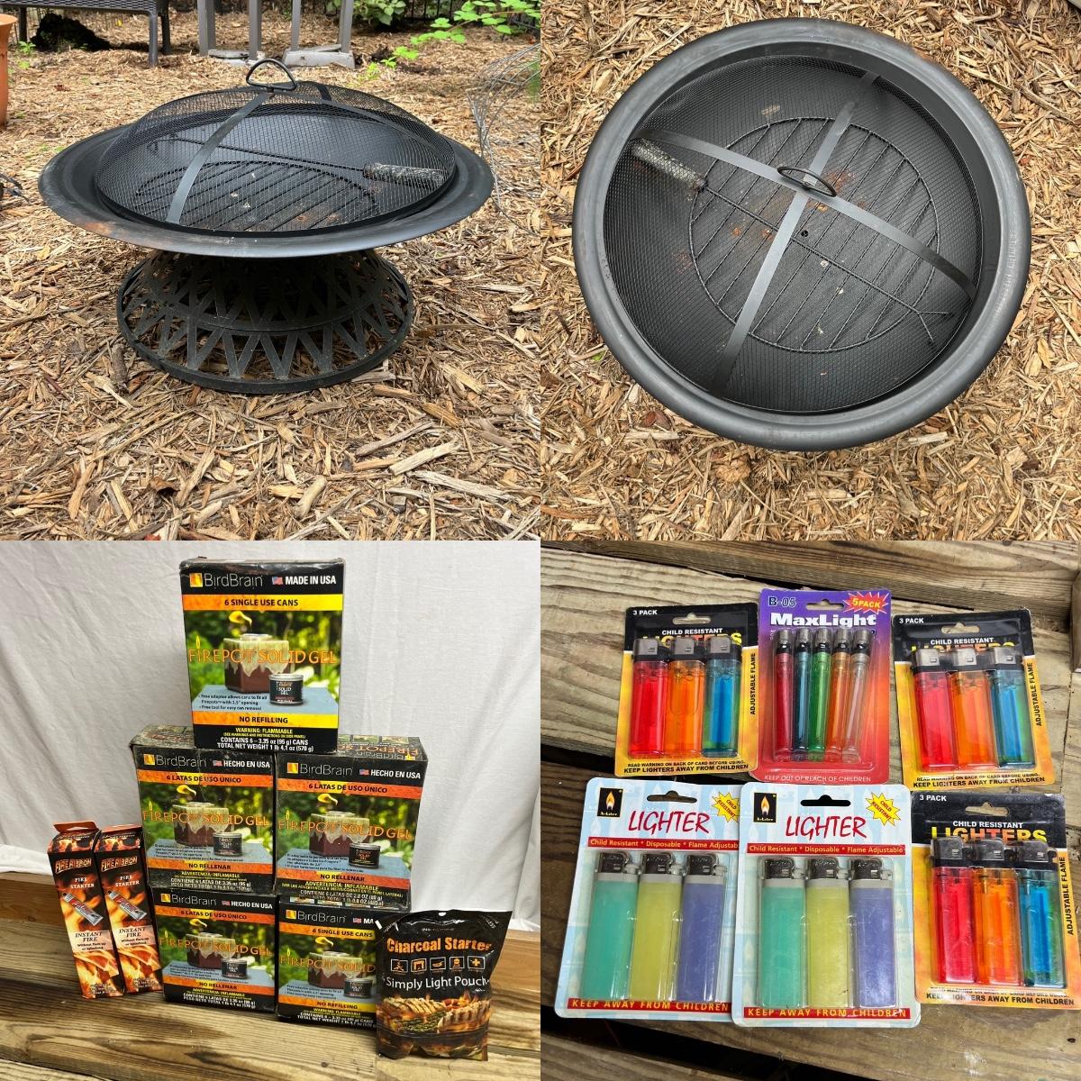 Lot includes a metal fire pit with mesh cover, plastic cover and grate. Also includes lighters, fire starter gel and more. While products appear unopened, we cannot verify quality of contents. Fire pit measures 30”D x 20”H. Cover has rips, see pictures.