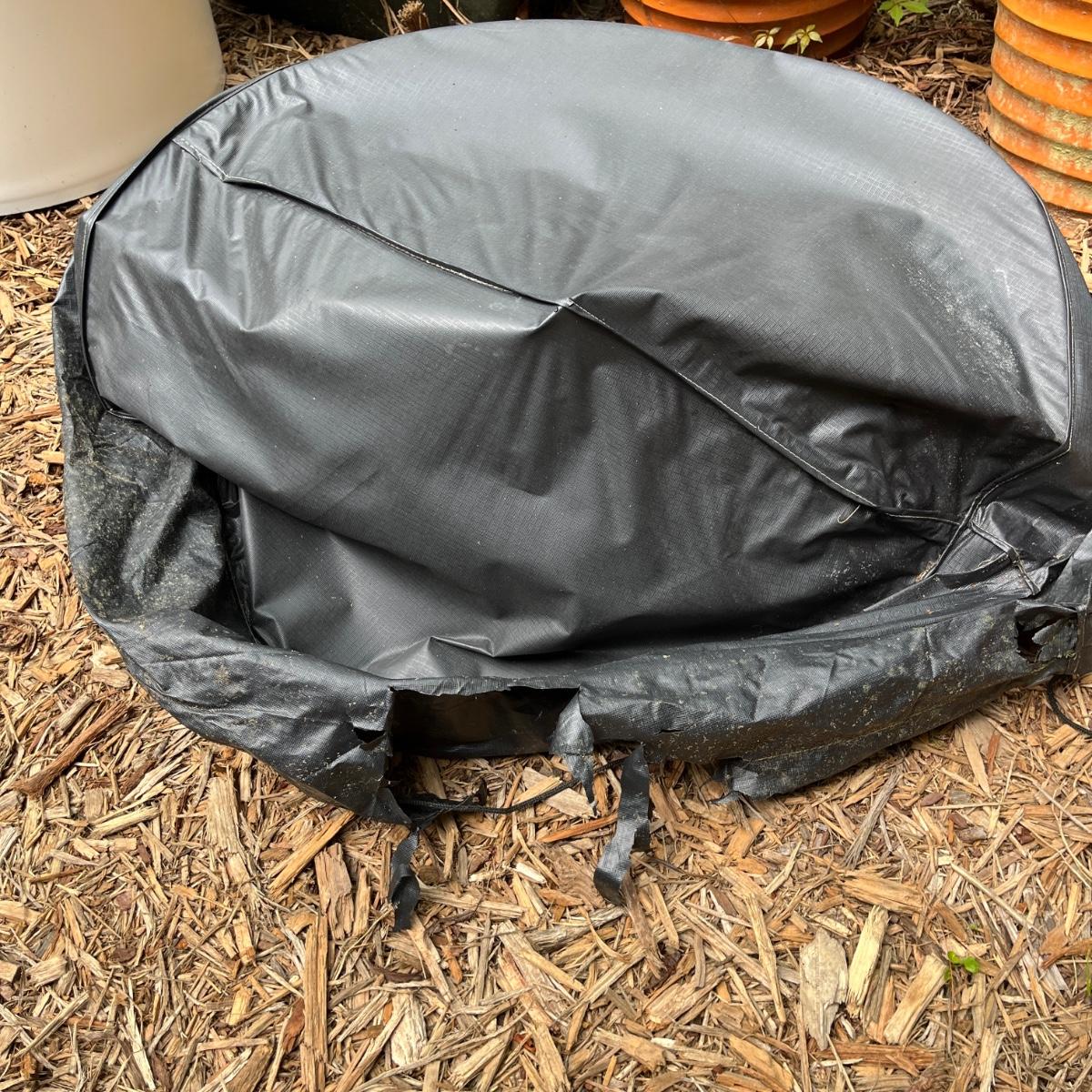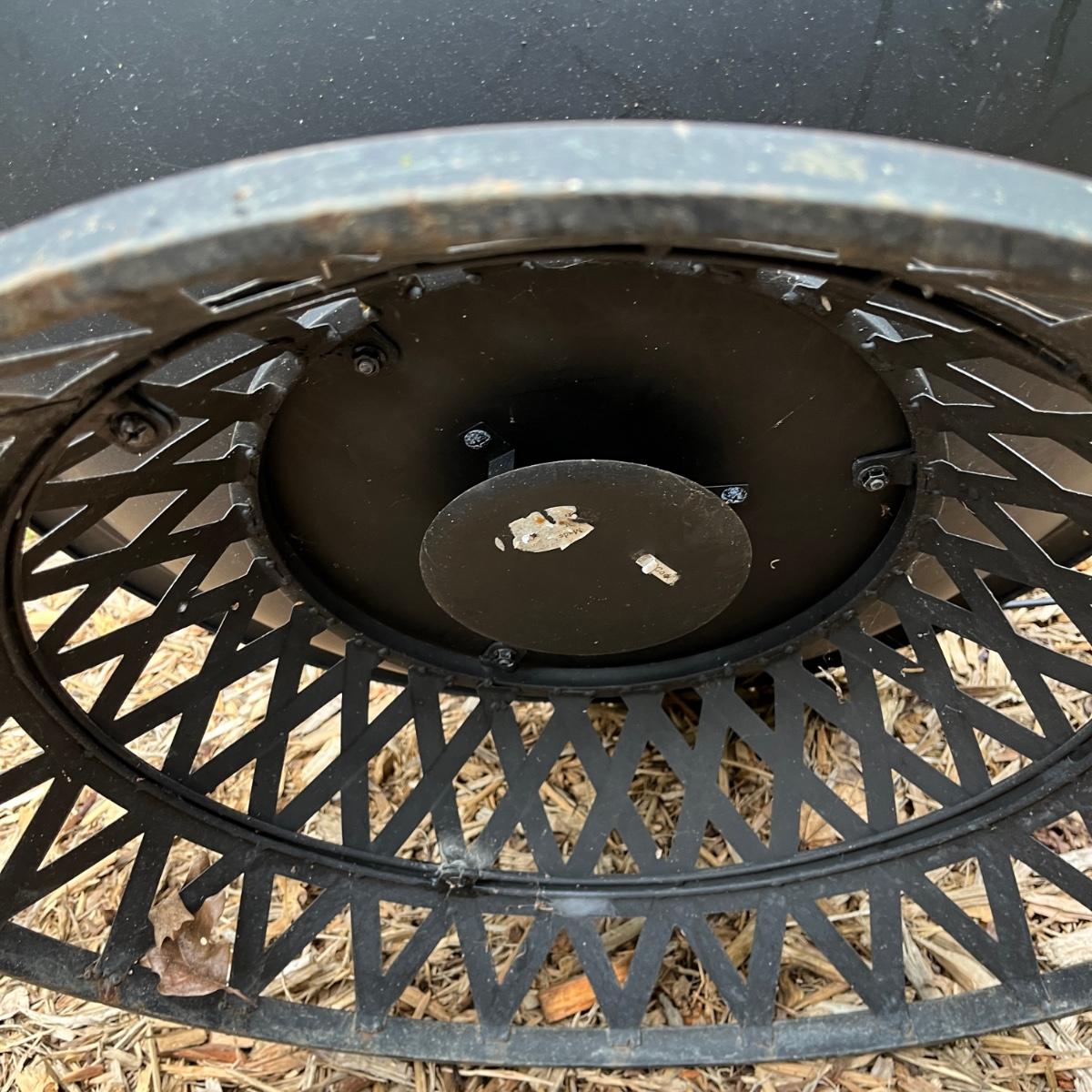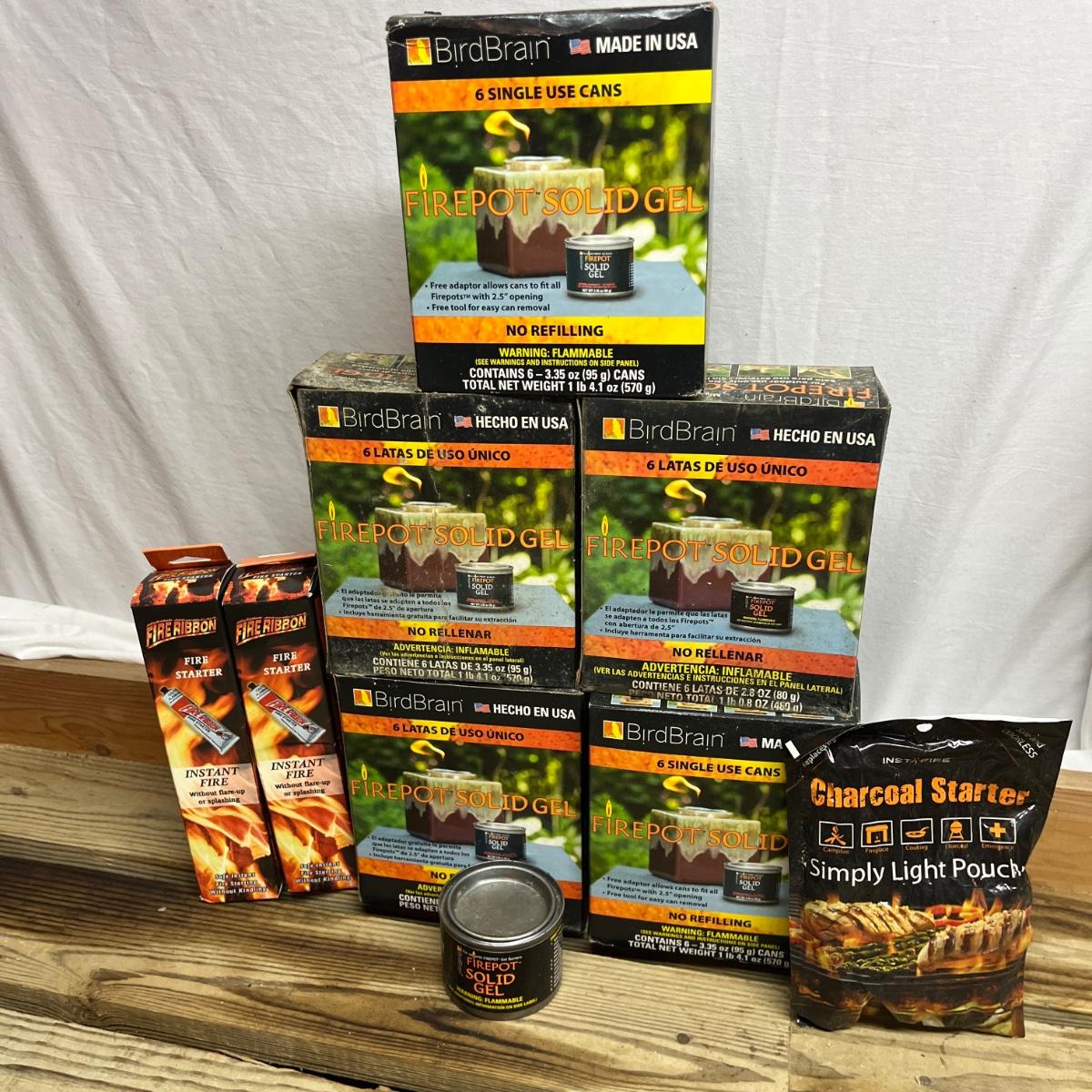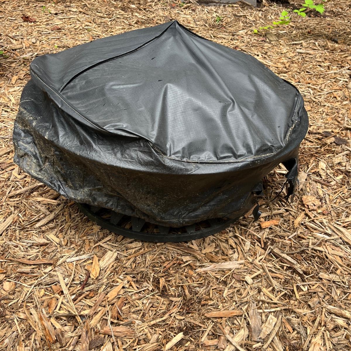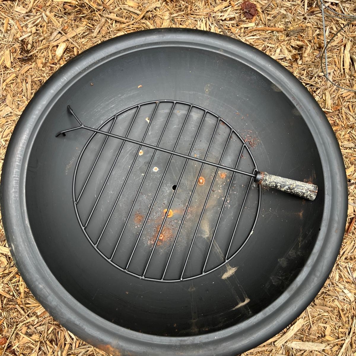 Lot includes a metal fire pit with mesh cover, plastic cover and grate. Also includes lighters, fire starter gel and more. While products appear unopened, we cannot verify quality of contents. Fire pit measures 30”D x 20”H. Cover has rips, see pictures.