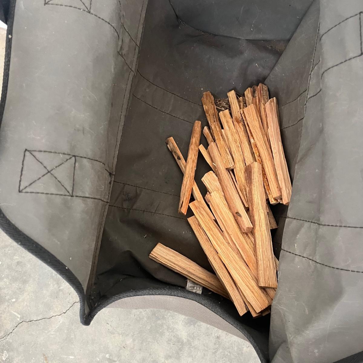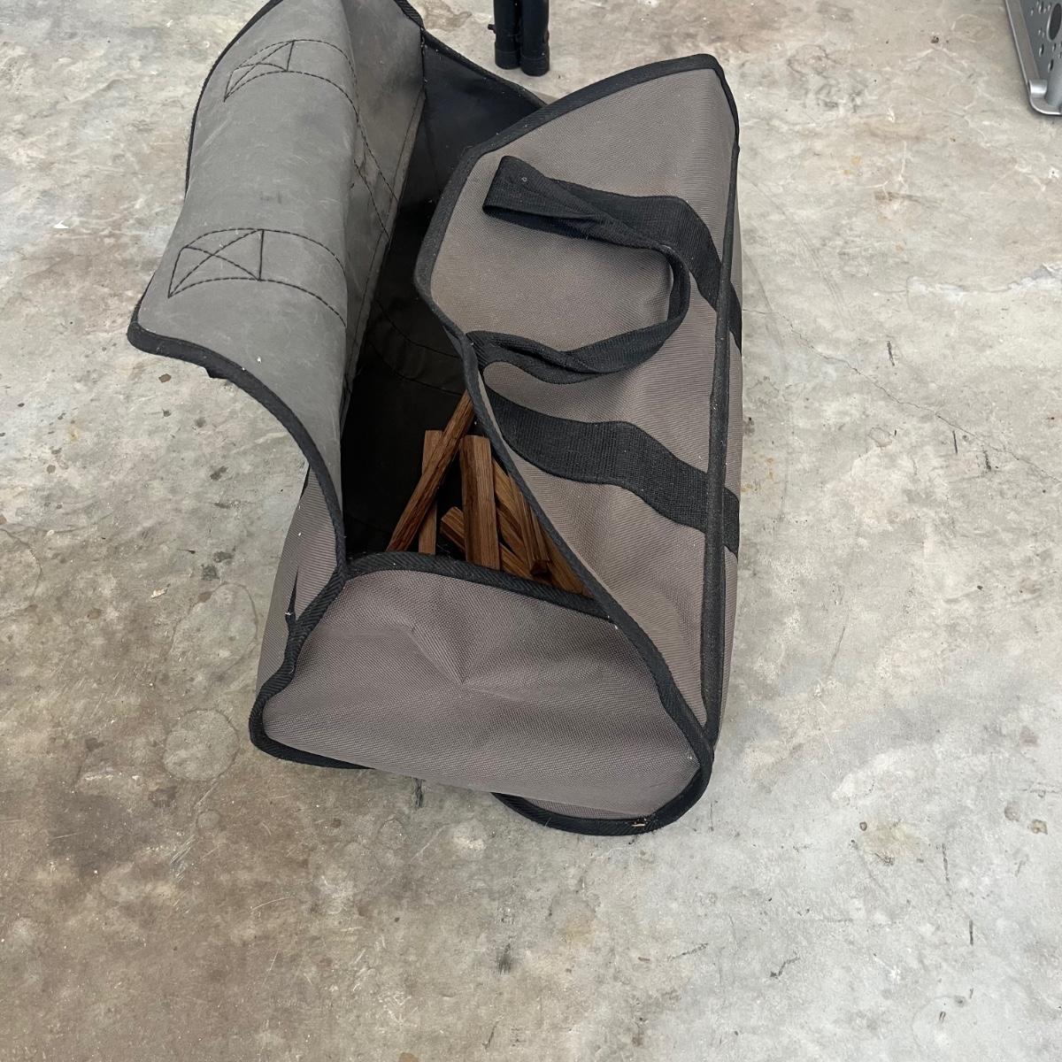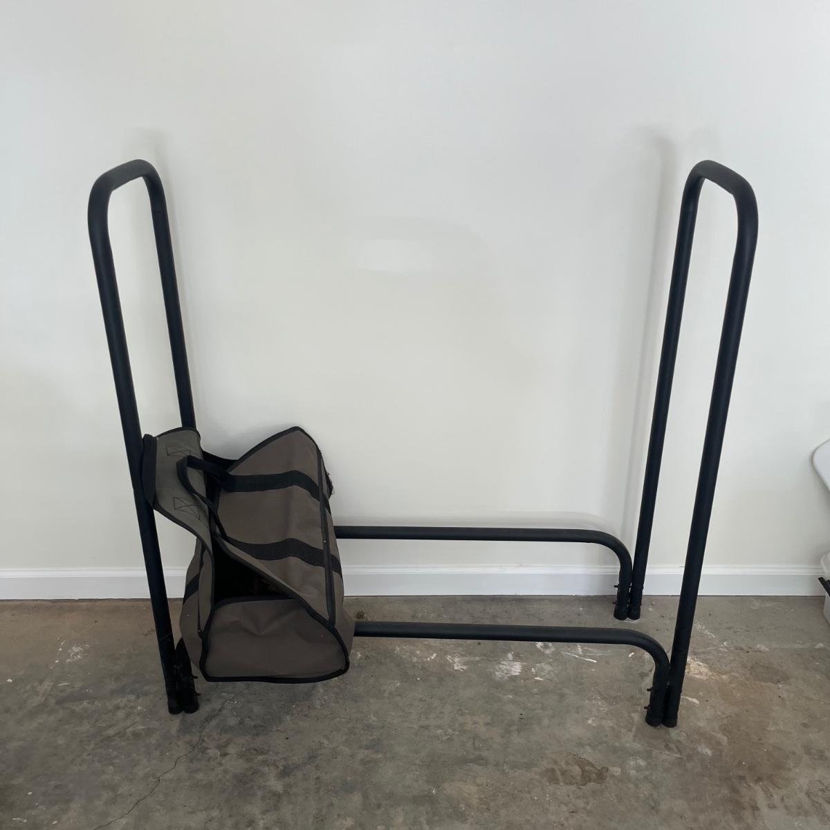 Lot includes a metal firewood stand and a canvas kindling bag. Stand measures 14” x 43” x 44”H.