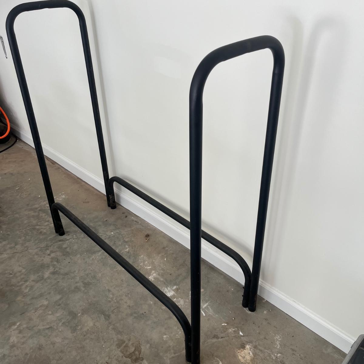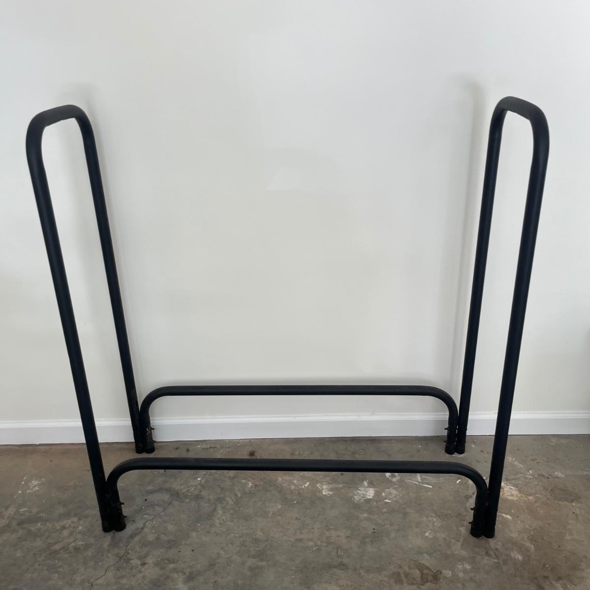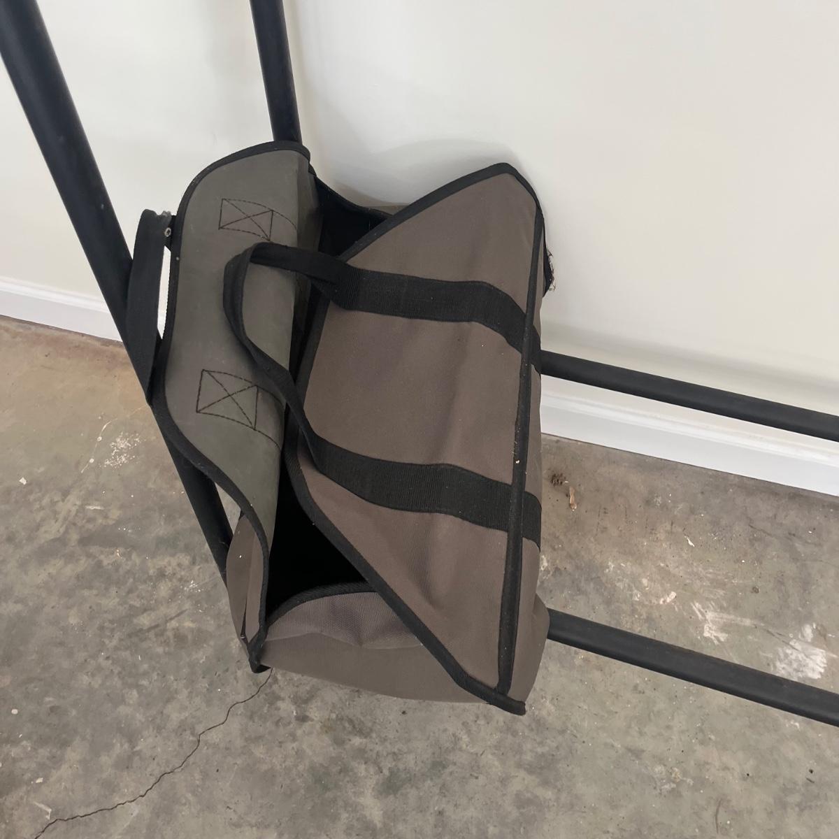Lot includes a metal firewood stand and a canvas kindling bag. Stand measures 14” x 43” x 44”H.