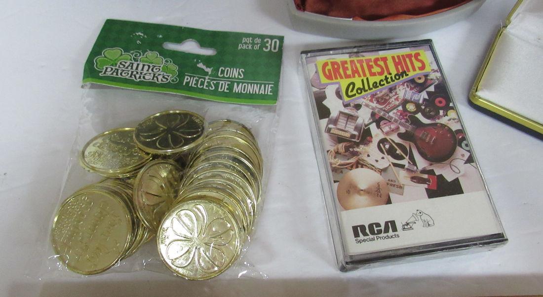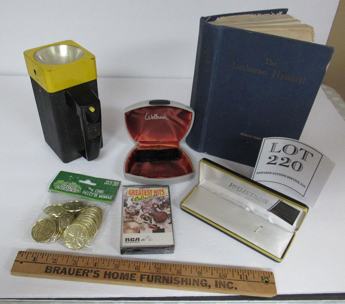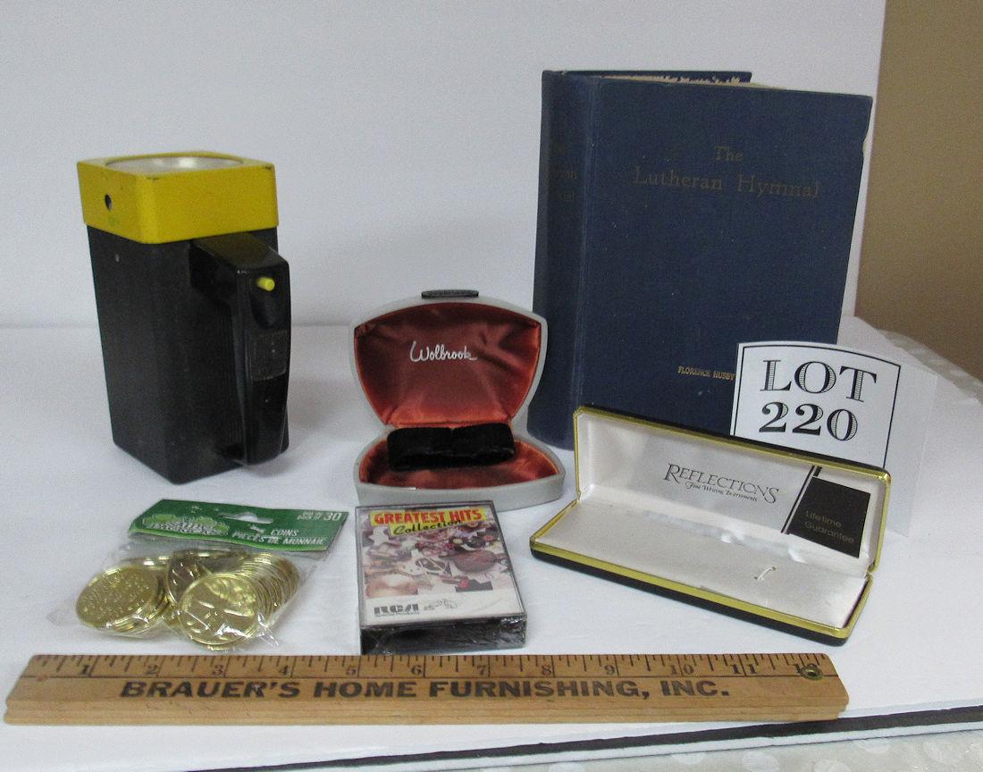 Metal Flash Light, 1941 Lutheran Hymnal, Toy Gold Coins, 2 Empty Cases, Cassette Tape
