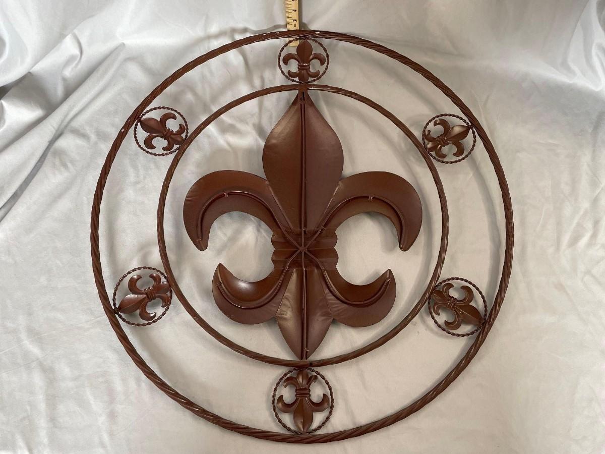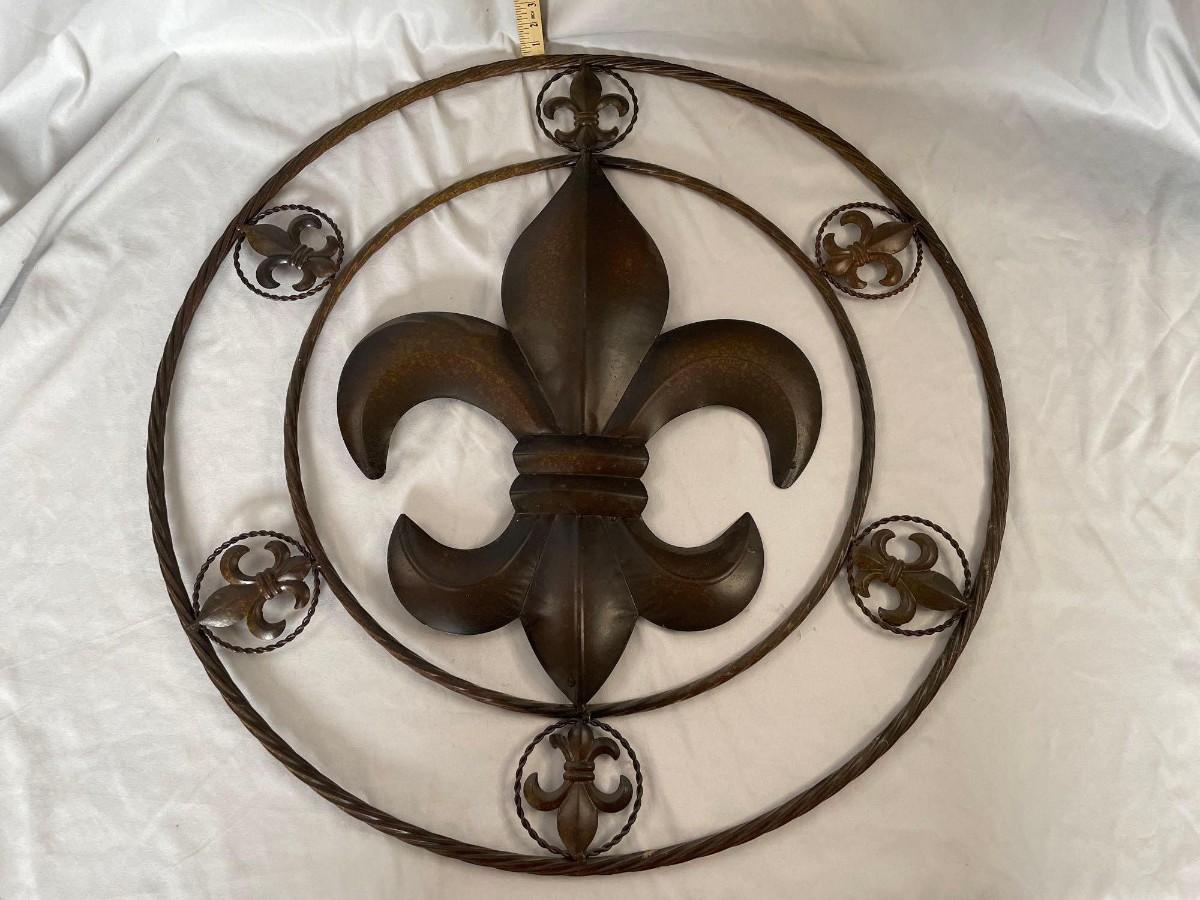This piece is in excellent condition and ready to grace your walls. It is about 26 inches in diameter. This will not be shipped.   Most know the Fleur de Lis as a symbol of New Orleans or Louisiana, but did you know that the lily was said to have sprung from the tears shed by Eve as she left Eden and was a symbol of purity. In later times, the mid 1700s, French Candians used it as a symbol of resistance and resilience. The original fleur-de-lis traces its origin back to the hieroglyphs for “plant” meaning “Tree of Life”. In ancient Egypt, this was meant to represent Life and Resurrection. Now you know!<br />