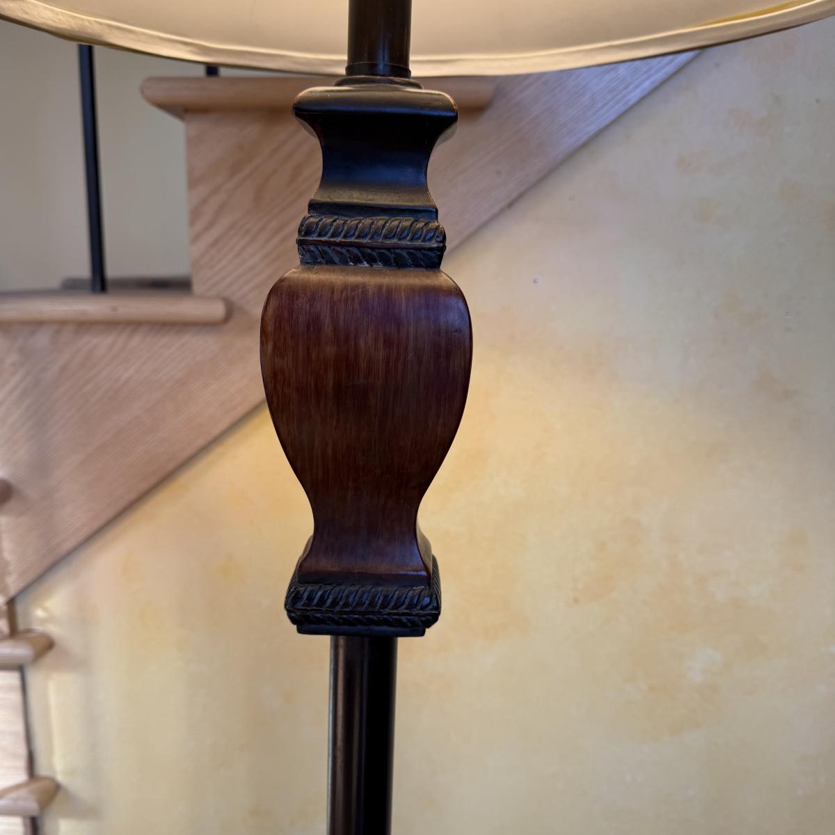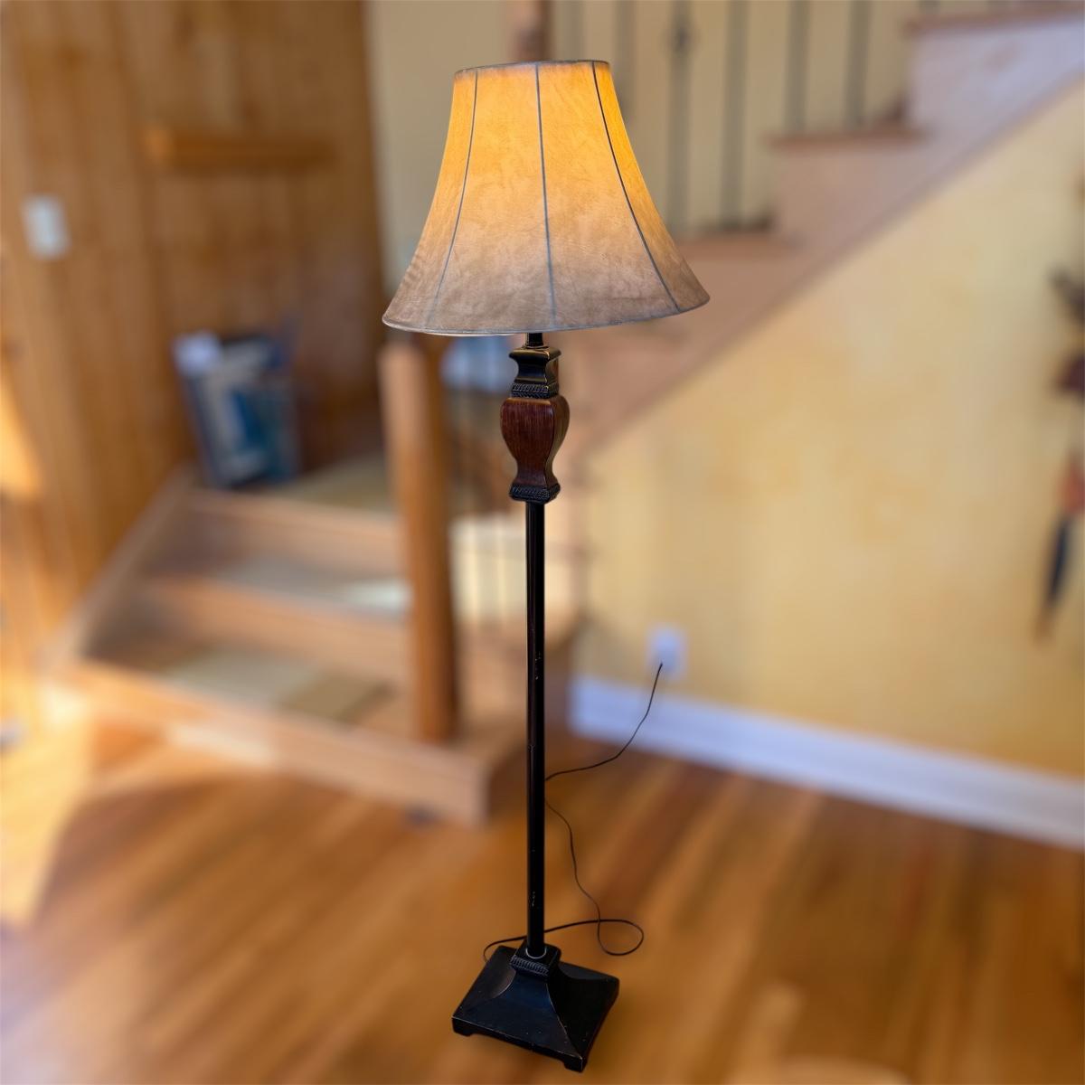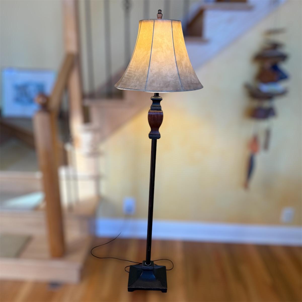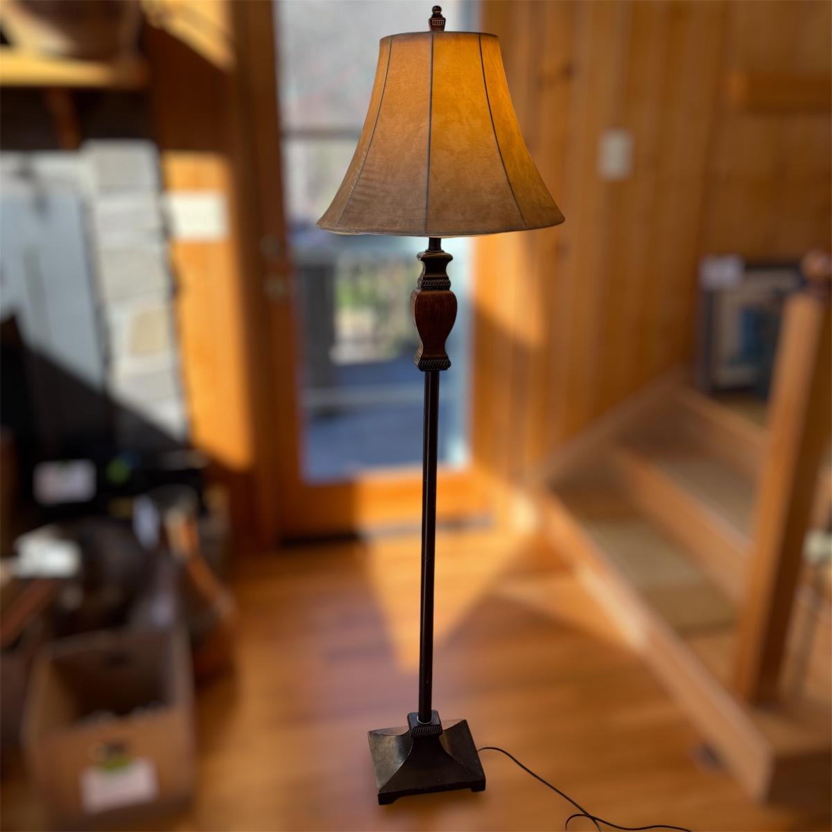 This lot contains a metal floor lamp with a lovely faux wood accent. This is a three switch lamp and does power on. The base measures 9.75” x 8” and the lamp stands 62.5”H. The lampshade is a faux leather and gives off a warm glow. Local pick up only.
