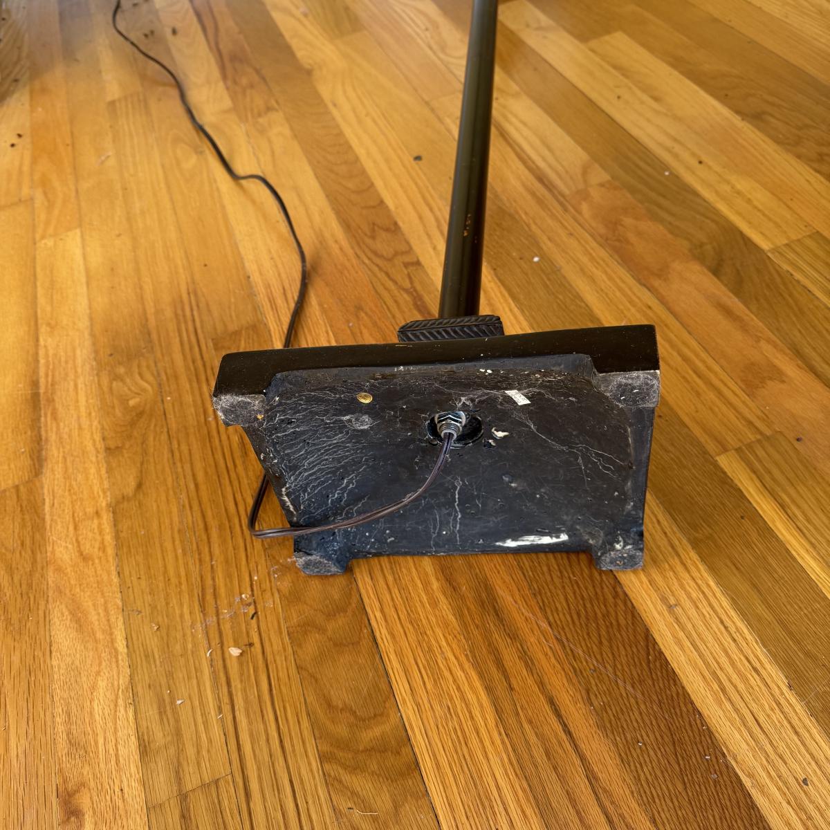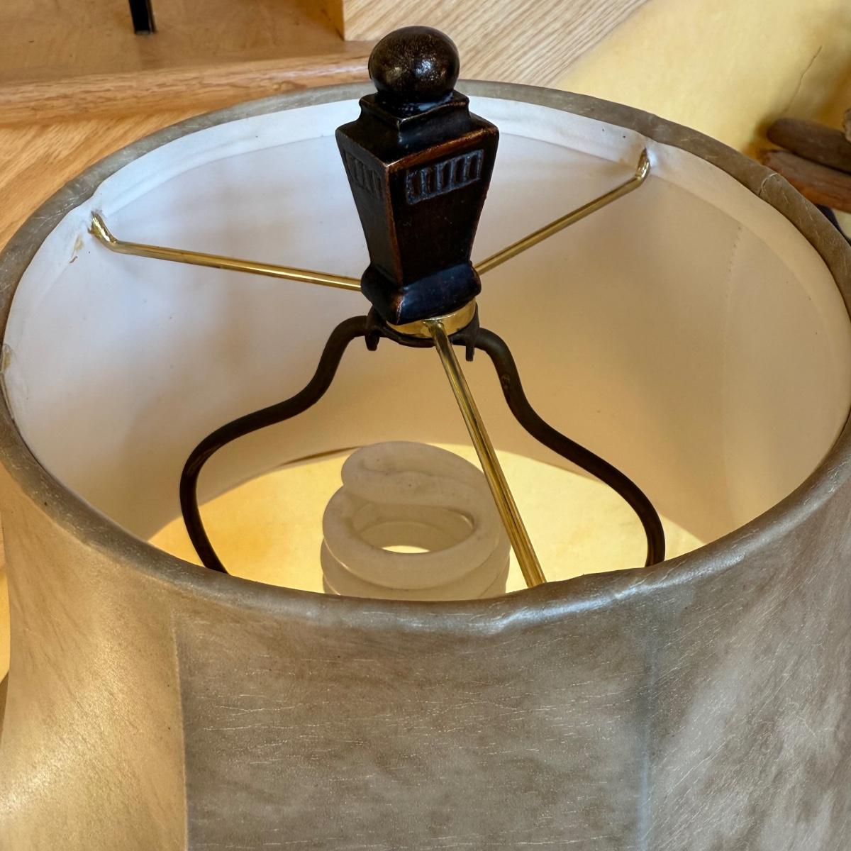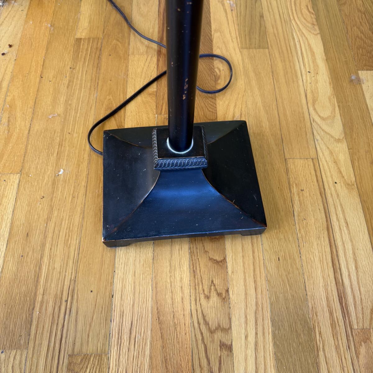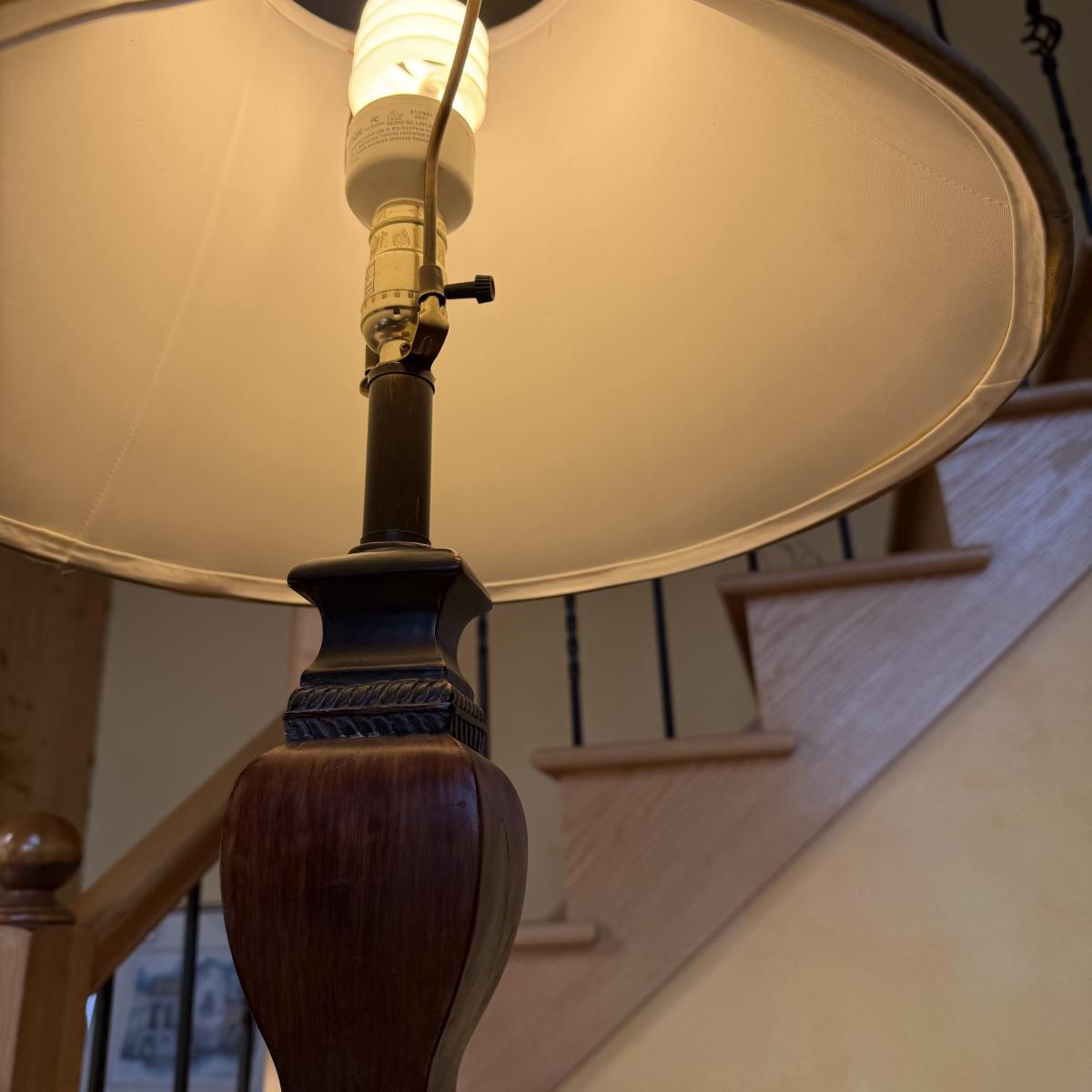 This lot contains a metal floor lamp with a lovely faux wood accent. This is a three switch lamp and does power on. The base measures 9.75” x 8” and the lamp stands 62.5”H. The lampshade is a faux leather and gives off a warm glow. Local pick up only.